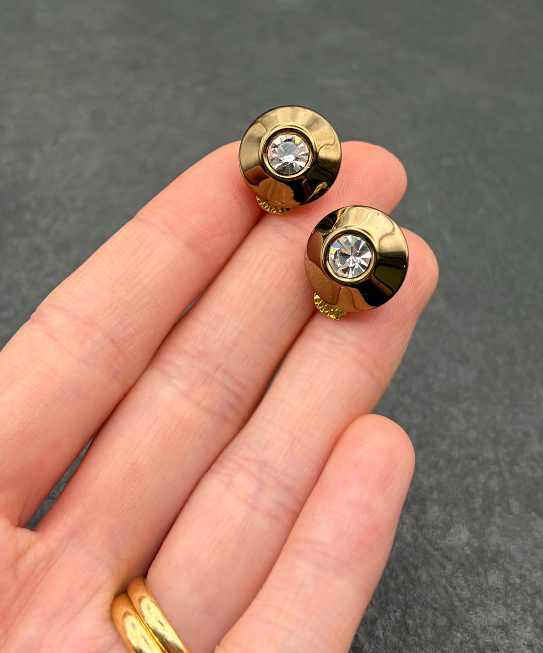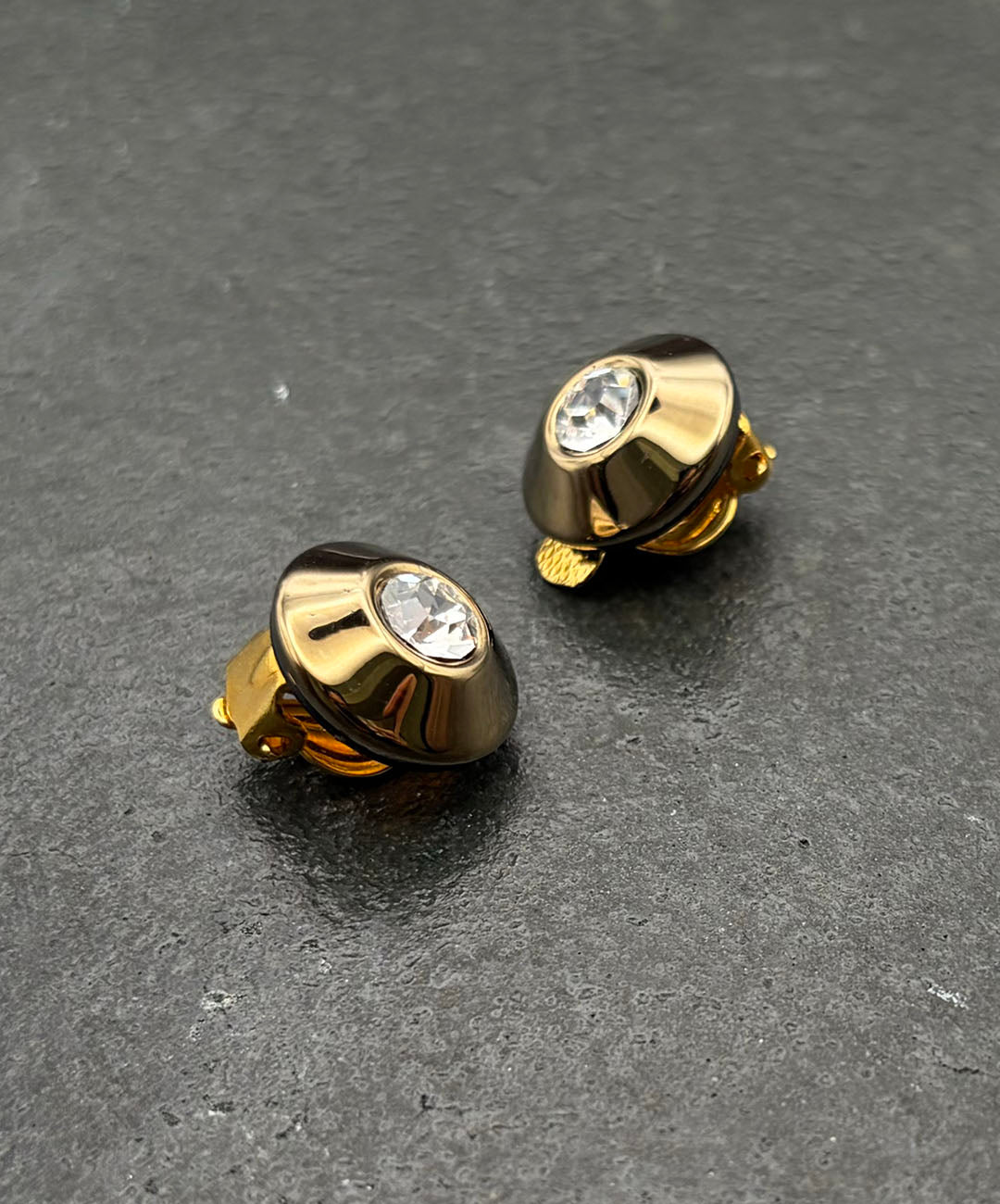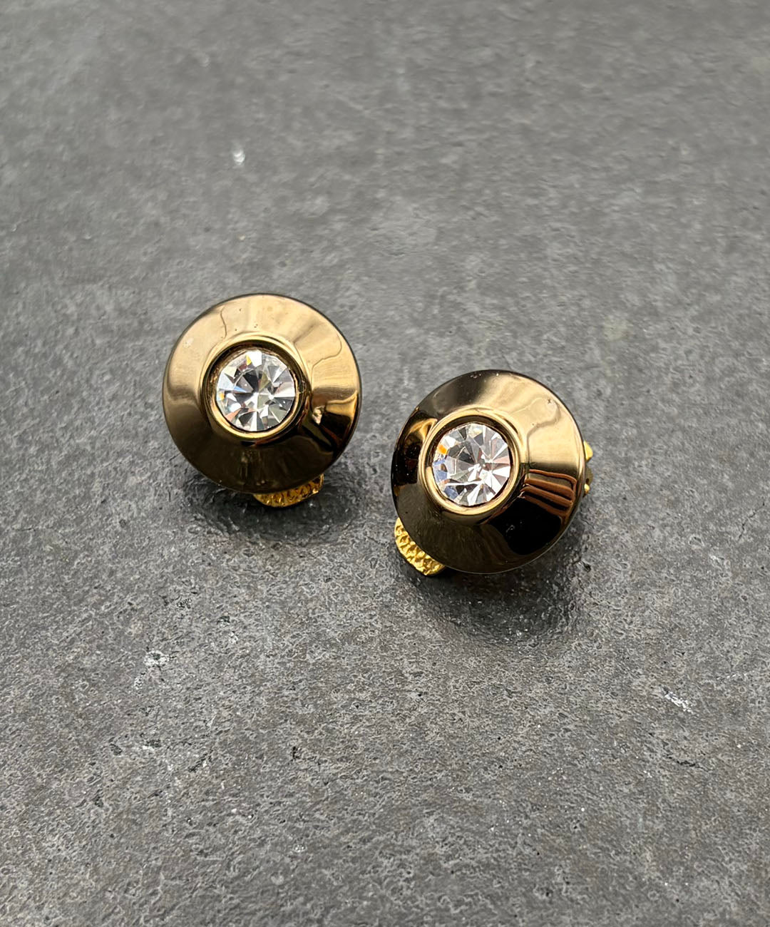 ブロンズトーンのメタルに、ラウンドカットのクリスタルが一石あしらわれたデザイン。
