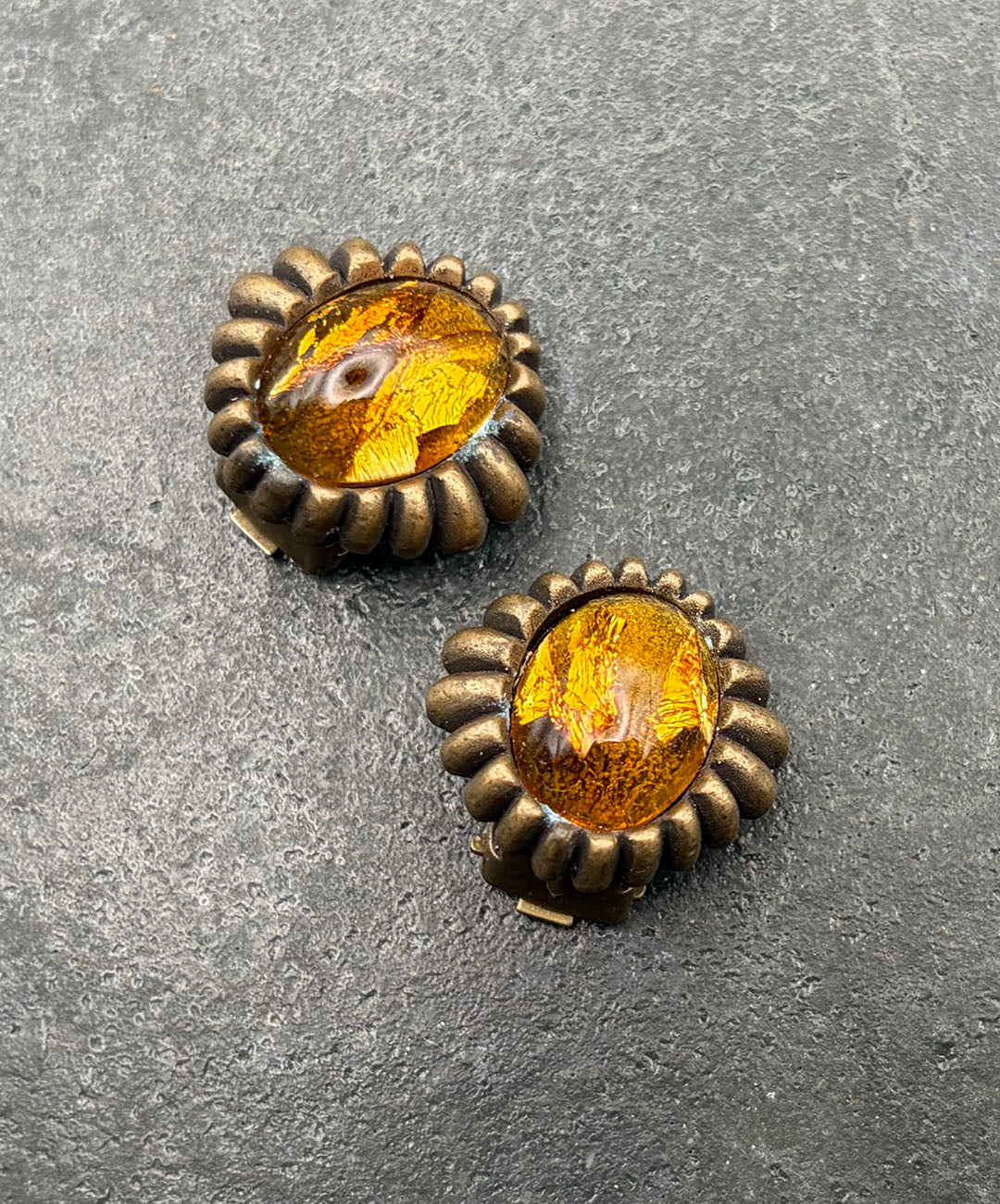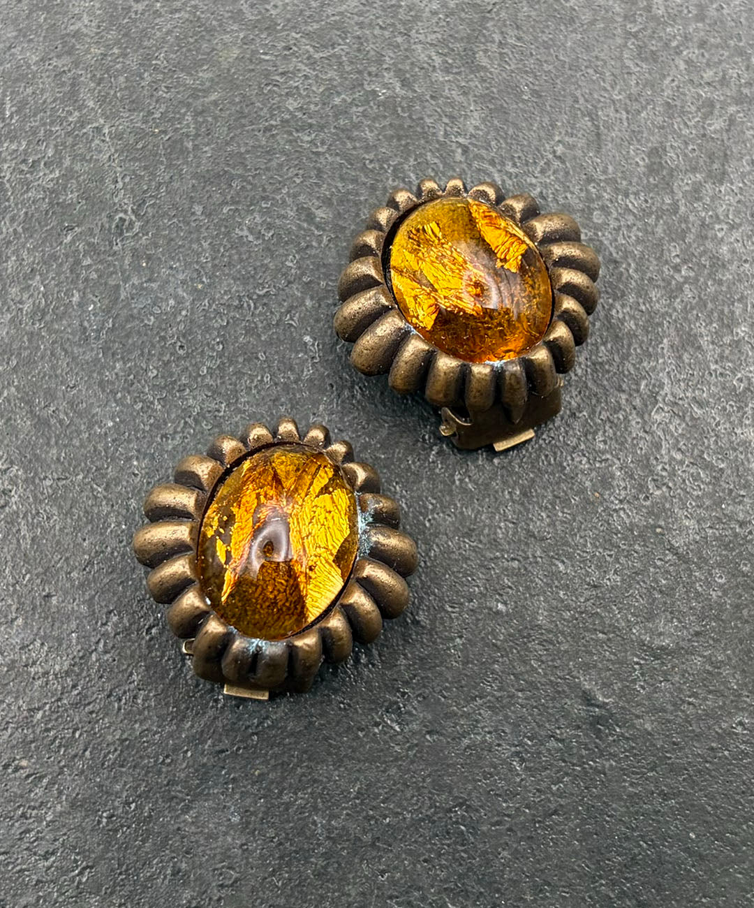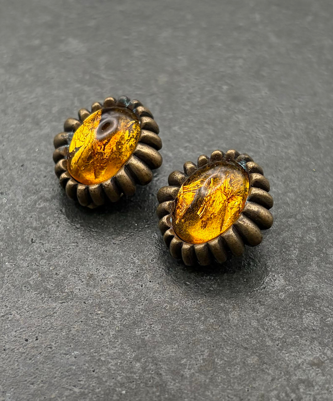 燻し加工が施されたマットなゴールドトーンメタルに、琥珀を思わせるアンバーカラーのオーバルカボションガラスがセットされています。