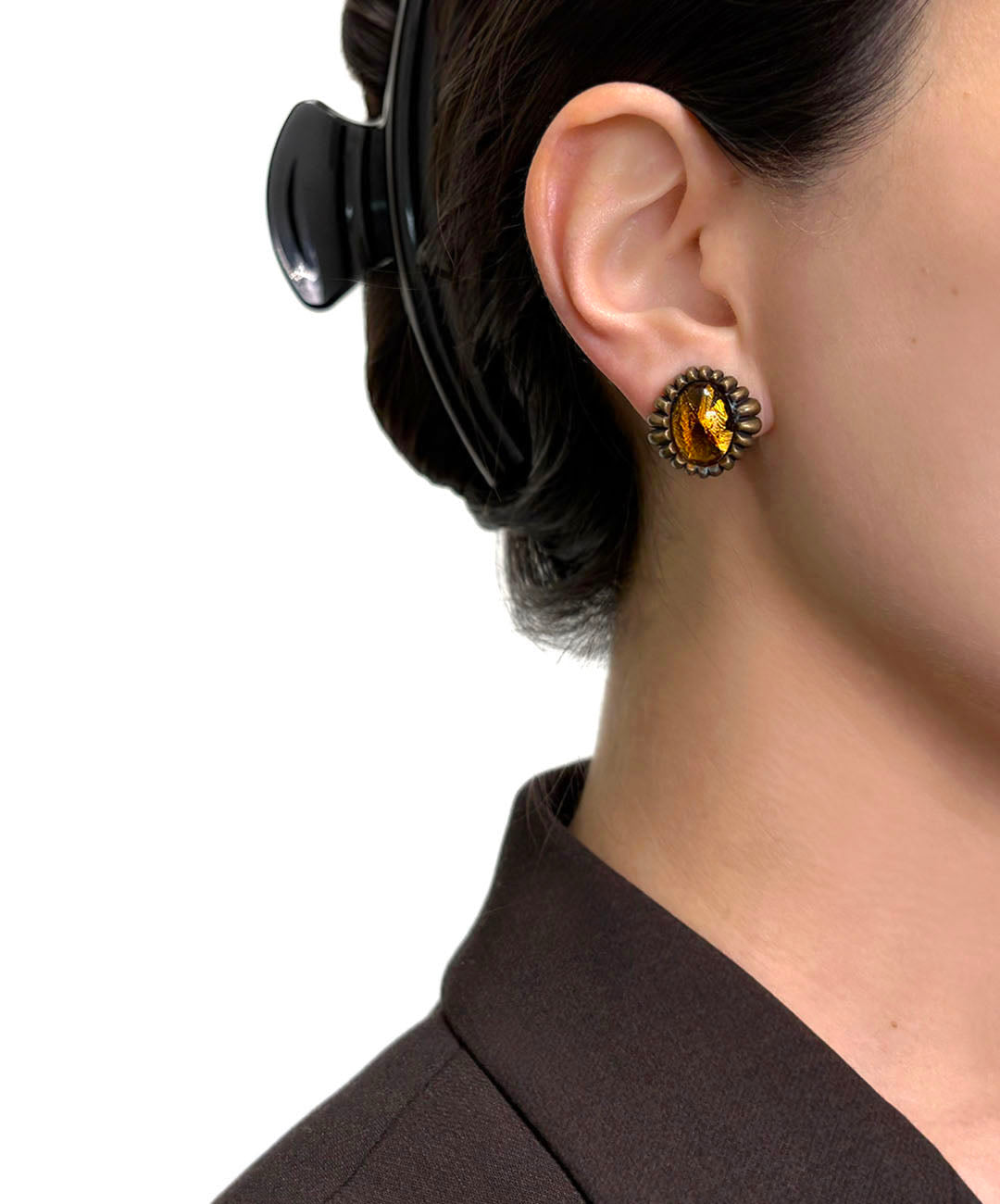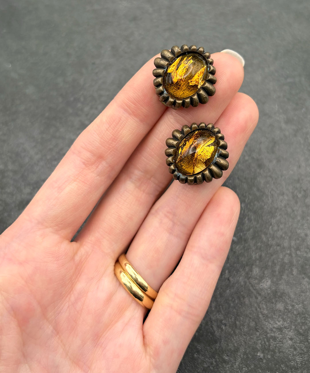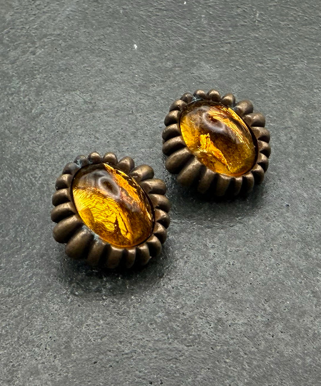 燻し加工が施されたマットなゴールドトーンメタルに、琥珀を思わせるアンバーカラーのオーバルカボションガラスがセットされています。