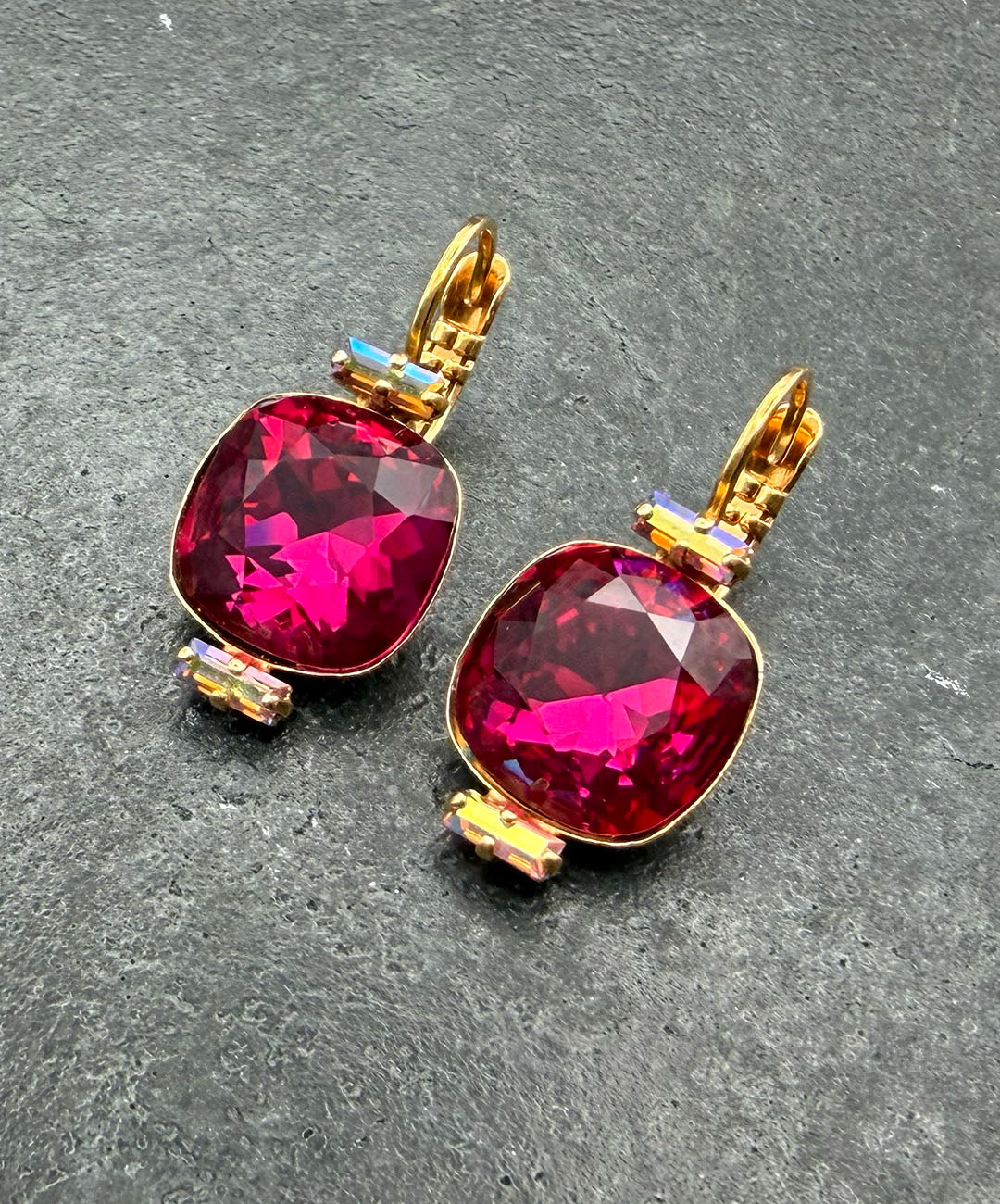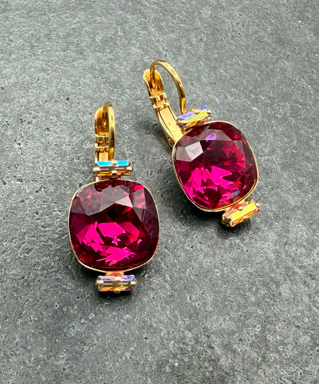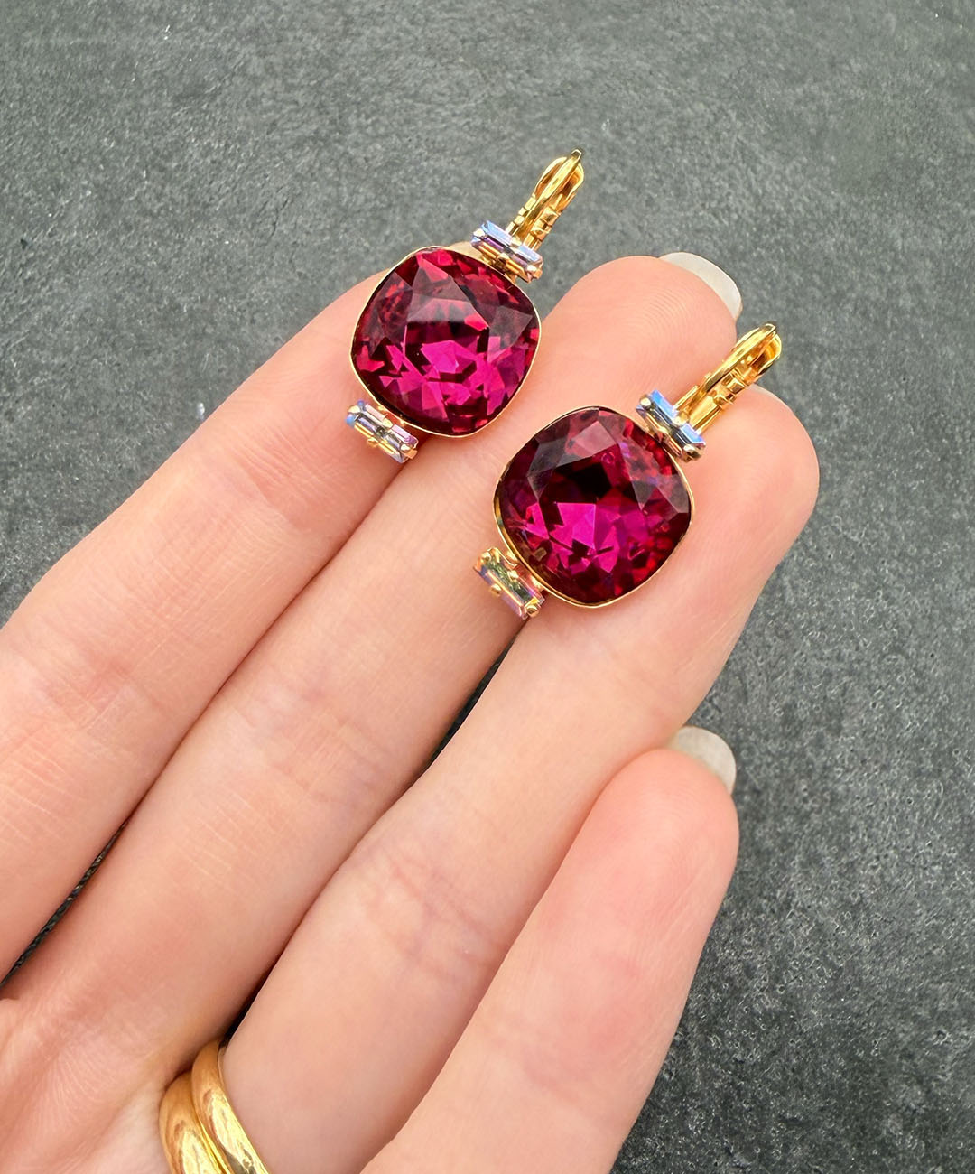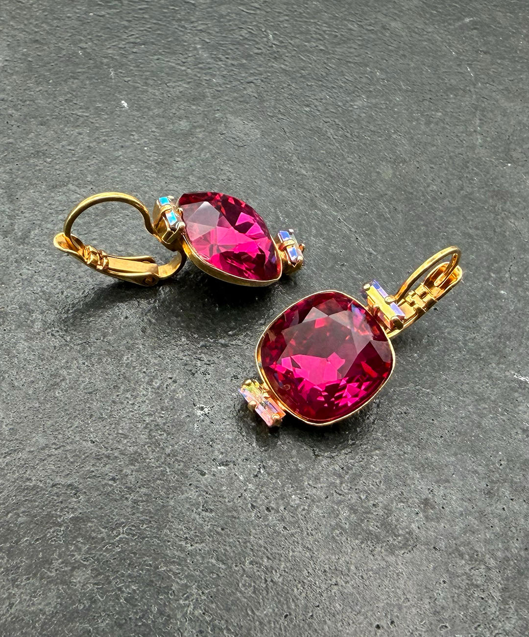マゼンタローズの大粒クッションカットガラスの上下に、爪留めされたバゲットカットのオーロラストーンが添えられたデザイン。