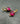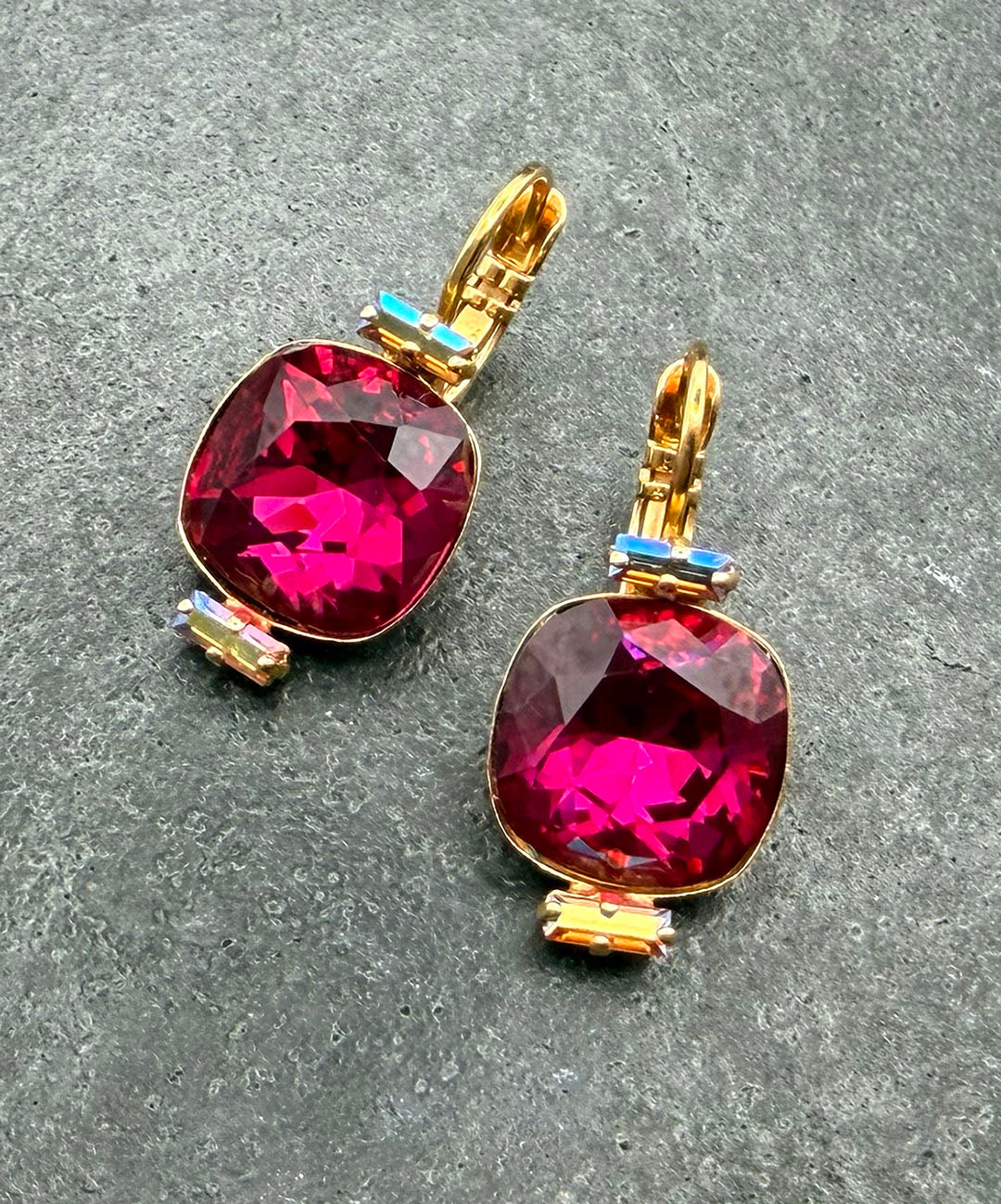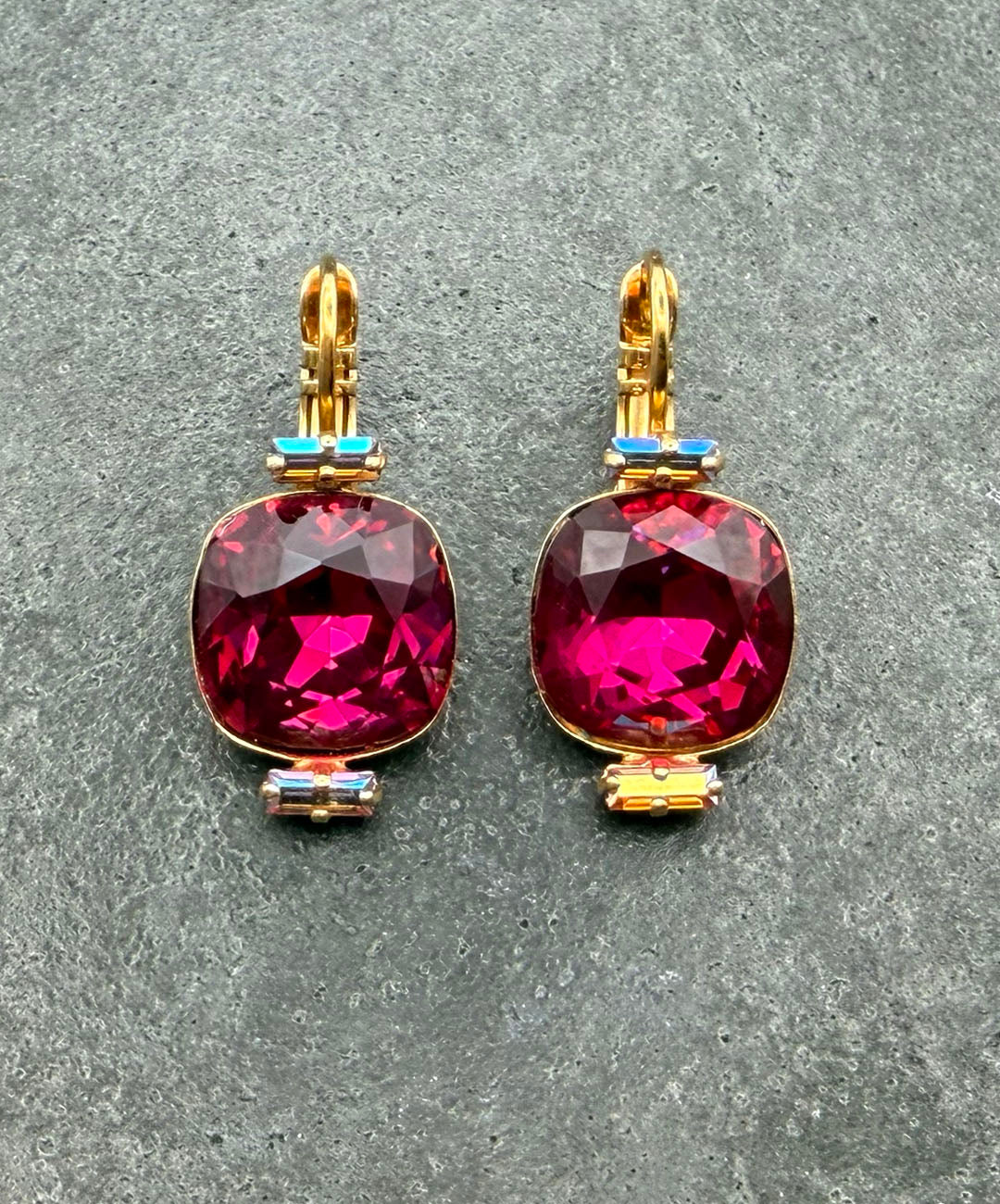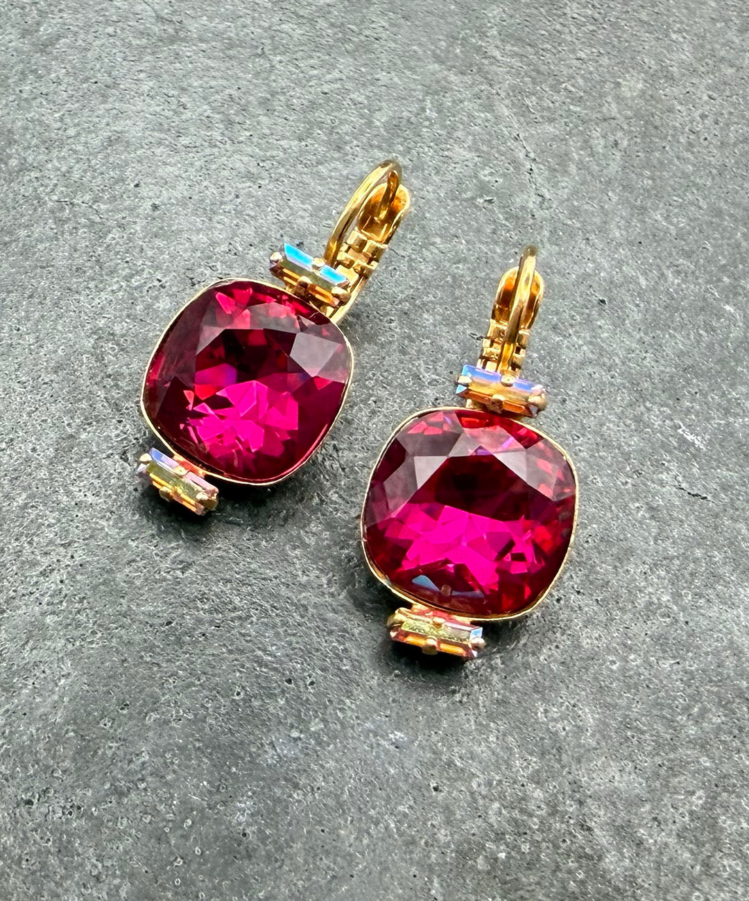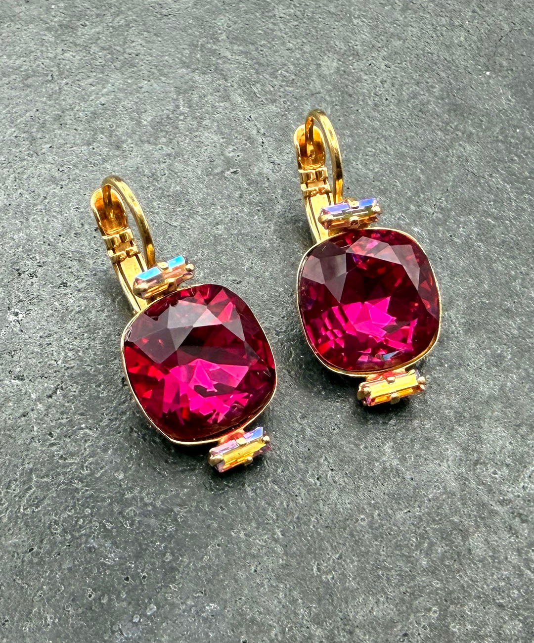 マゼンタローズの大粒クッションカットガラスの上下に、爪留めされたバゲットカットのオーロラストーンが添えられたデザイン。