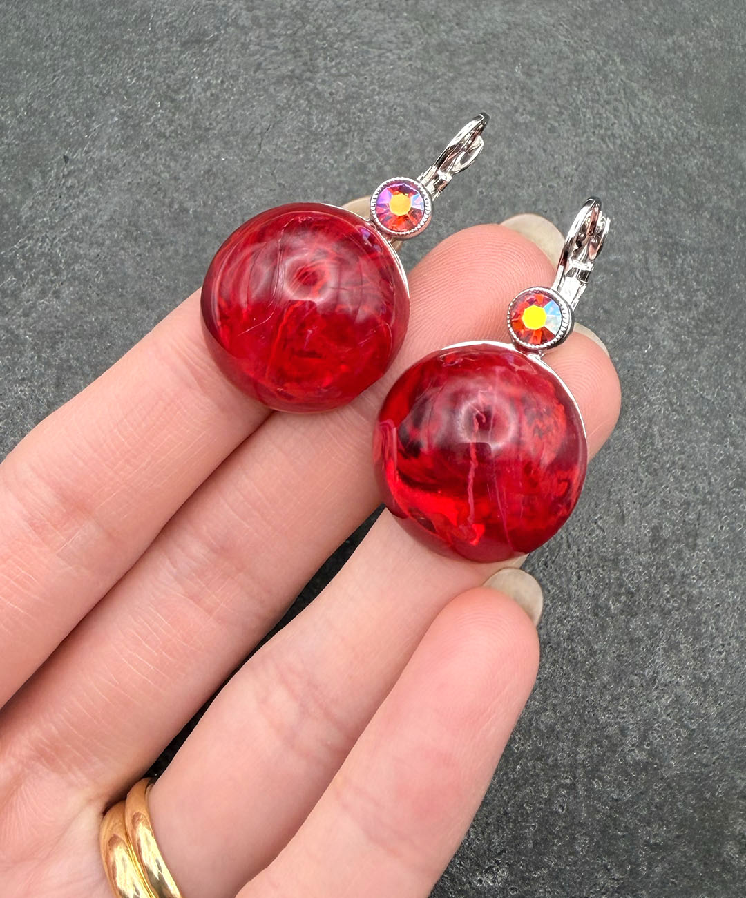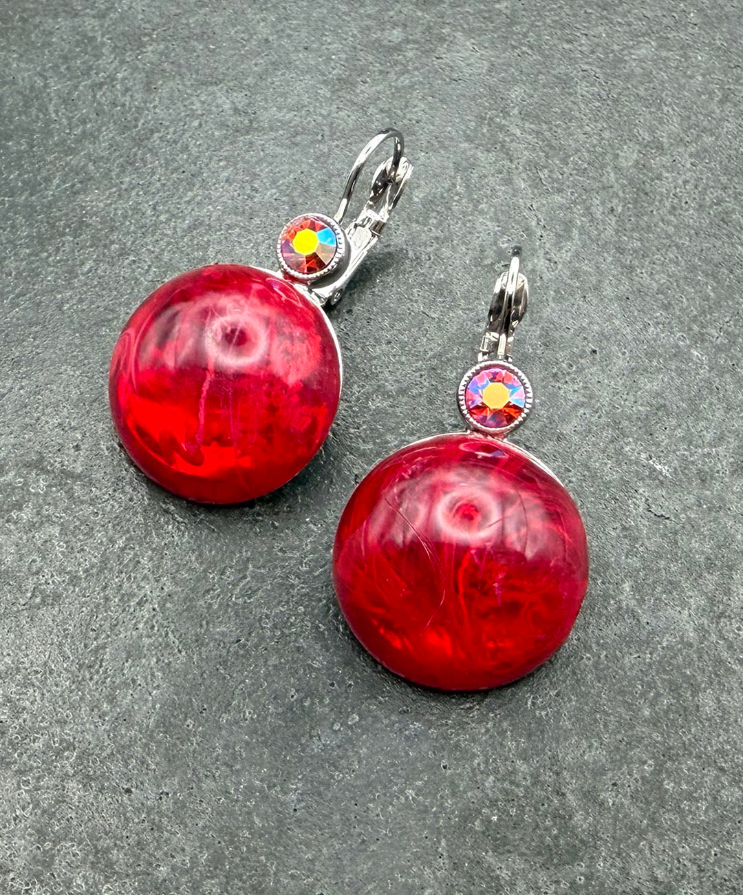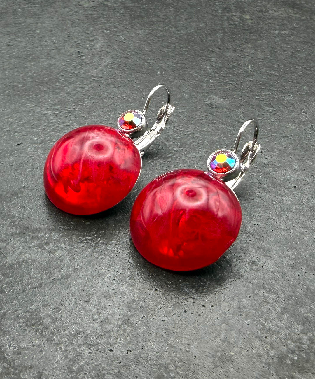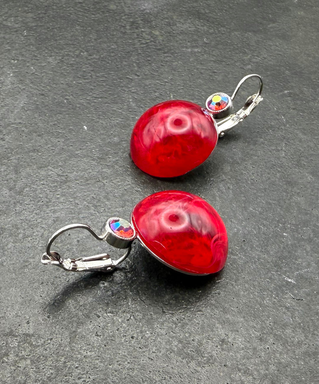 シルバートーンメタルに、クランベリーカラーのラウンドカボションガラス、レッドベースのオーロラストーンがセットされています。