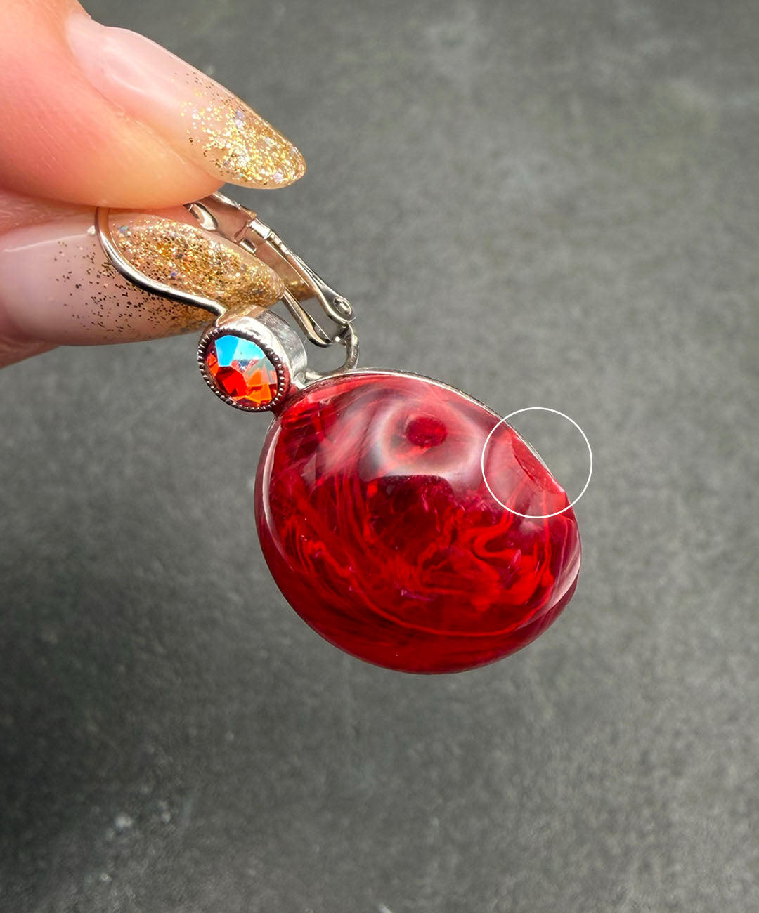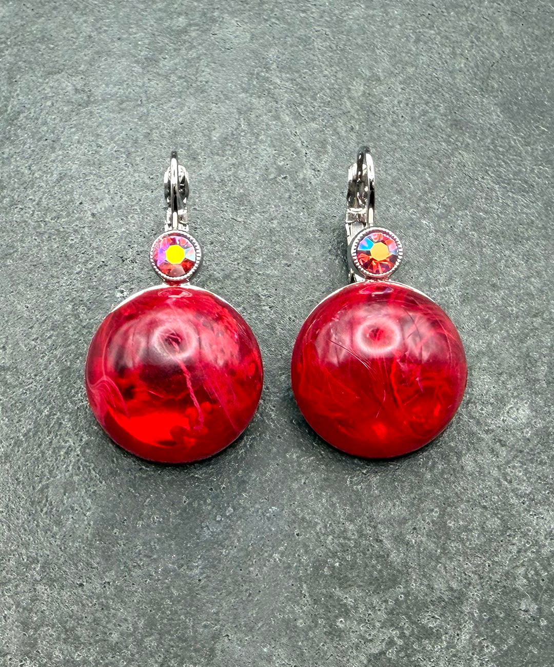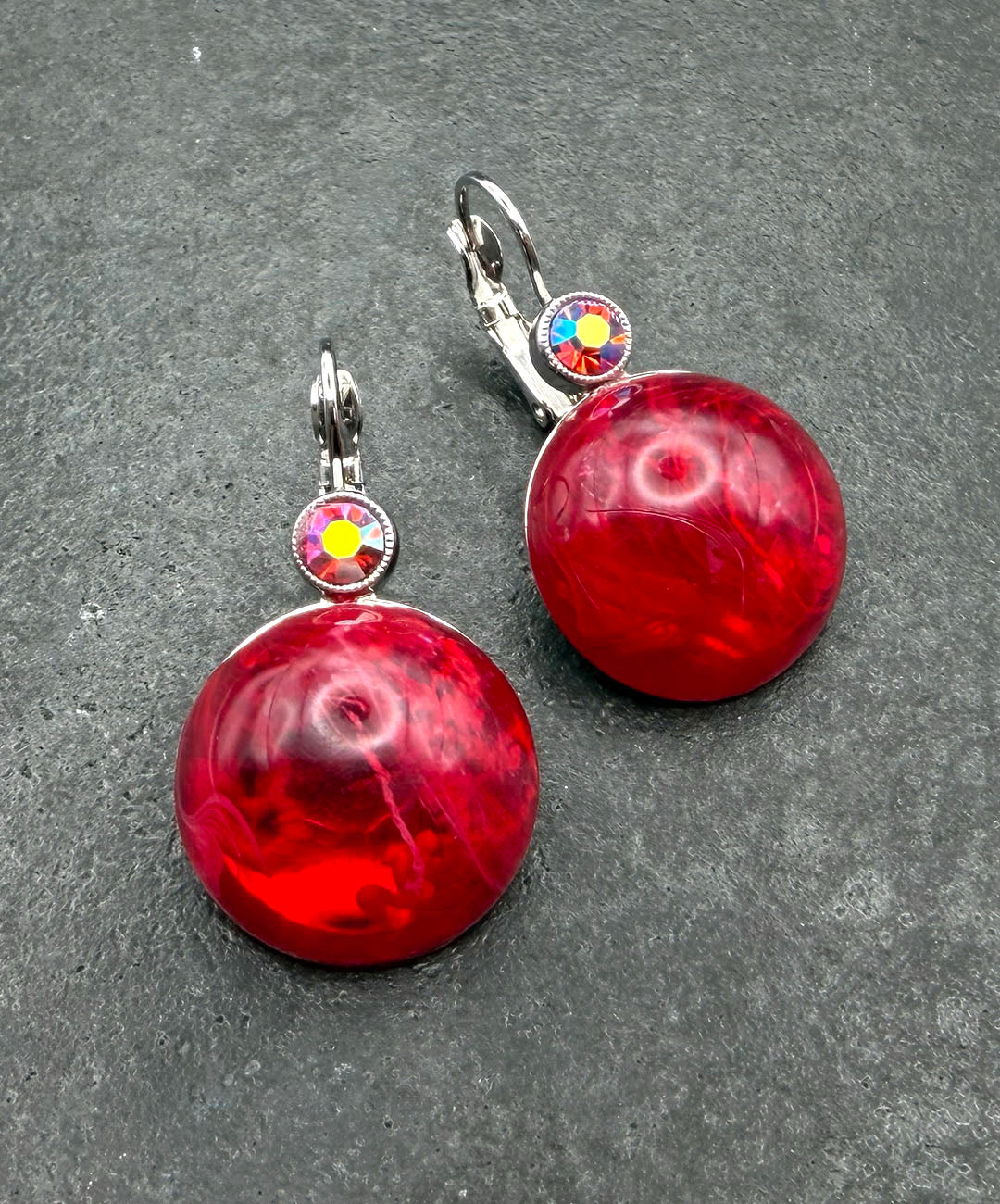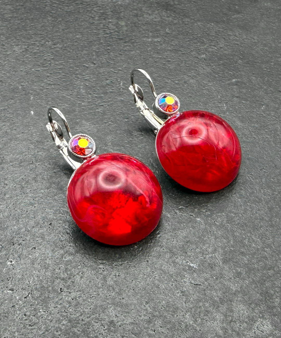 シルバートーンメタルに、クランベリーカラーのラウンドカボションガラス、レッドベースのオーロラストーンがセットされています。