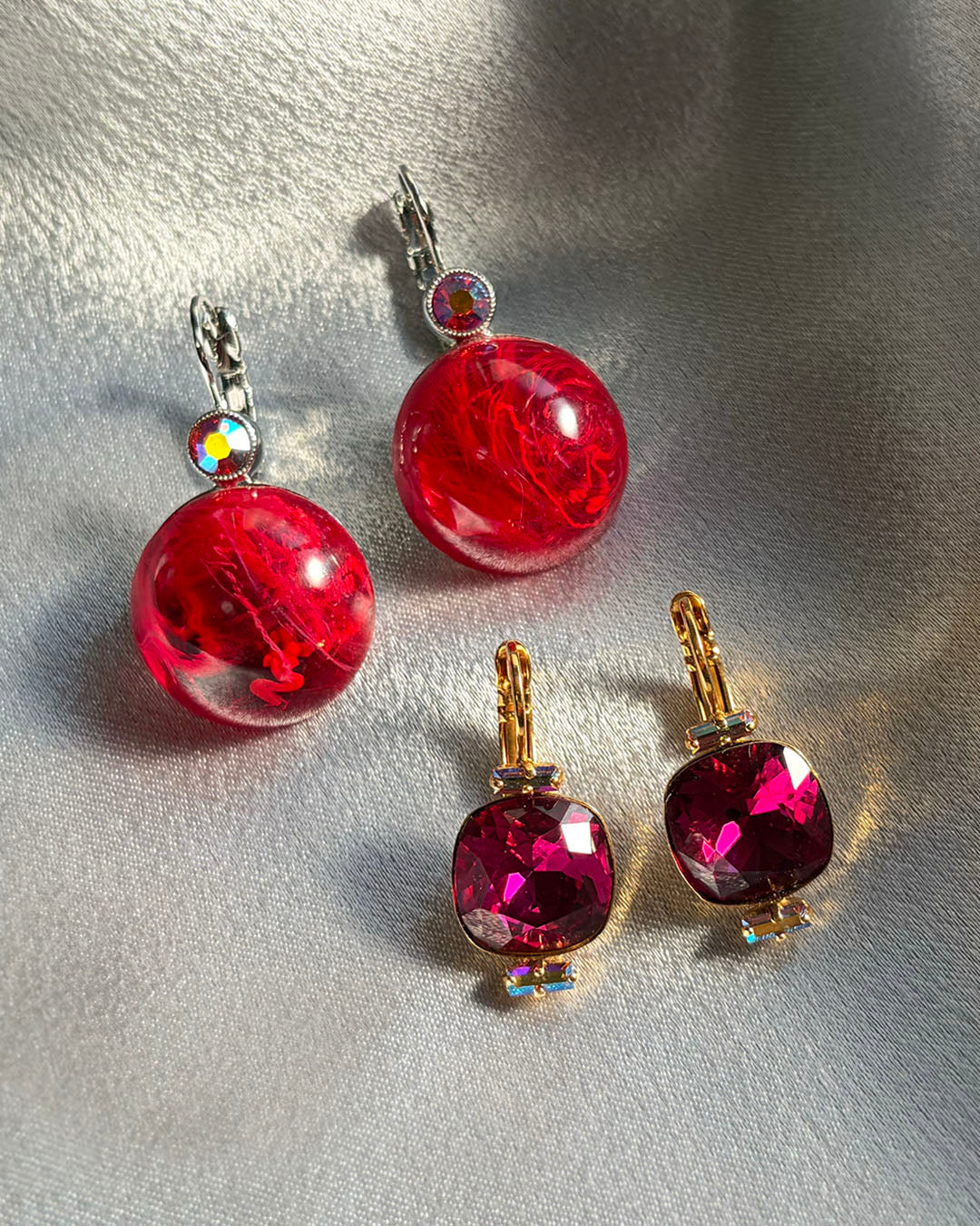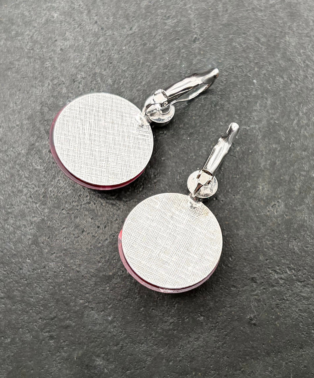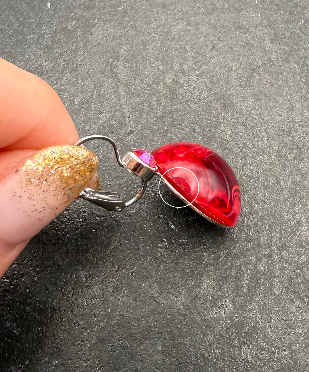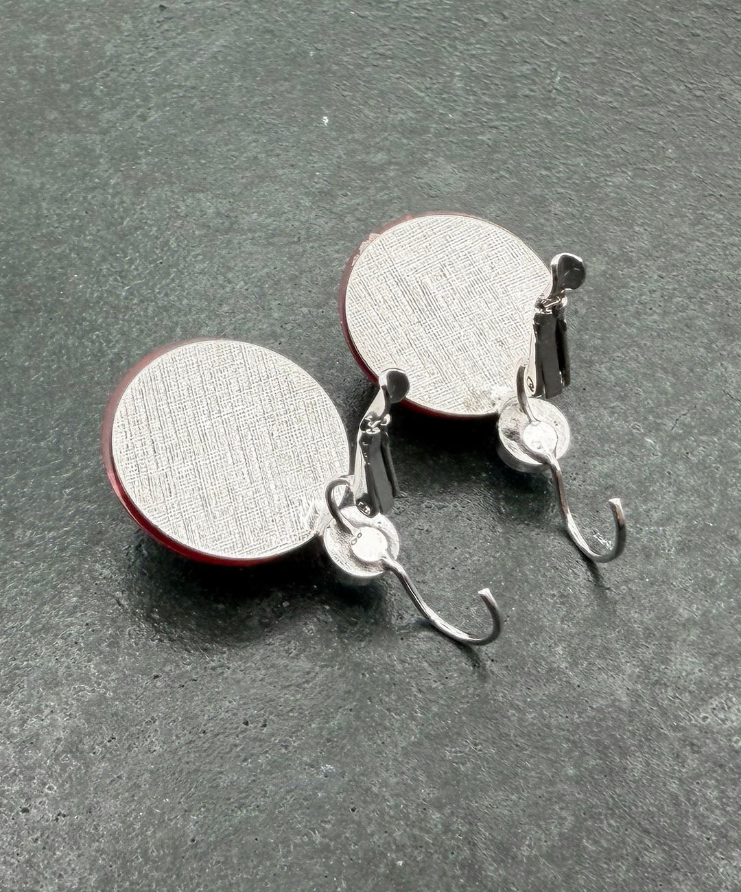 シルバートーンメタルに、クランベリーカラーのラウンドカボションガラス、レッドベースのオーロラストーンがセットされています。