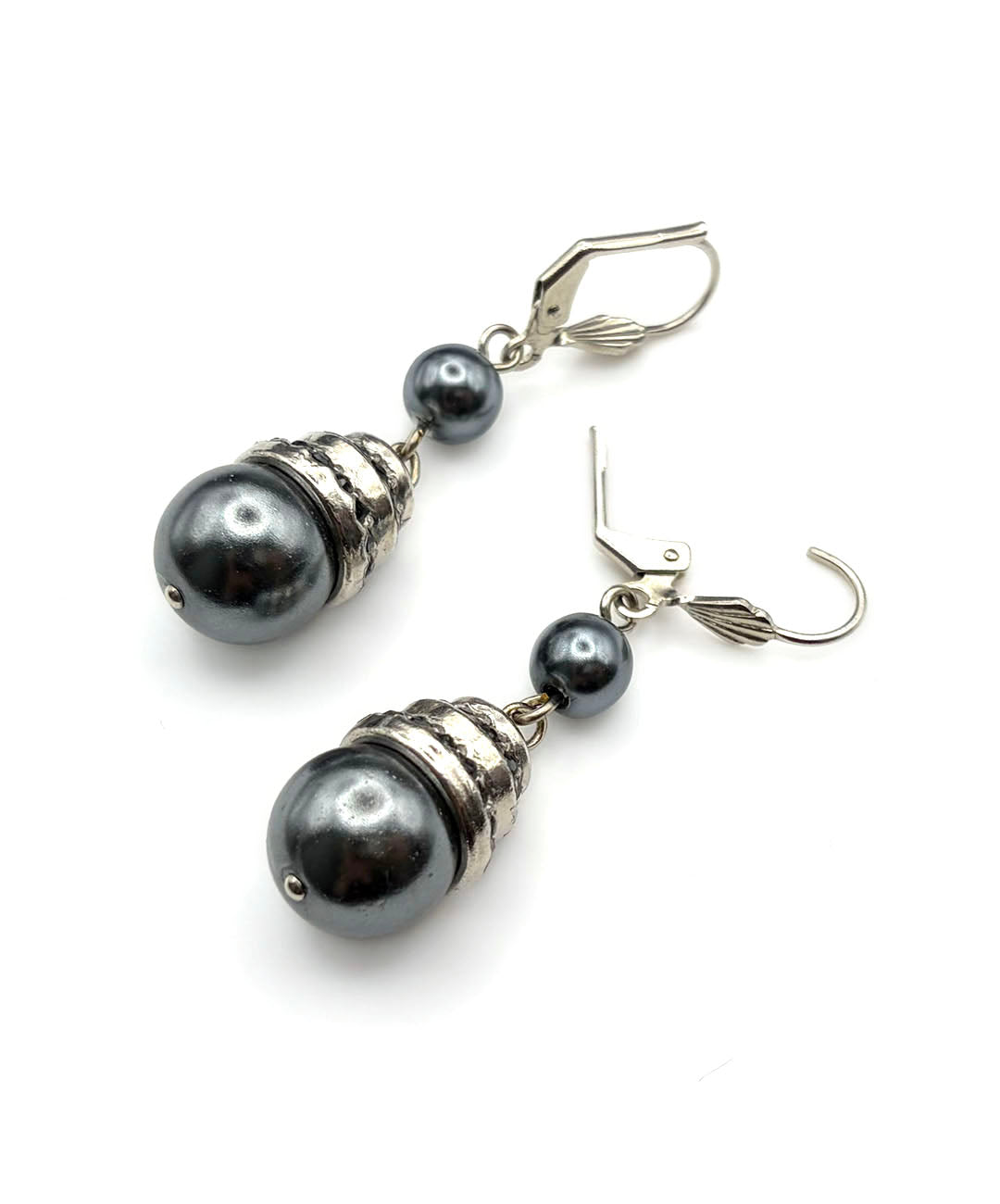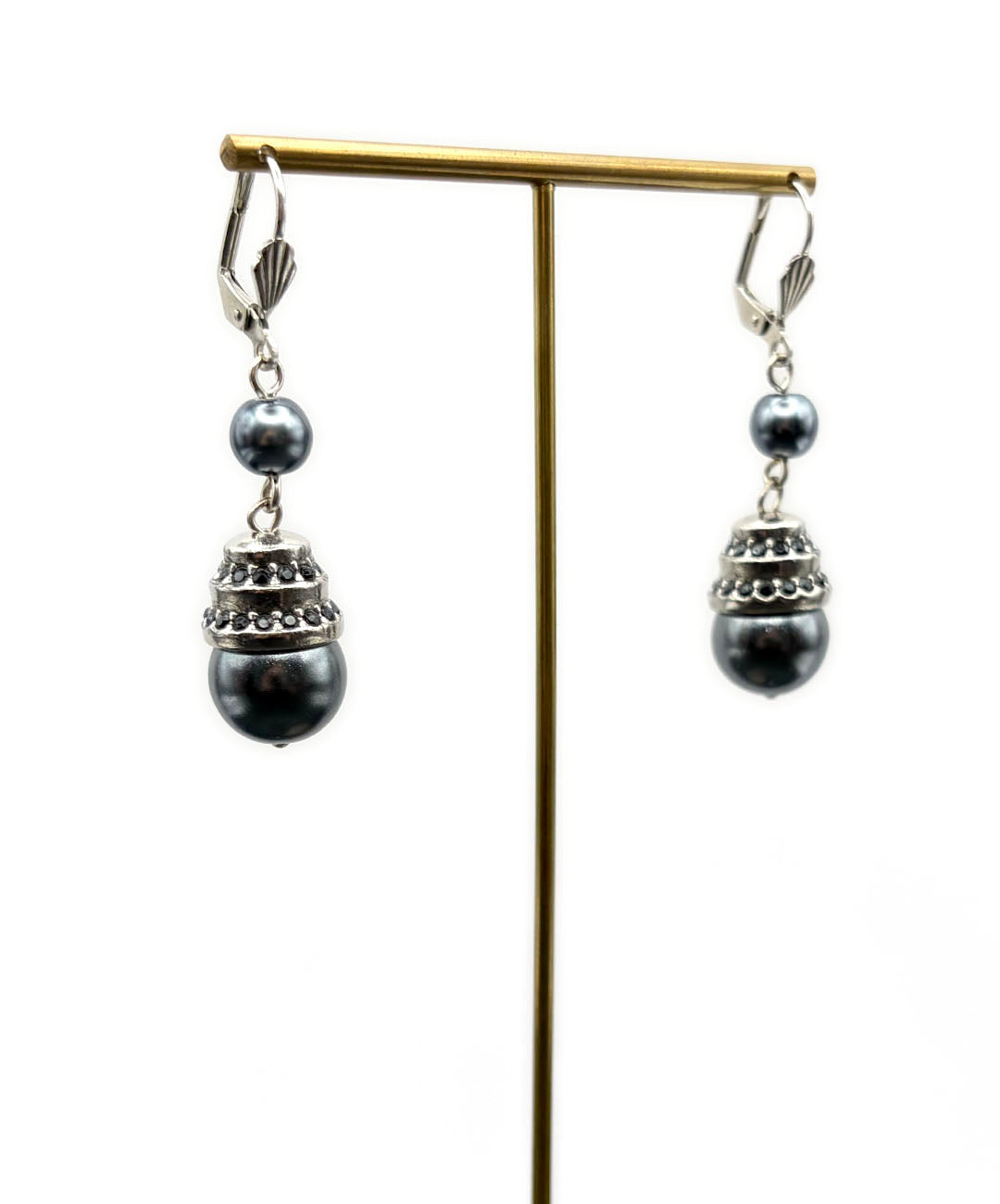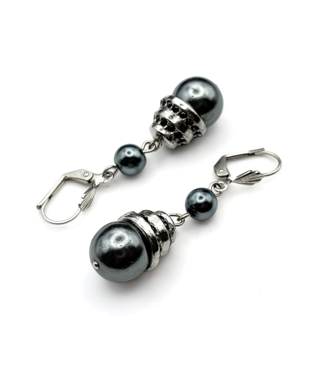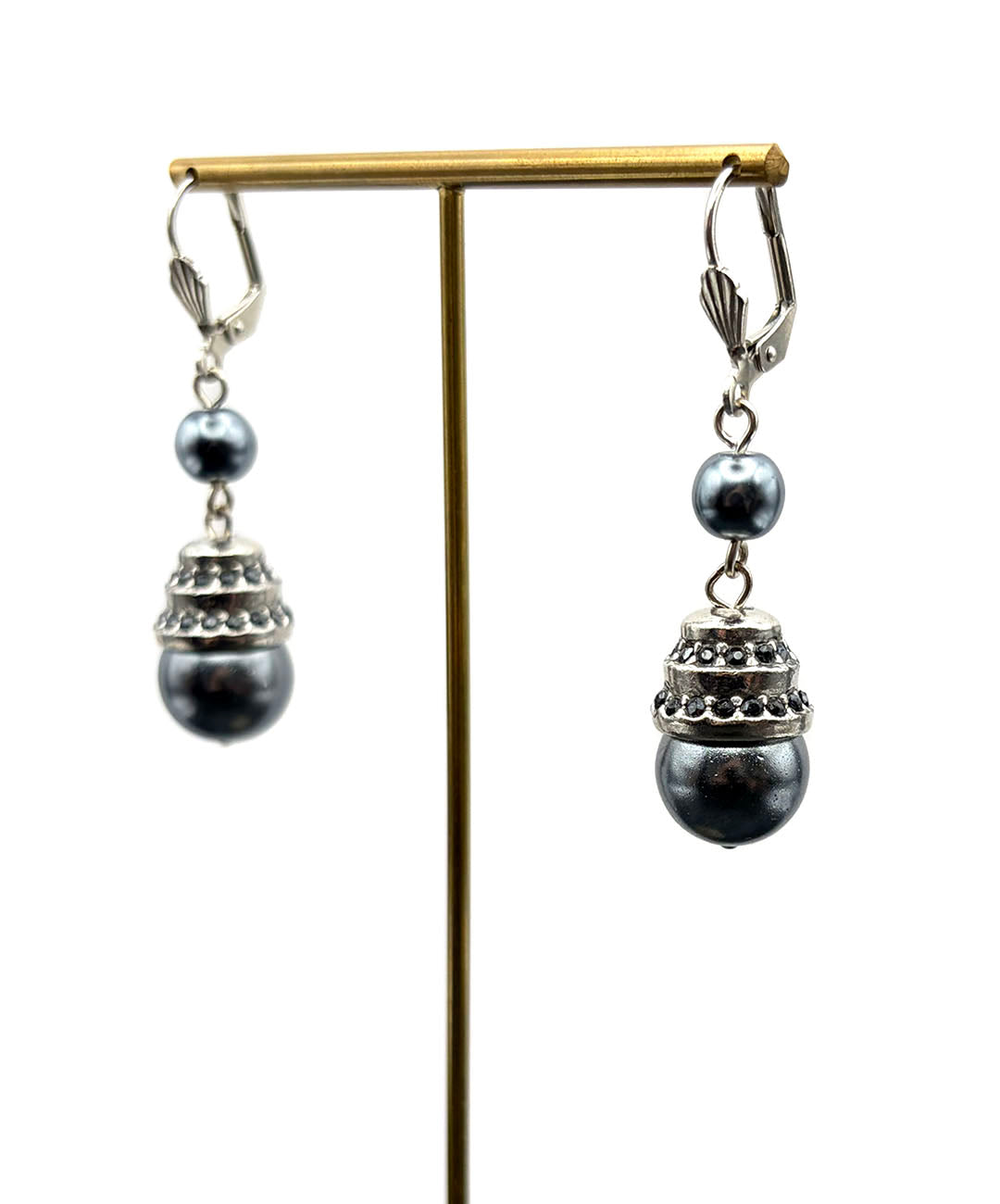 シルバートーンメタルに、小粒のグレーパール、ガンメタルブラックのストーン装飾が施された大粒グレーパールがセットされて揺らめきます。