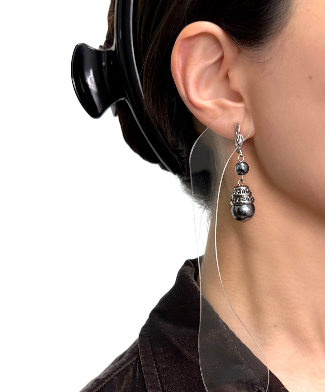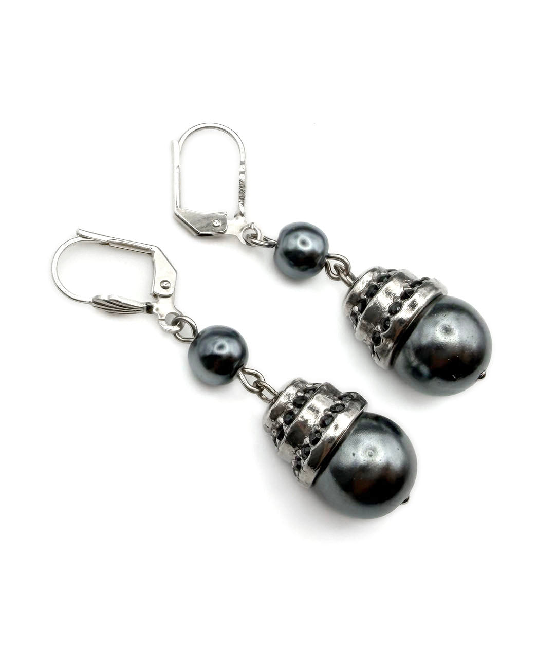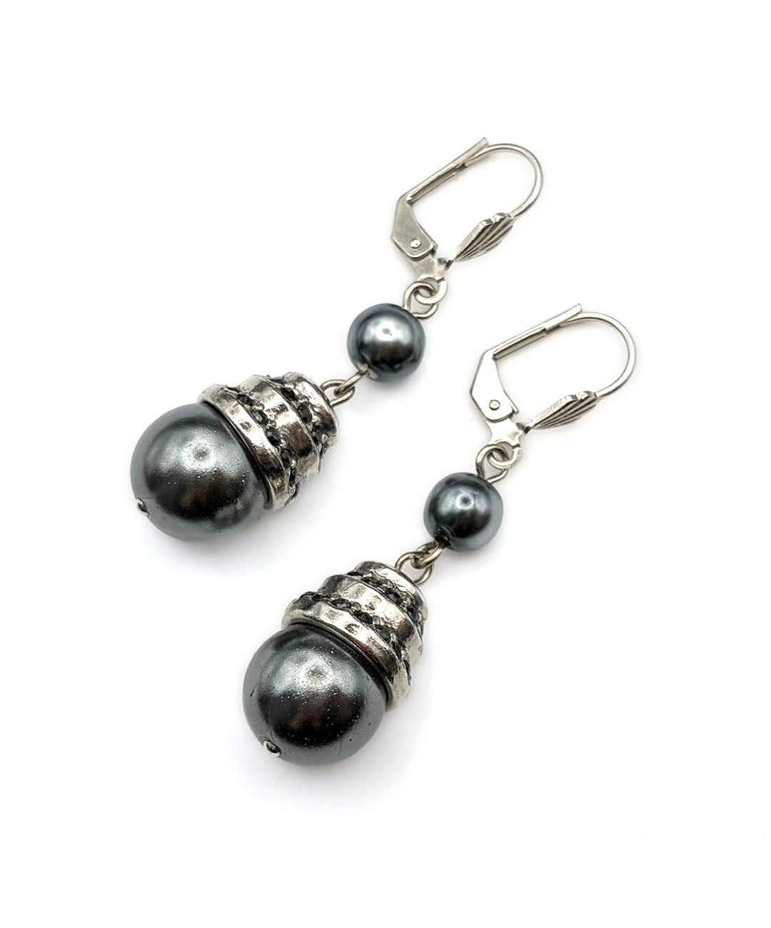 シルバートーンメタルに、小粒のグレーパール、ガンメタルブラックのストーン装飾が施された大粒グレーパールがセットされて揺らめきます。