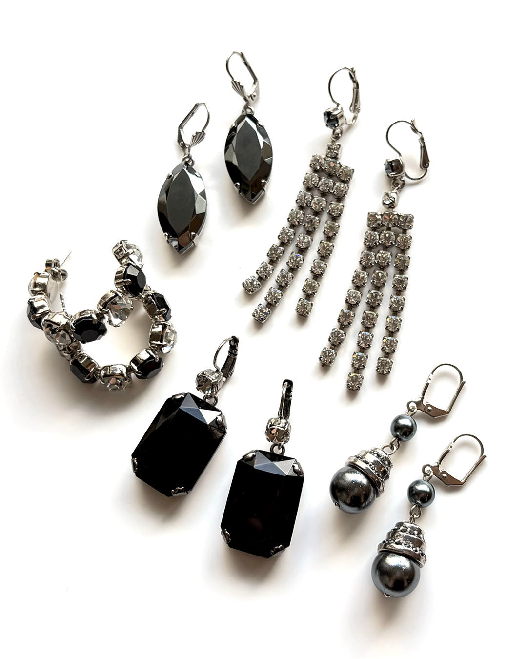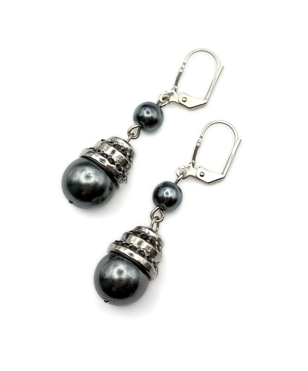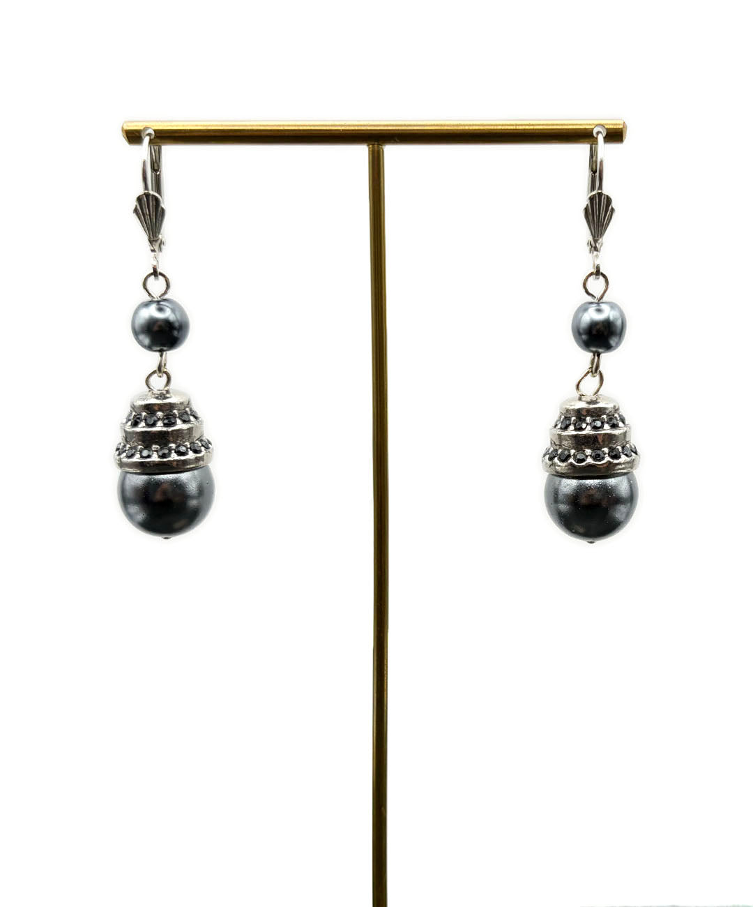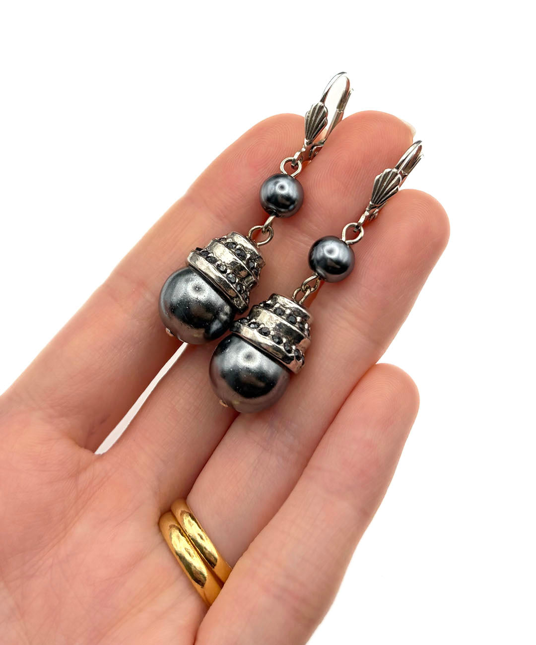 シルバートーンメタルに、小粒のグレーパール、ガンメタルブラックのストーン装飾が施された大粒グレーパールがセットされて揺らめきます。