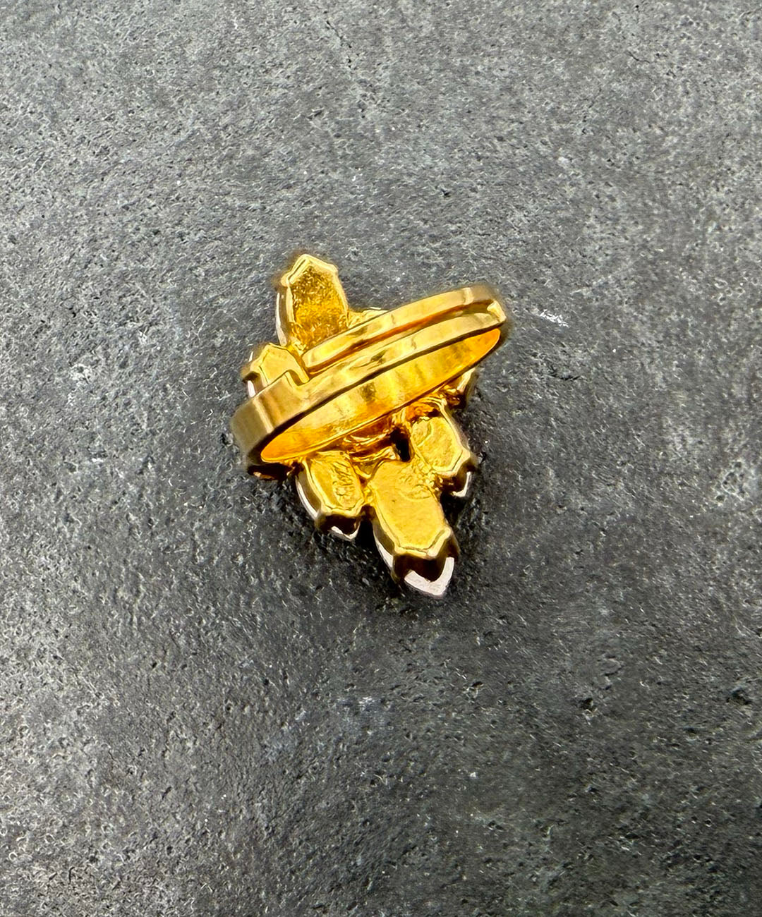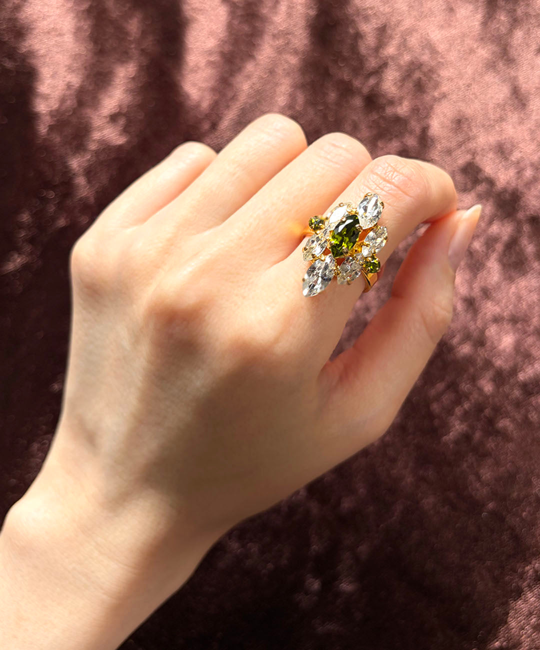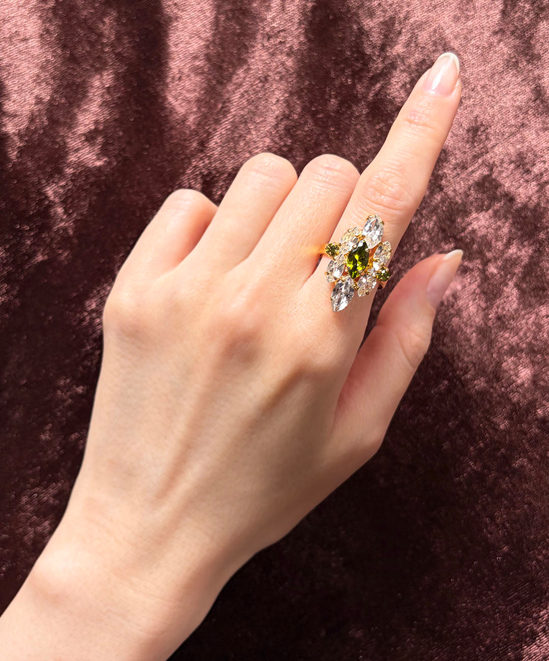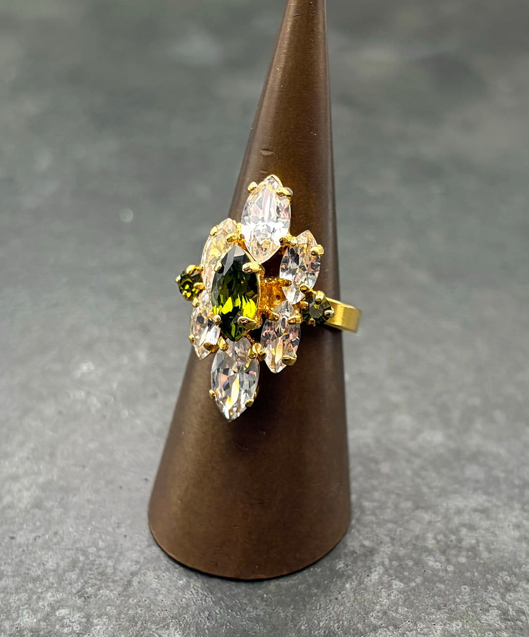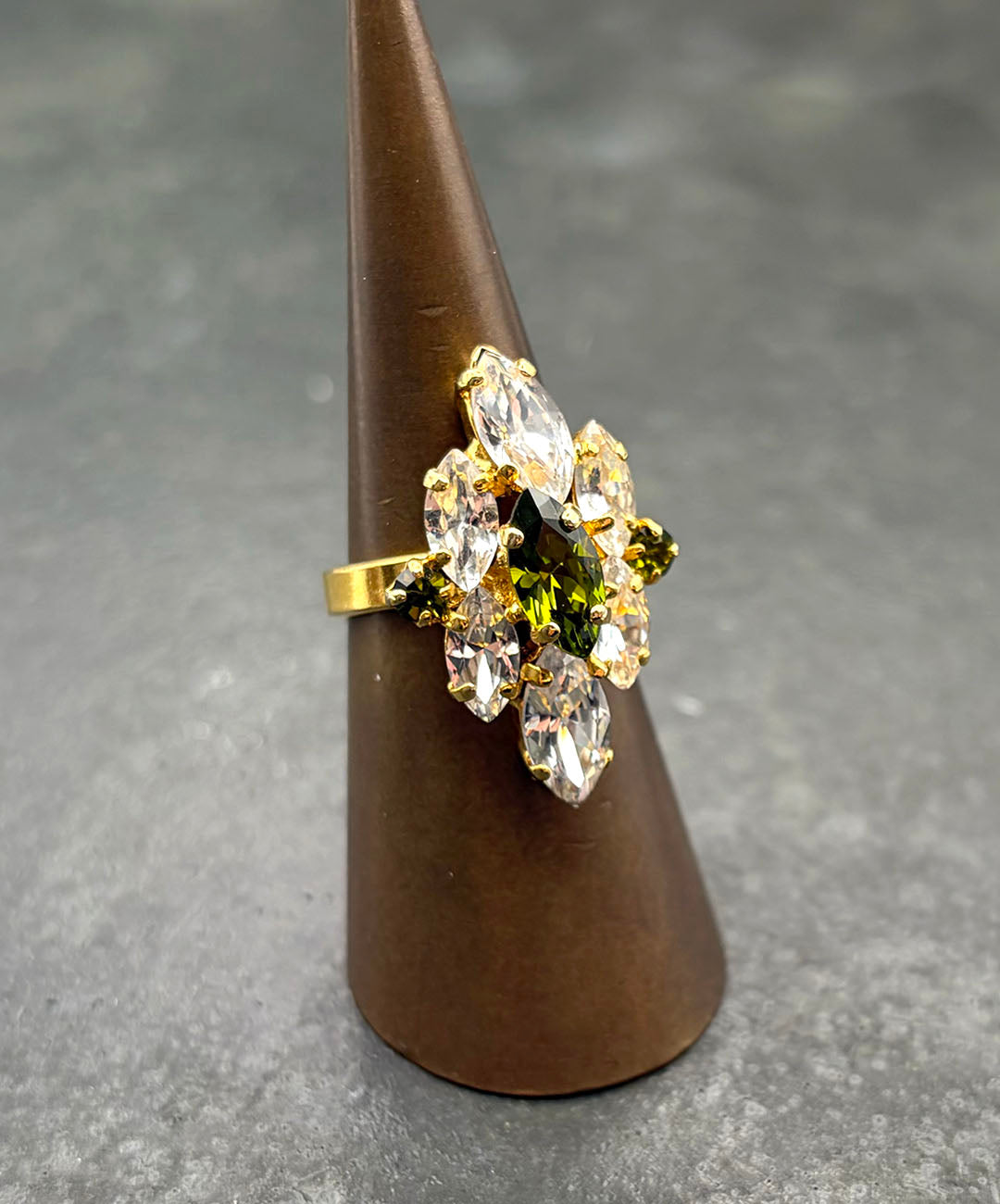 艶やかなゴールドトーンメタルに、マーキスカットのクリスタル、マーキスカット、ラウンドカットのオリーブグリーンストーンが爪留めされています。