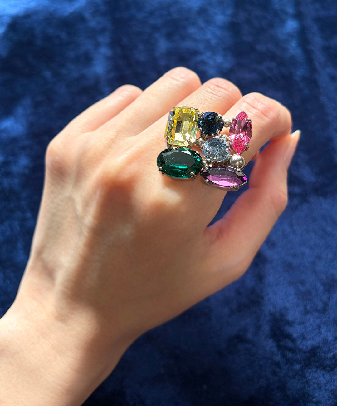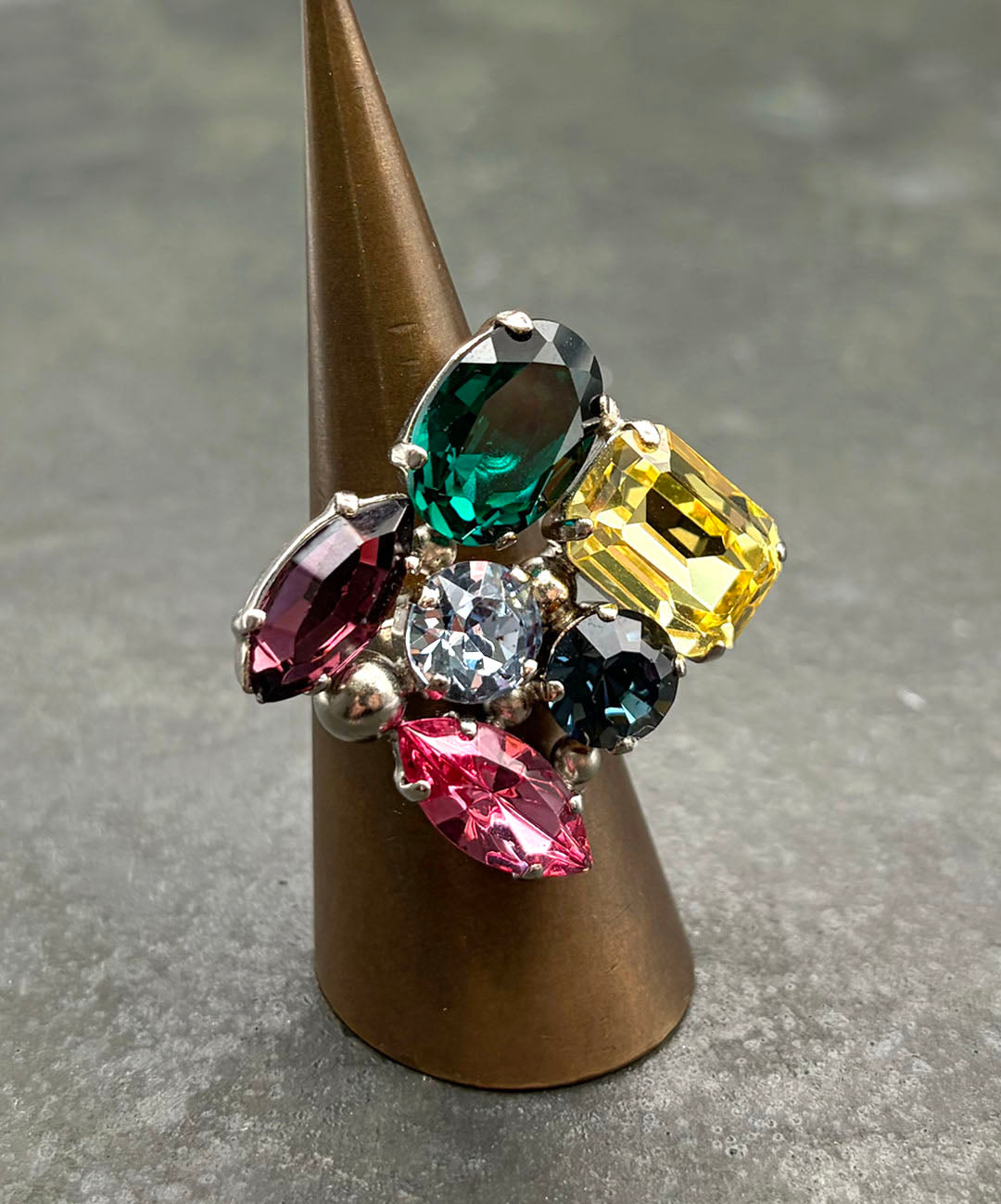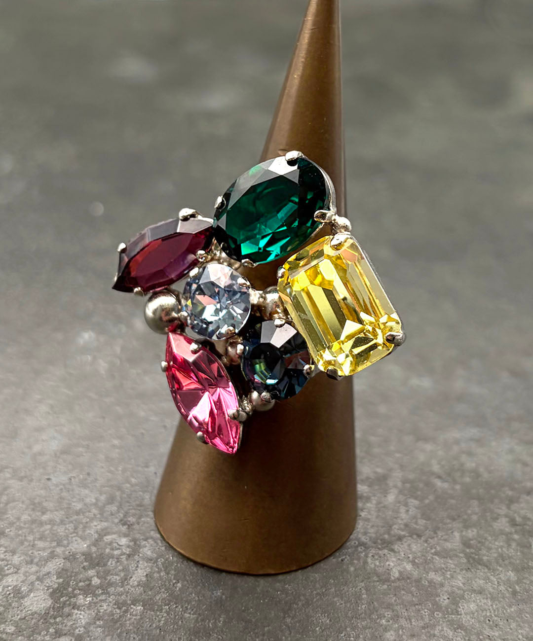 ドロップのようなカラフルな輝きが指元を覆う、コスチュームジュエリーらしい遊び心と存在感抜群のリングです。