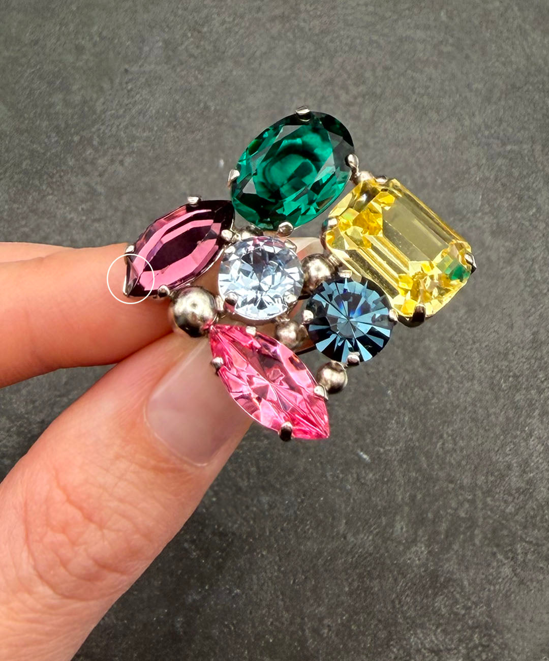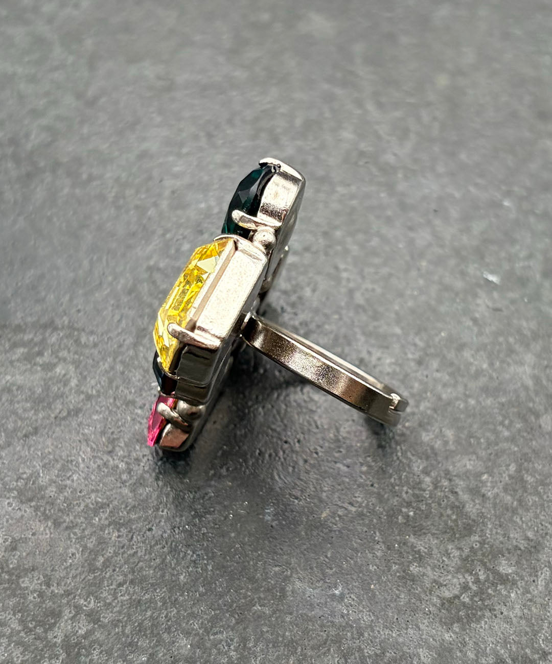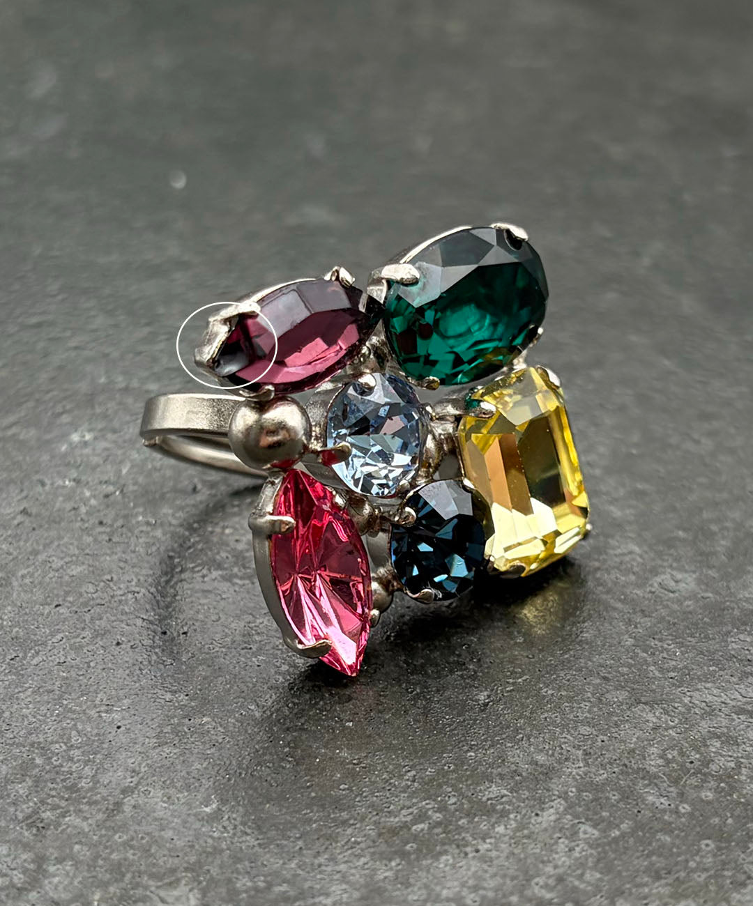 ドロップのようなカラフルな輝きが指元を覆う、コスチュームジュエリーらしい遊び心と存在感抜群のリングです。