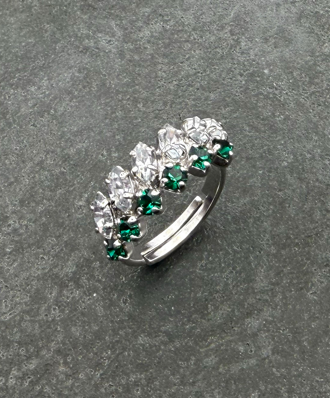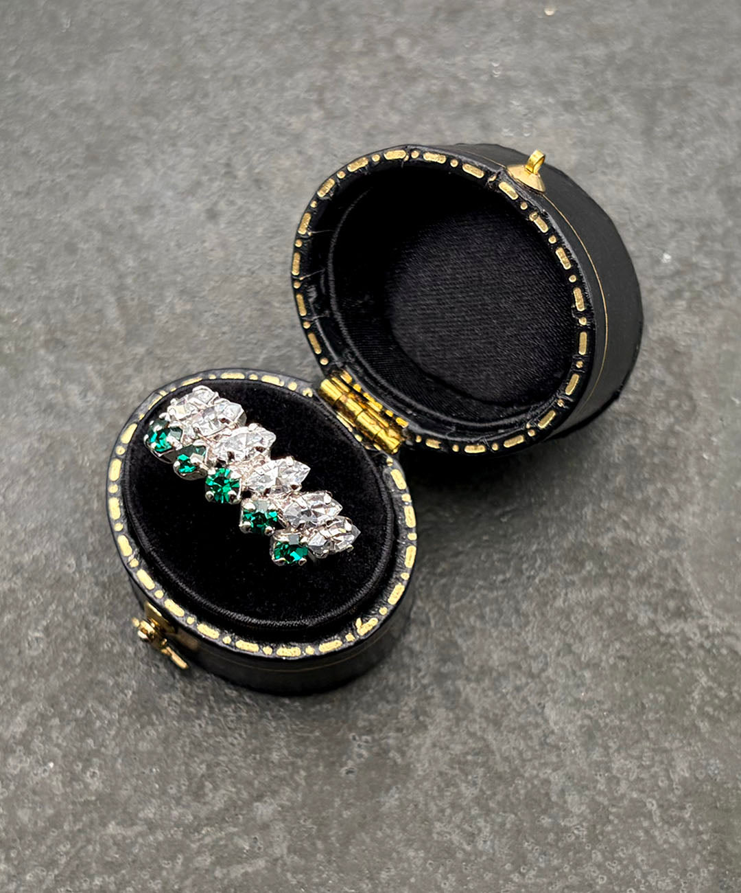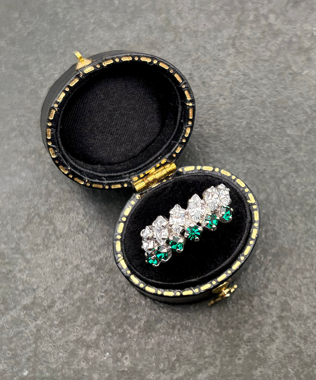 シルバートーンメタルに、エメラルドグリーンのラウンドカットストーン6石、アイスグレーを帯びたマーキスカットのクリアストーン6石が、クラシカルなフォルムに爪留めされています。