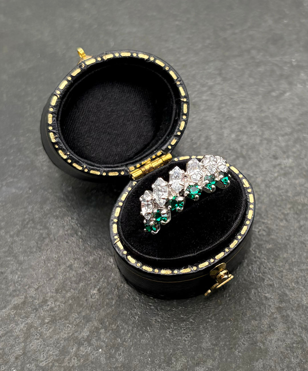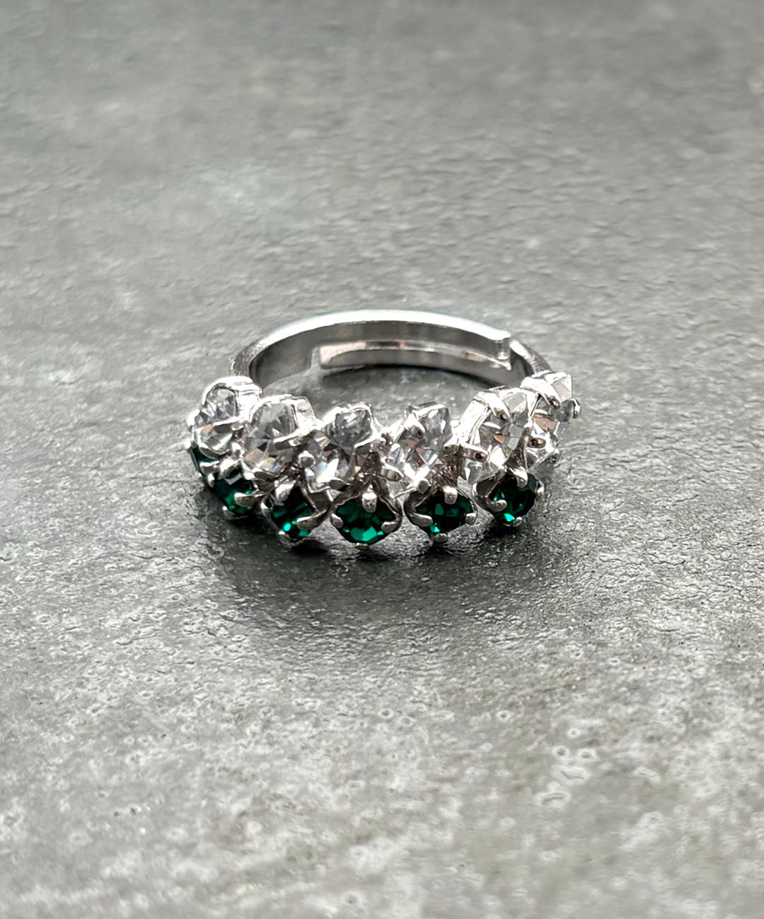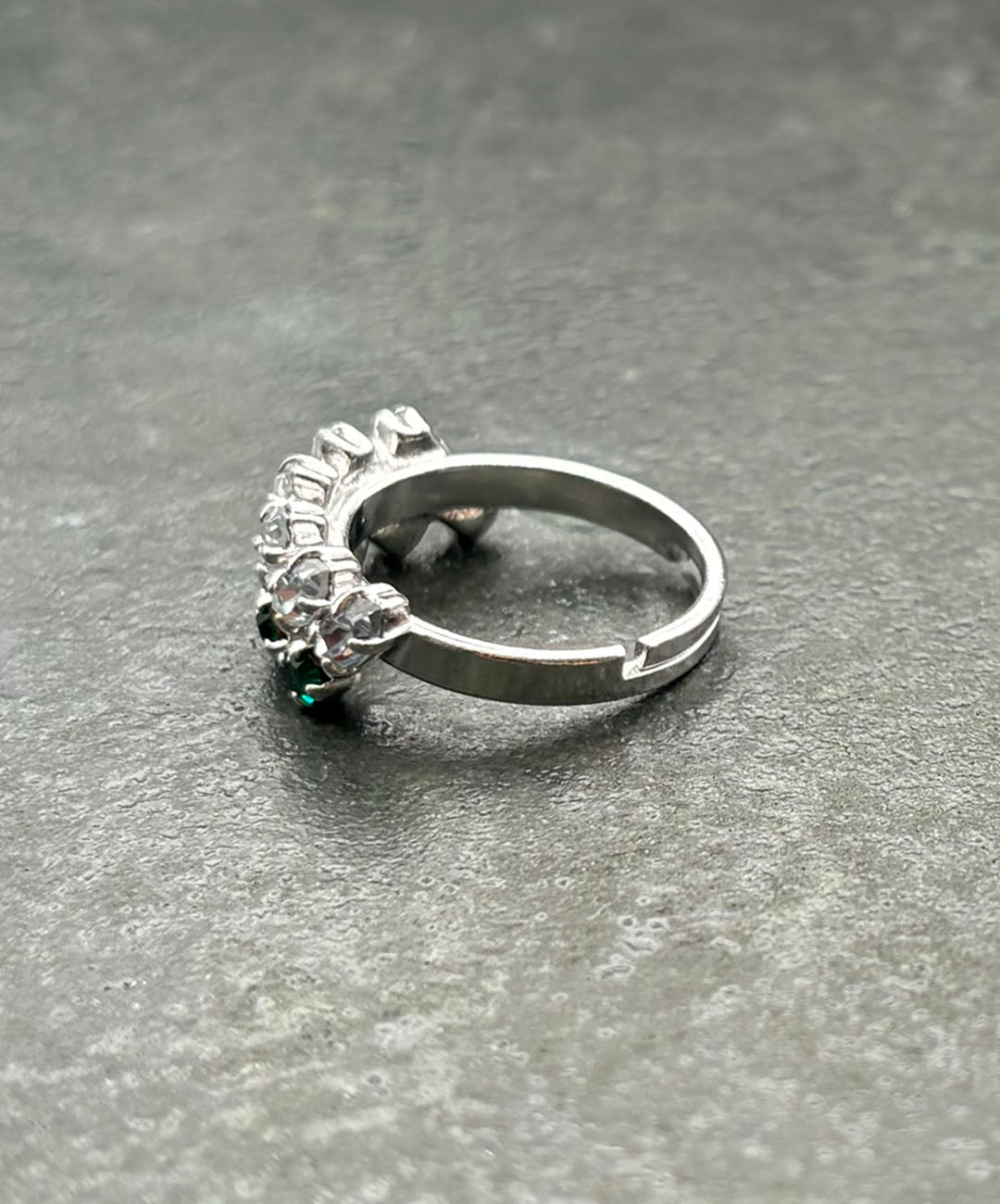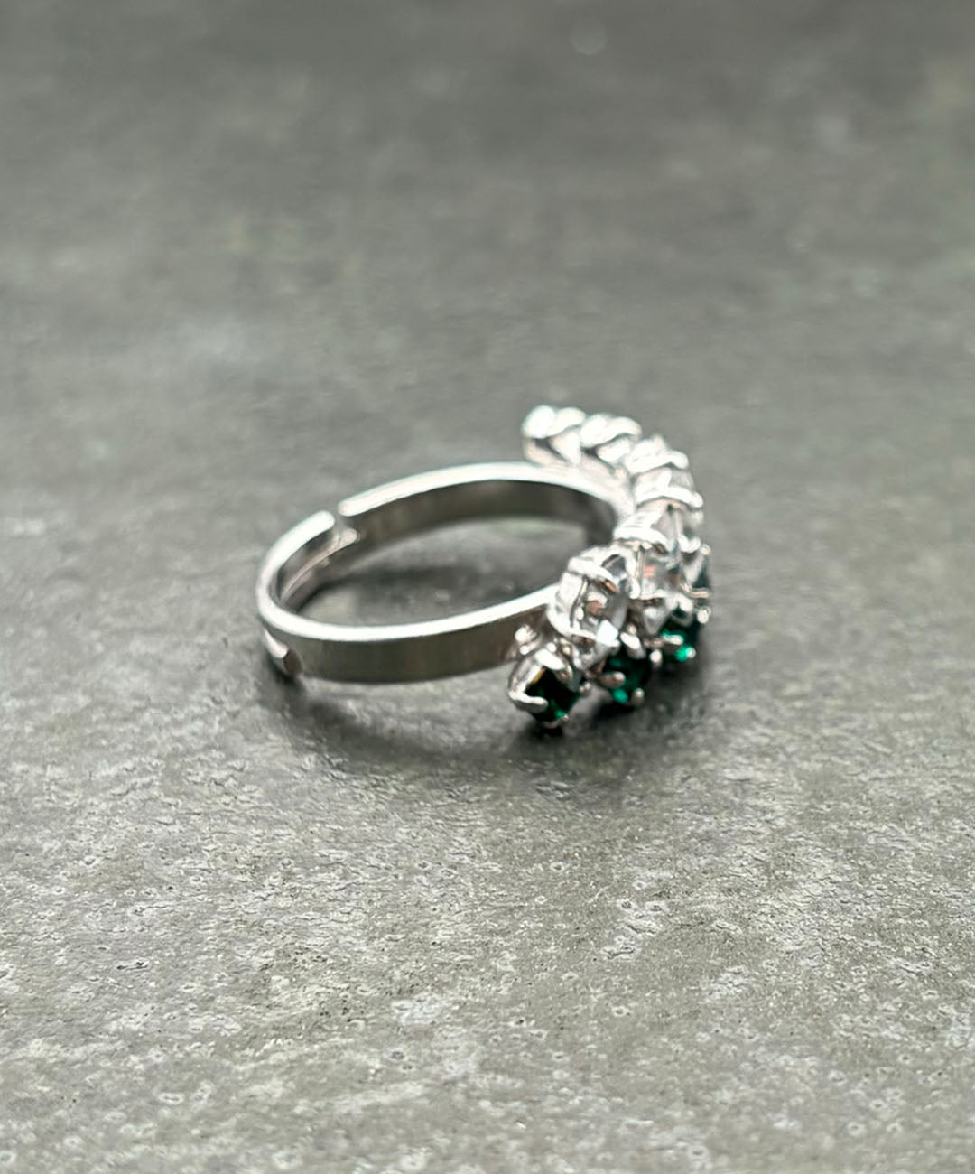 シルバートーンメタルに、エメラルドグリーンのラウンドカットストーン6石、アイスグレーを帯びたマーキスカットのクリアストーン6石が、クラシカルなフォルムに爪留めされています。