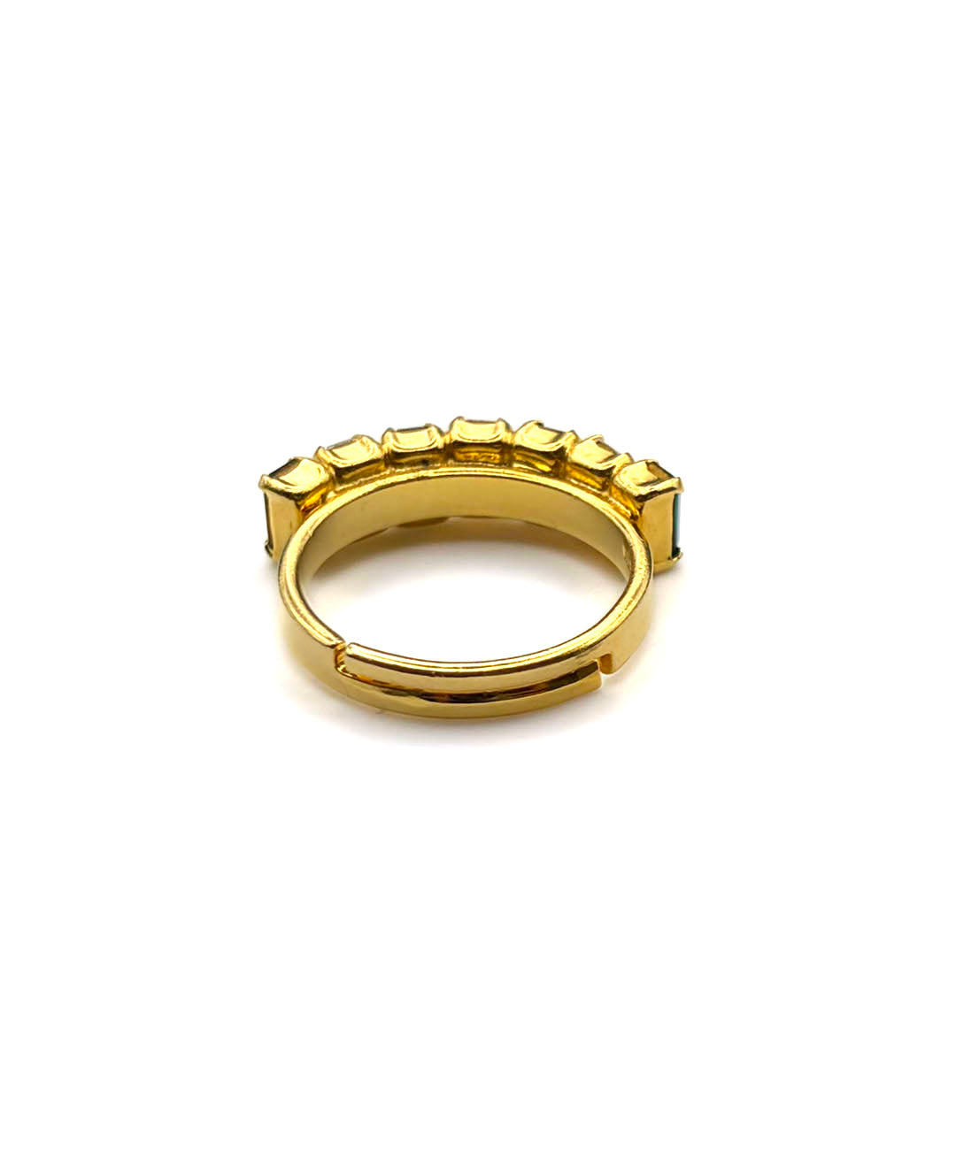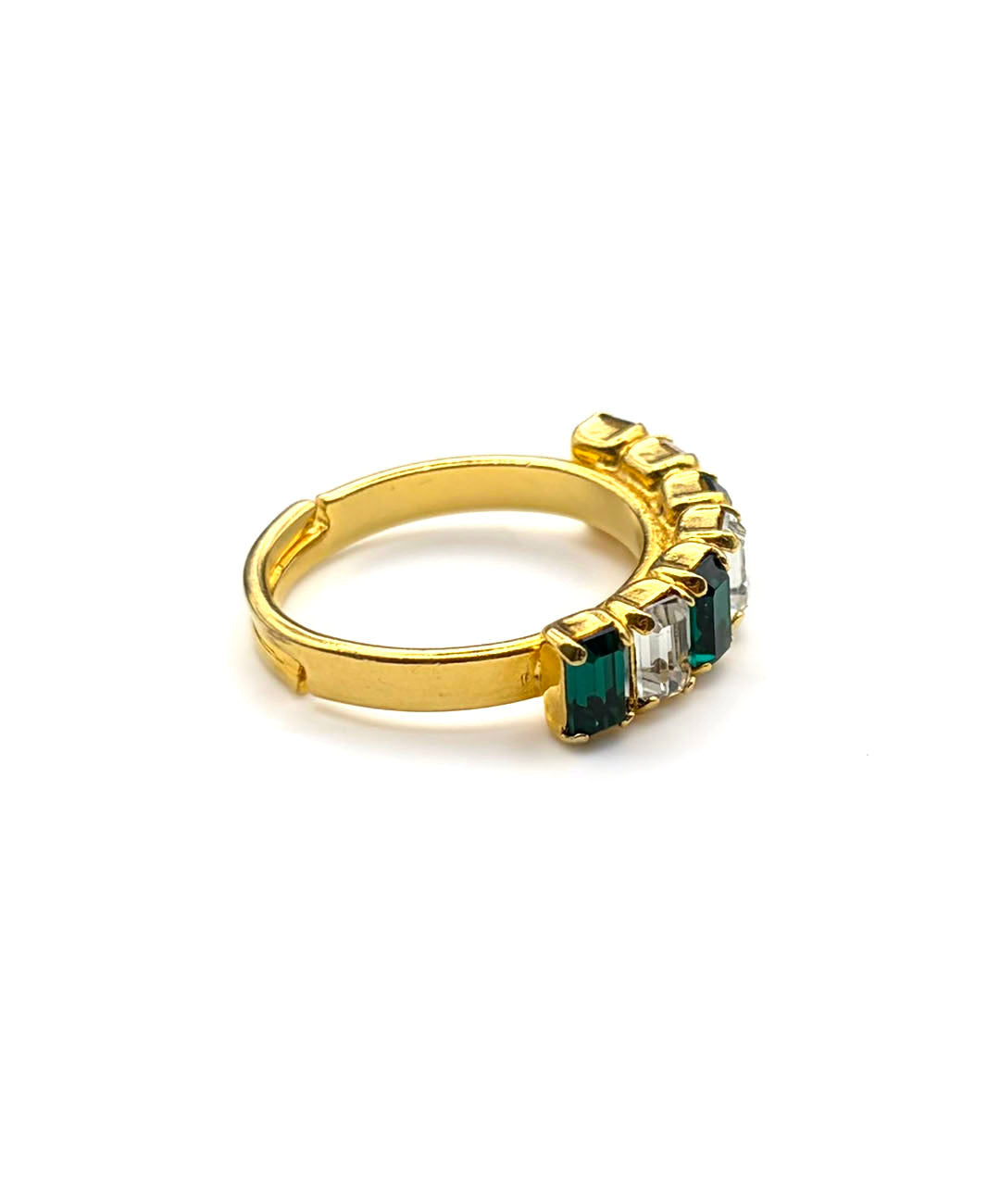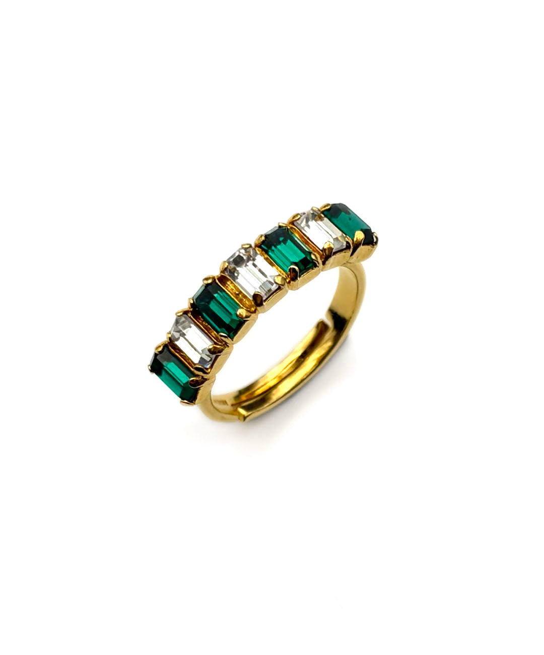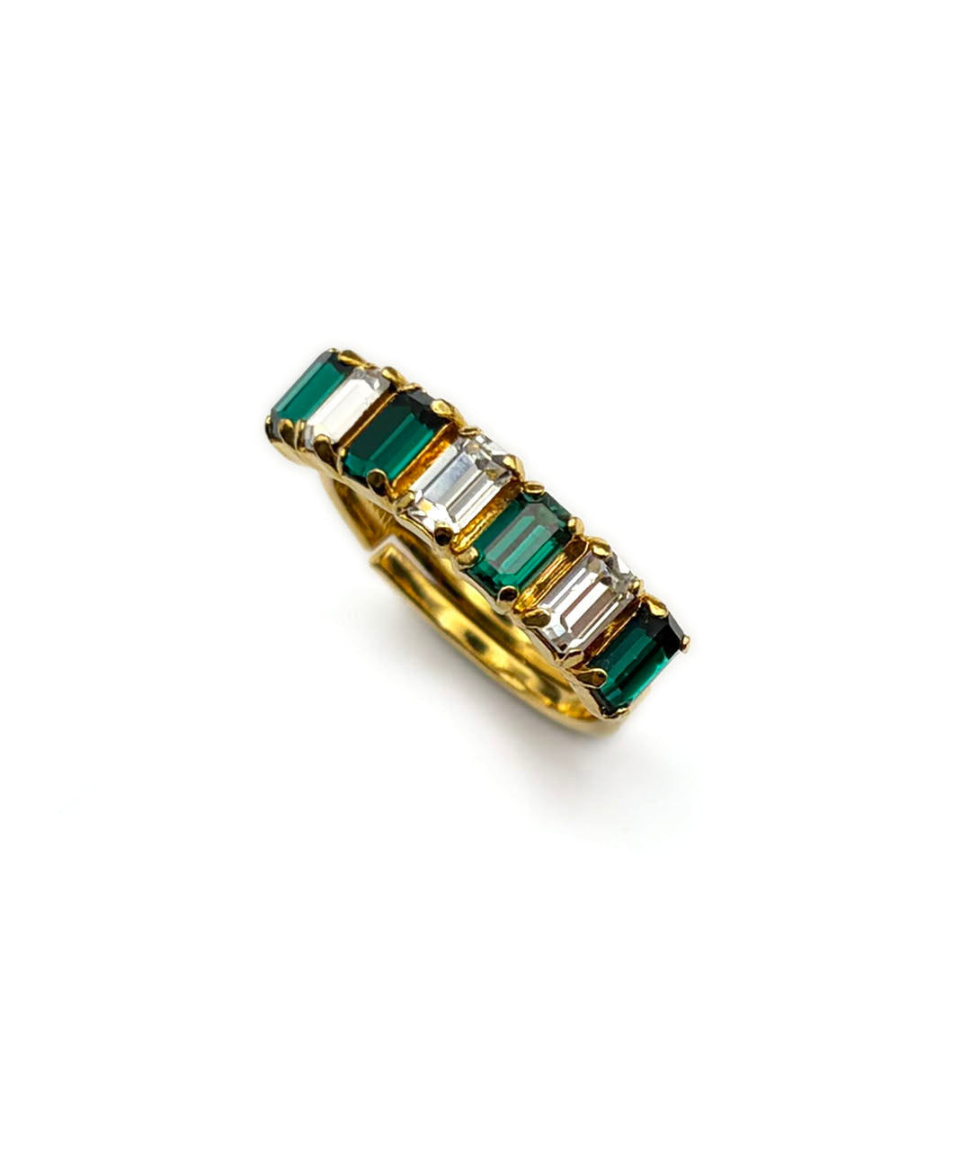 ゴールドトーンメタルにエメラルドカットのクリスタル、エメラルドグリーンストーンが交互に7石爪留めされた、シンプルでありながら立体的で存在感のあるデザイン。
