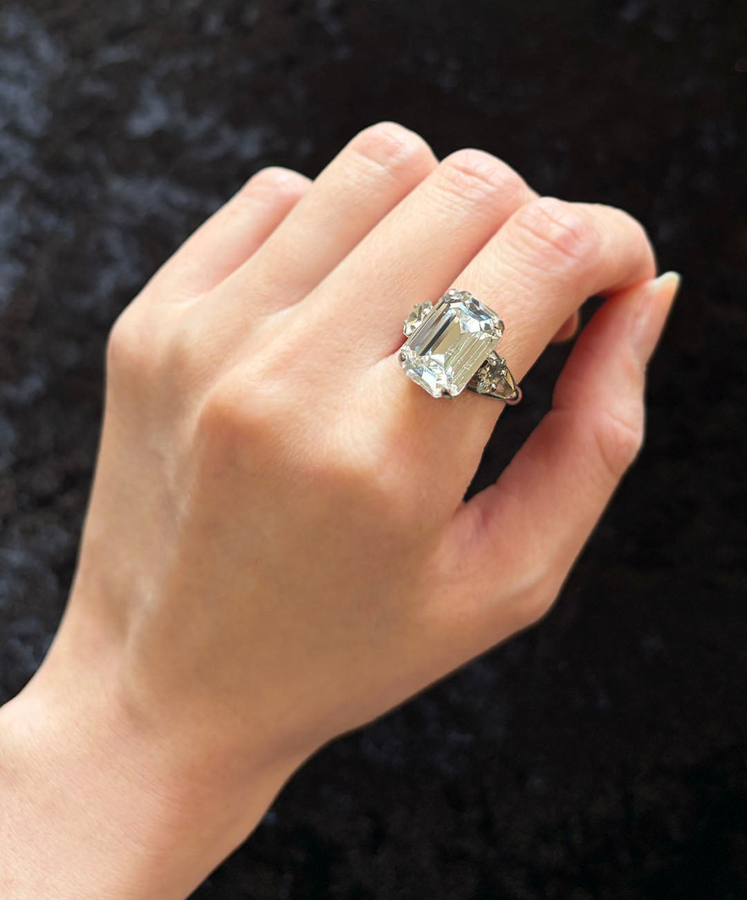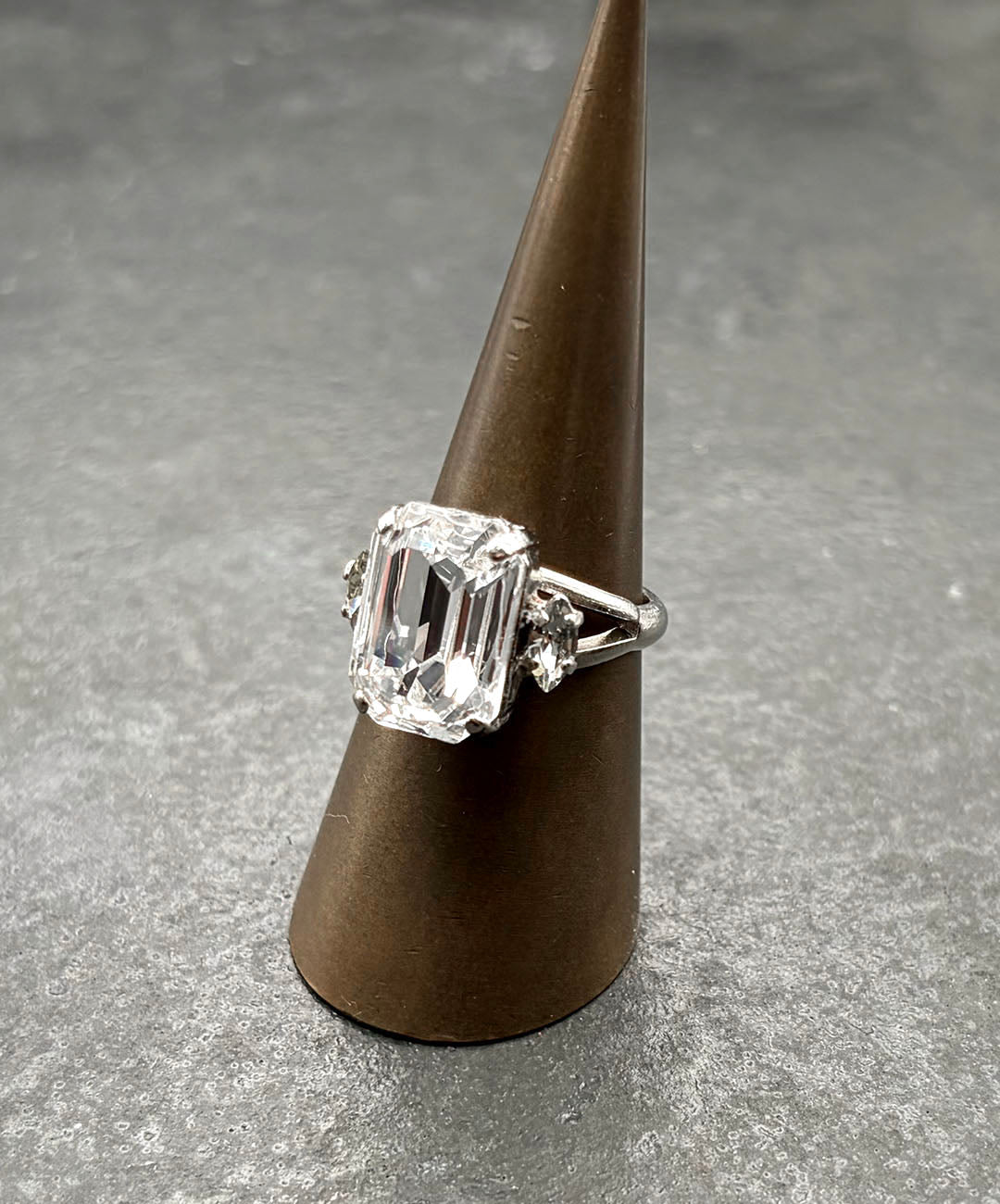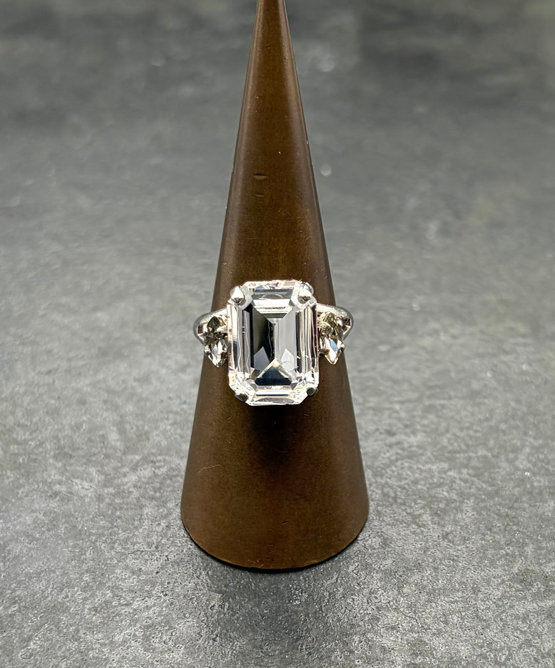 シルバートーンメタルに、エメラルドカットの大粒クリスタル、サイドにマーキスカットのグレーガラスが爪留めされたクラシカルなデザイン。