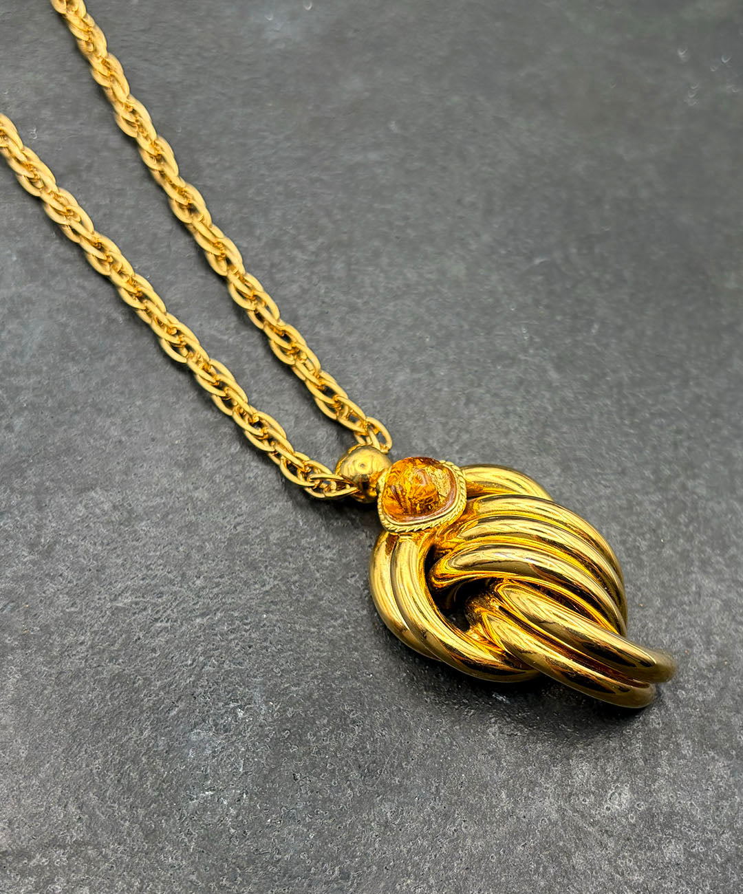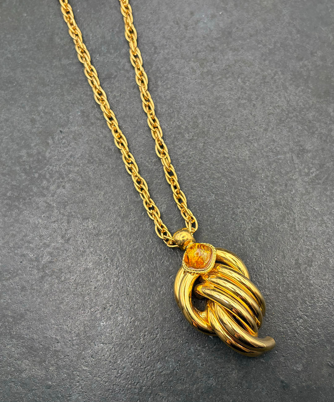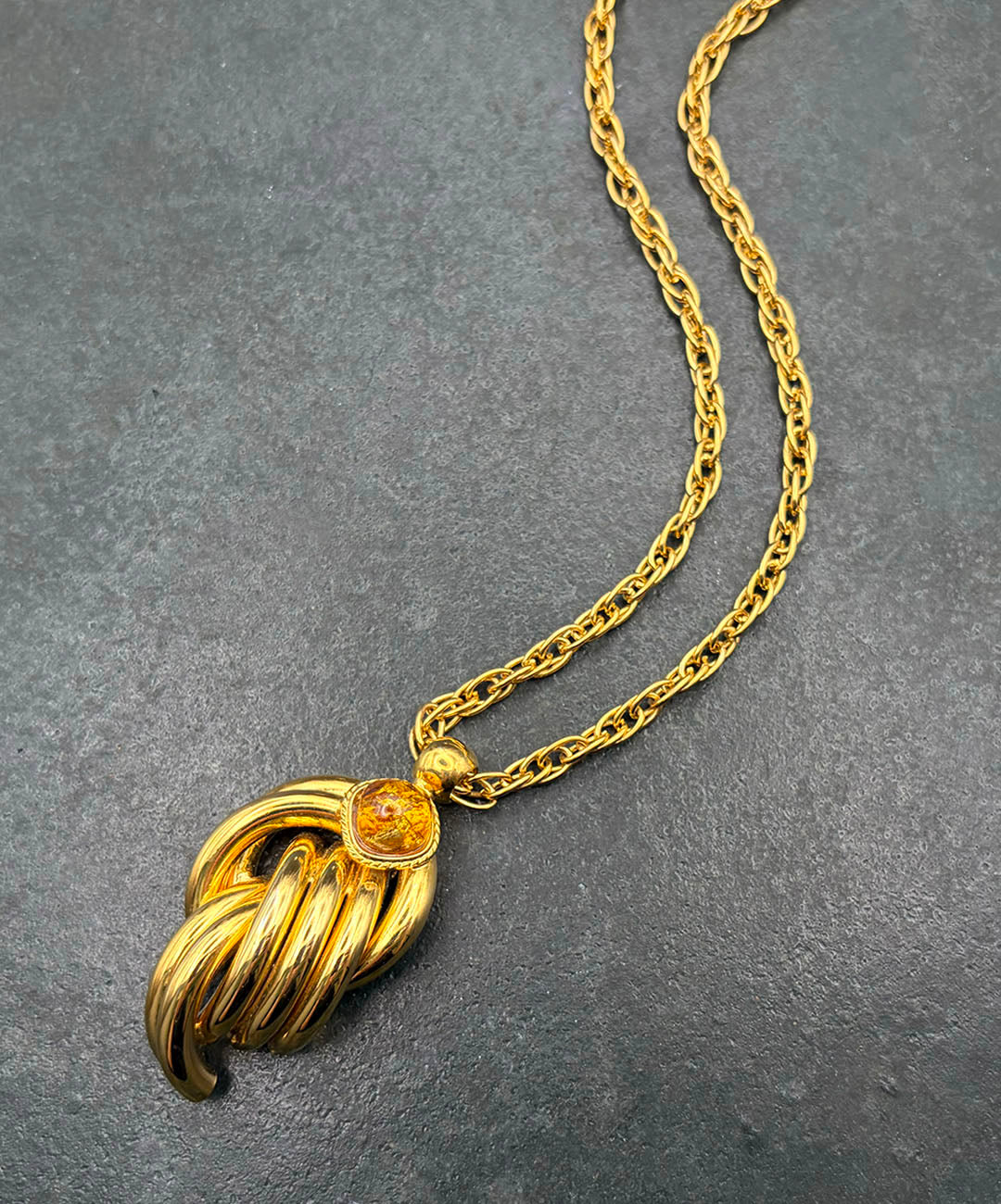 ゴールドトーンのクラシカルなデザインチェーンに、クッションシェイプのアンバーカボションガラスがセットされた、アブストラクトモチーフペンダントがあしらわれています。