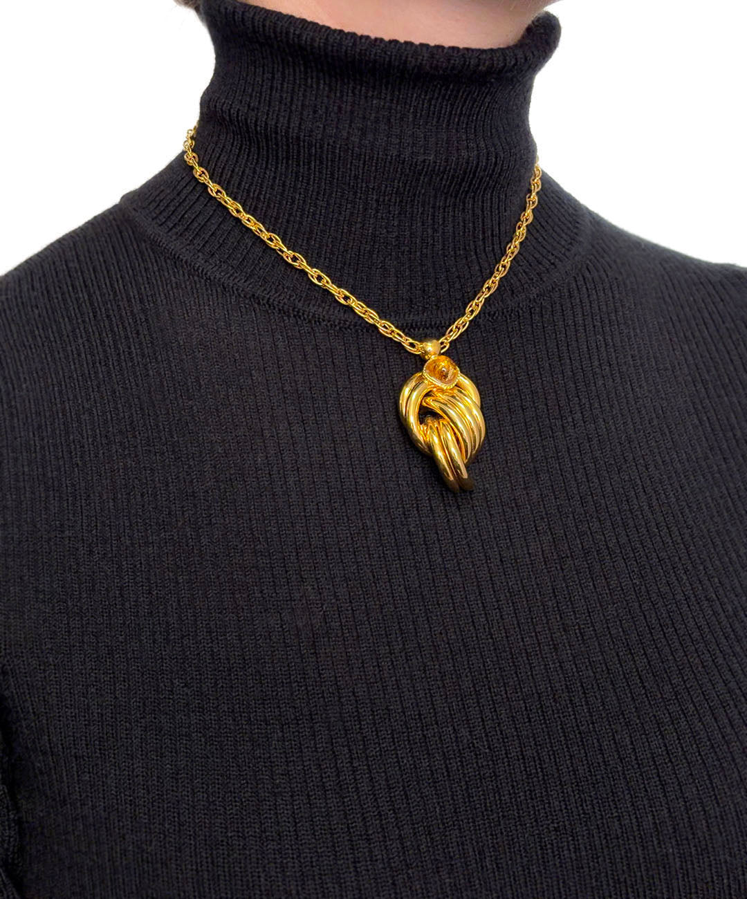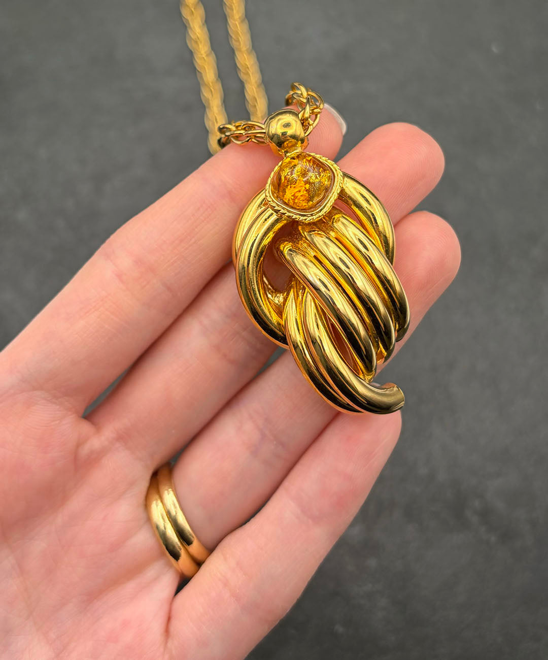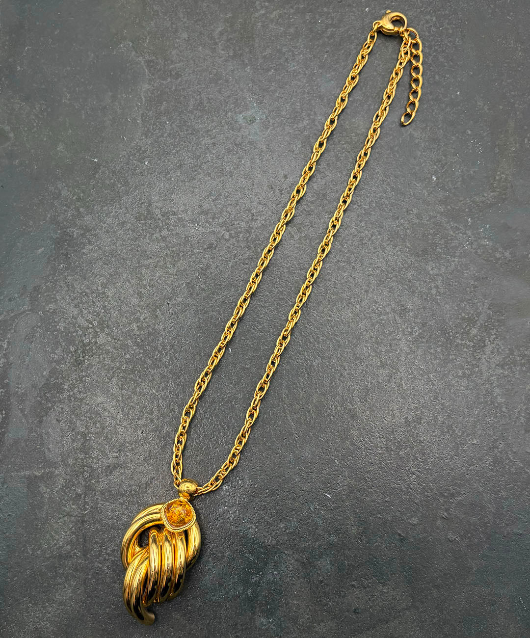 ゴールドトーンのクラシカルなデザインチェーンに、クッションシェイプのアンバーカボションガラスがセットされた、アブストラクトモチーフペンダントがあしらわれています。