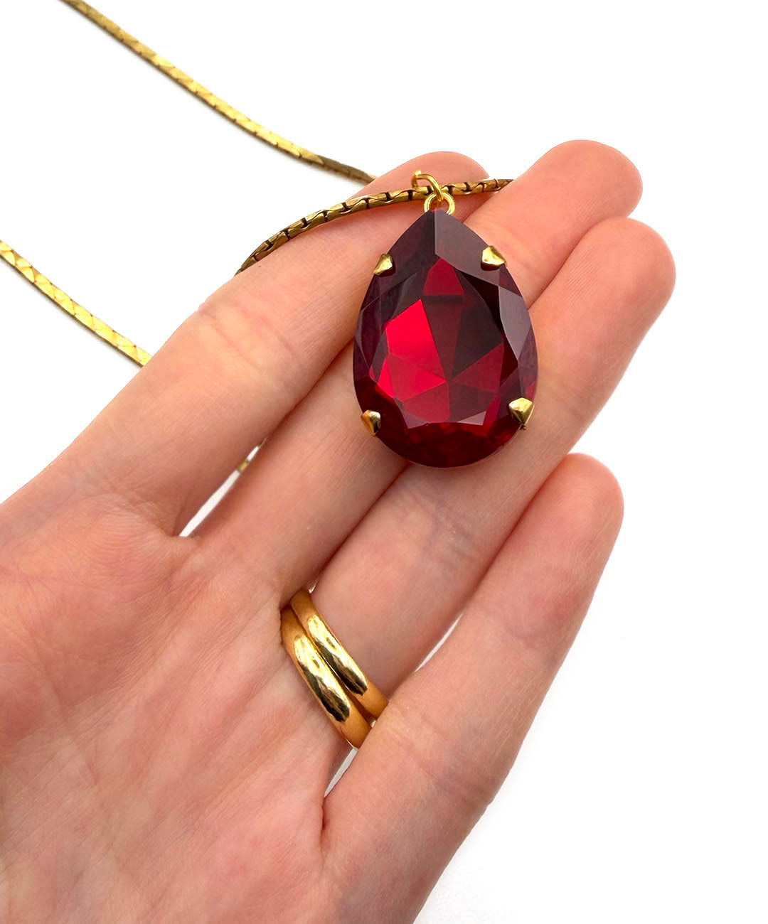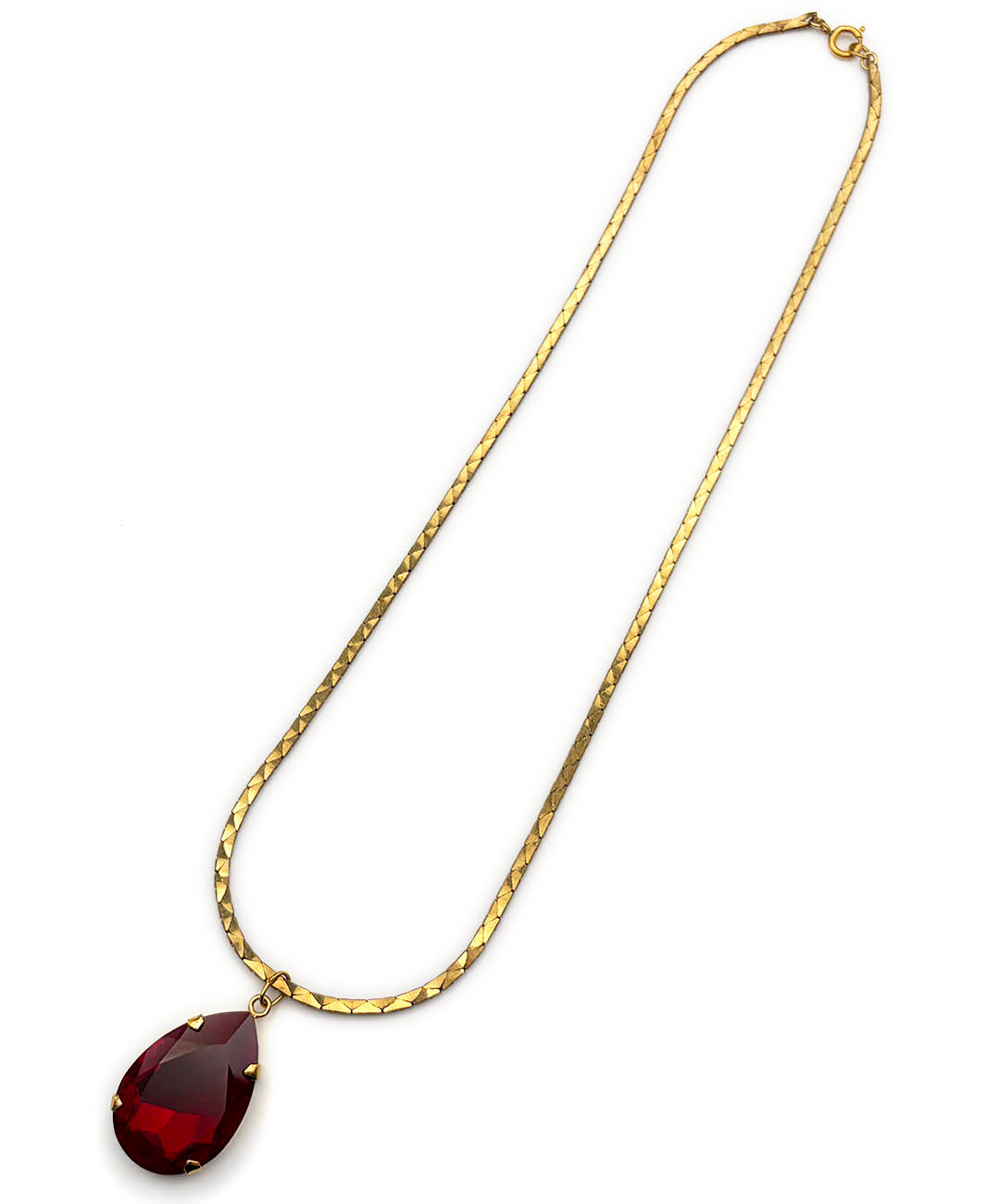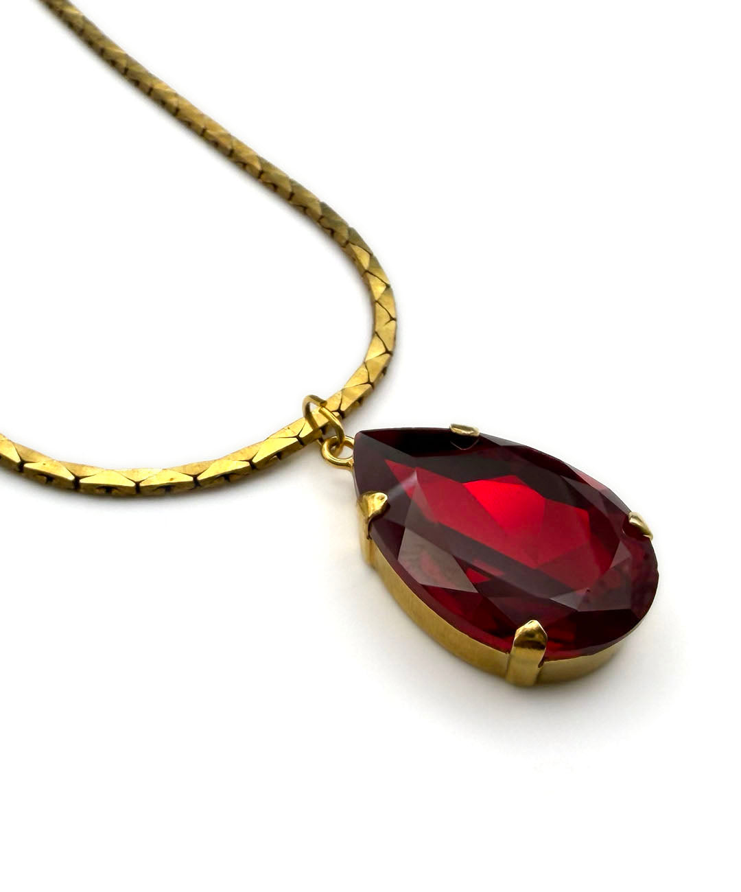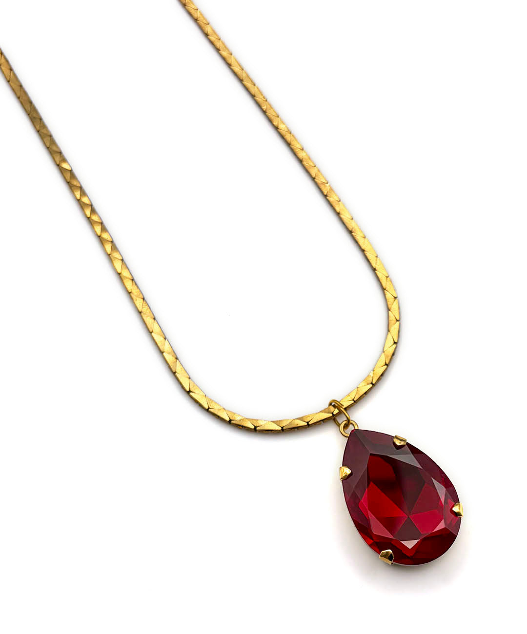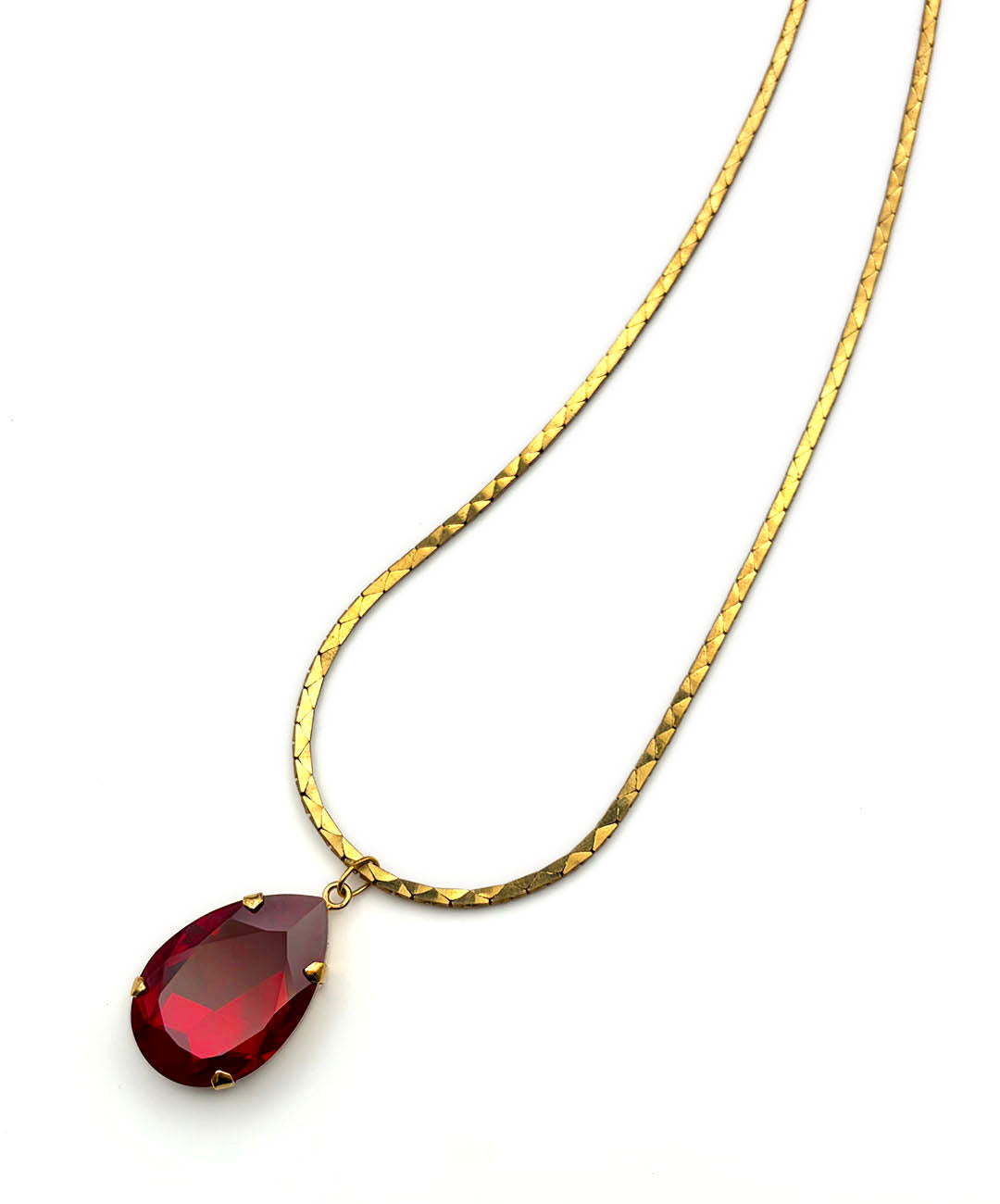 艶めくゴールドトーンのスネークチェーンに、ガーネットレッドの大ぶりティアドロップガラスが爪留めされたペンダントが通されています。