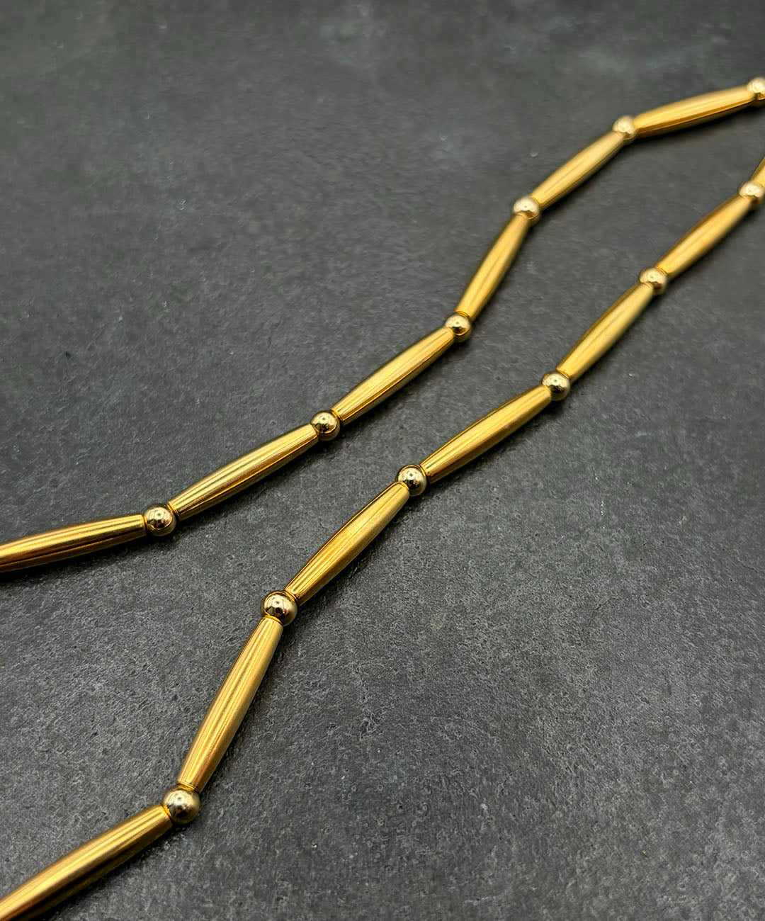 幾何学的な魅力を放つペンダントと、バーと球が連なるネックレスが描くシルエットが絶妙にマッチしており、SEIBOTH社独特のセンスを感じる秀逸なデザインです。