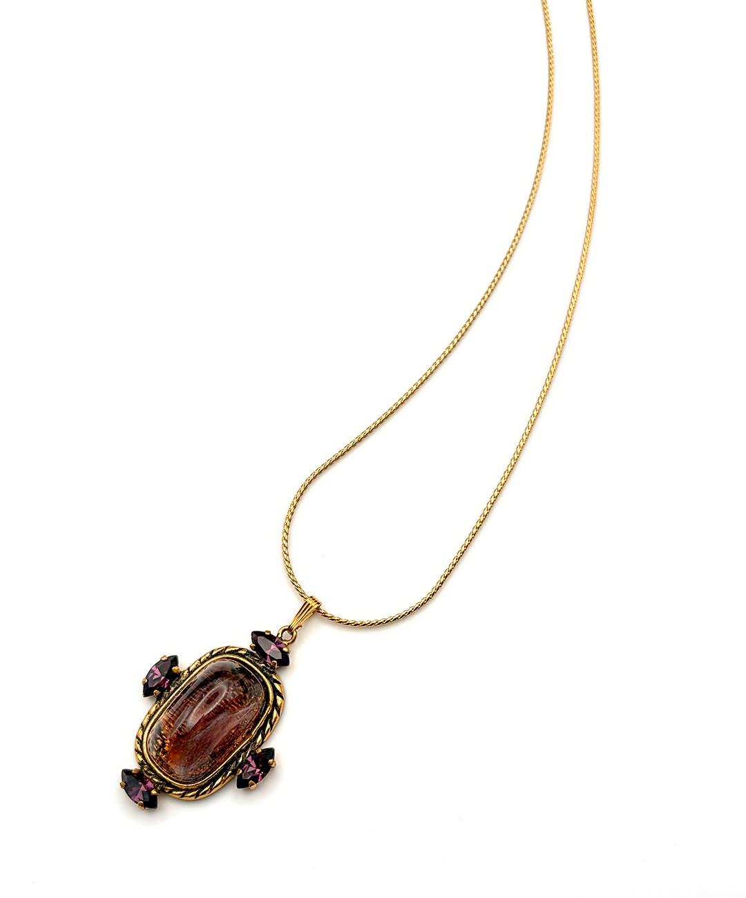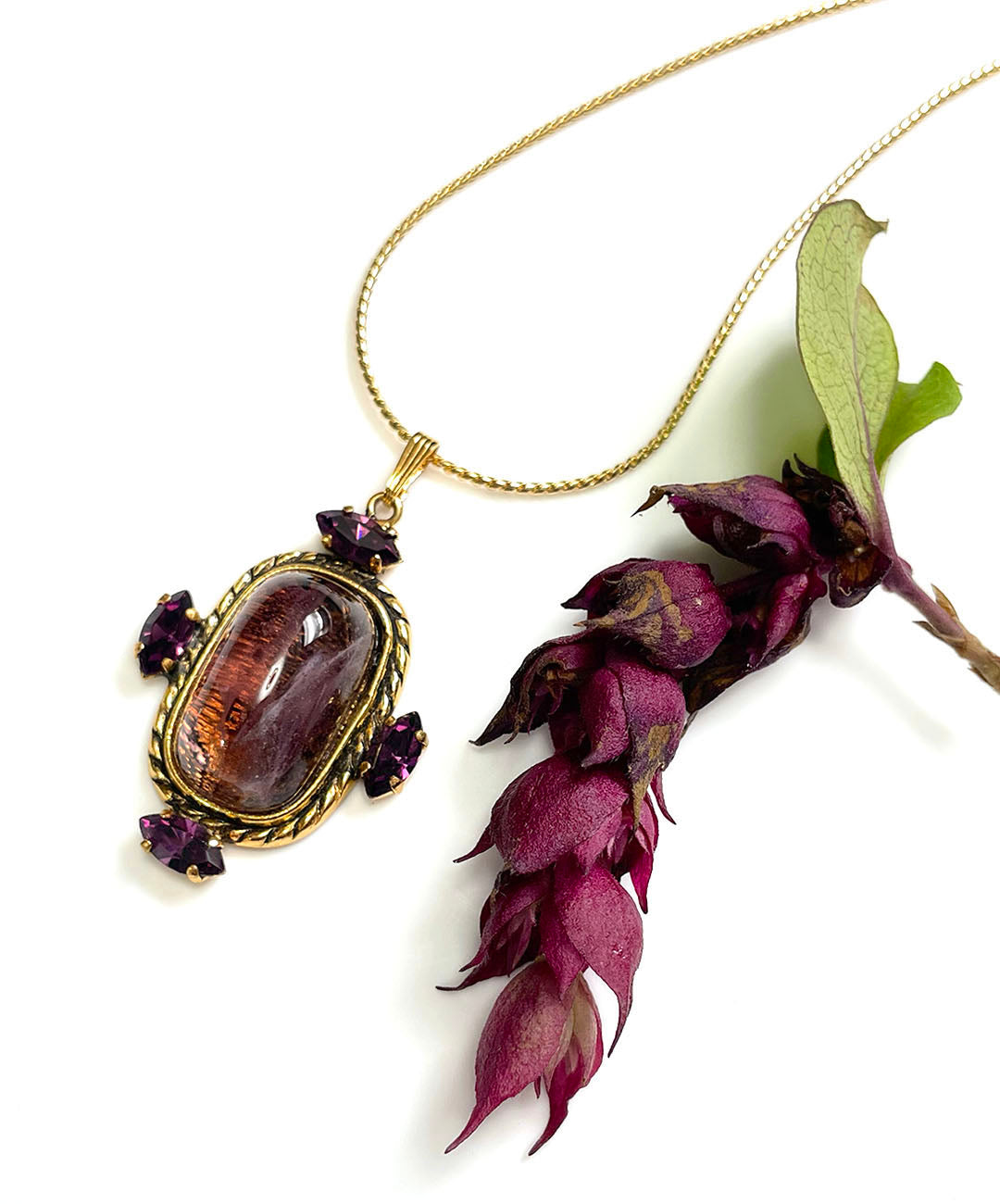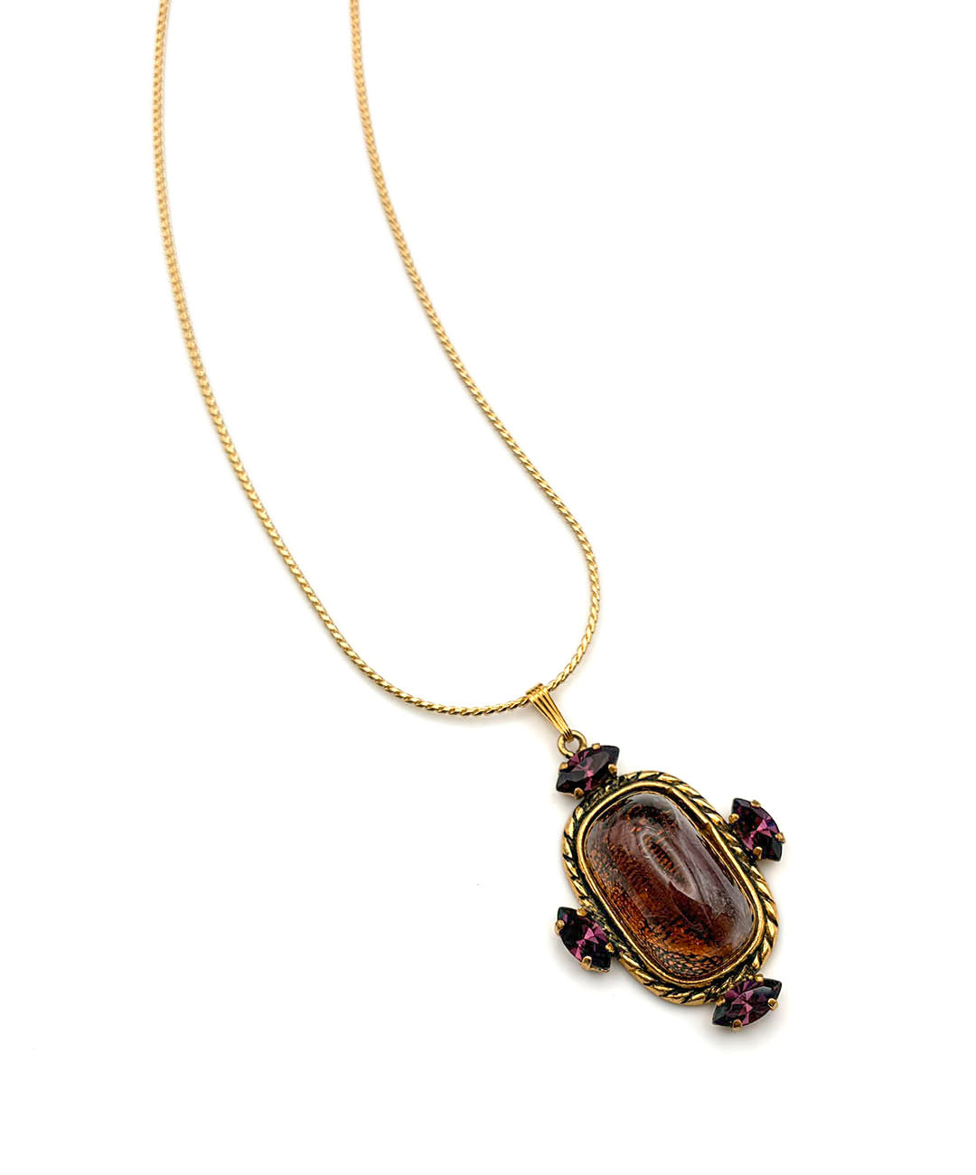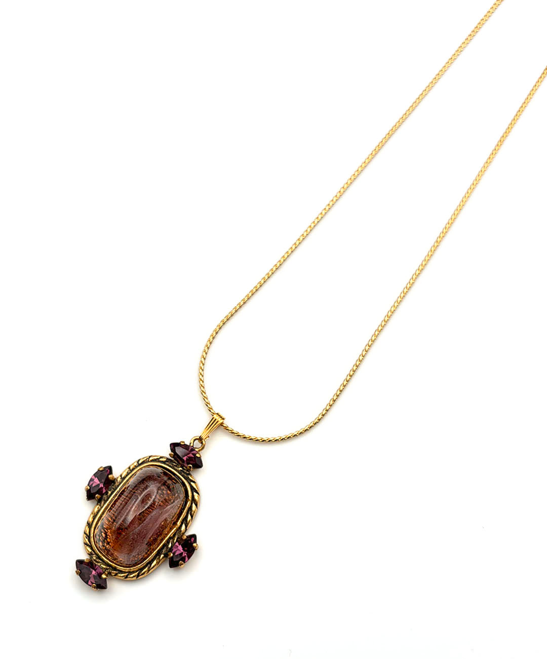 繊細に艶めくゴールドトーンのスネークチェーンに、バーガンディーのカボションガラスがセットされ、周囲にマーキスカットのパープルストーンが4石爪留めされたペンダントが通されています。