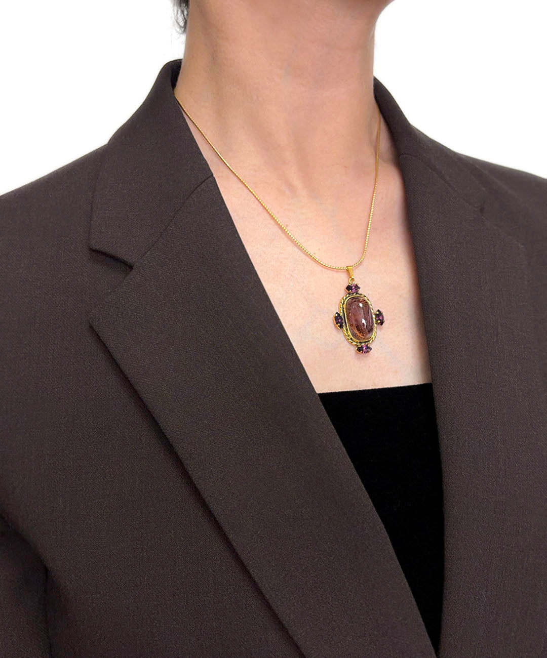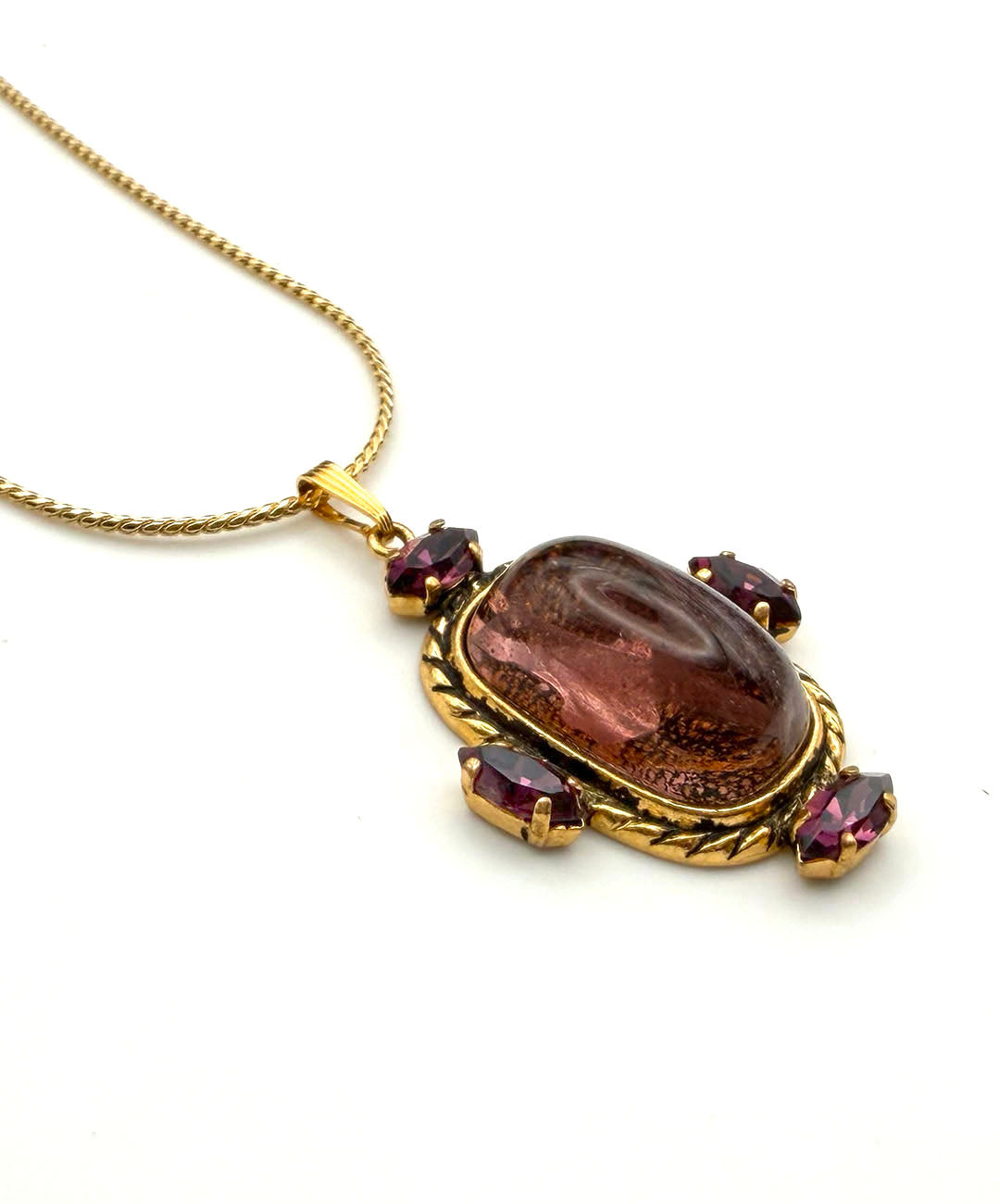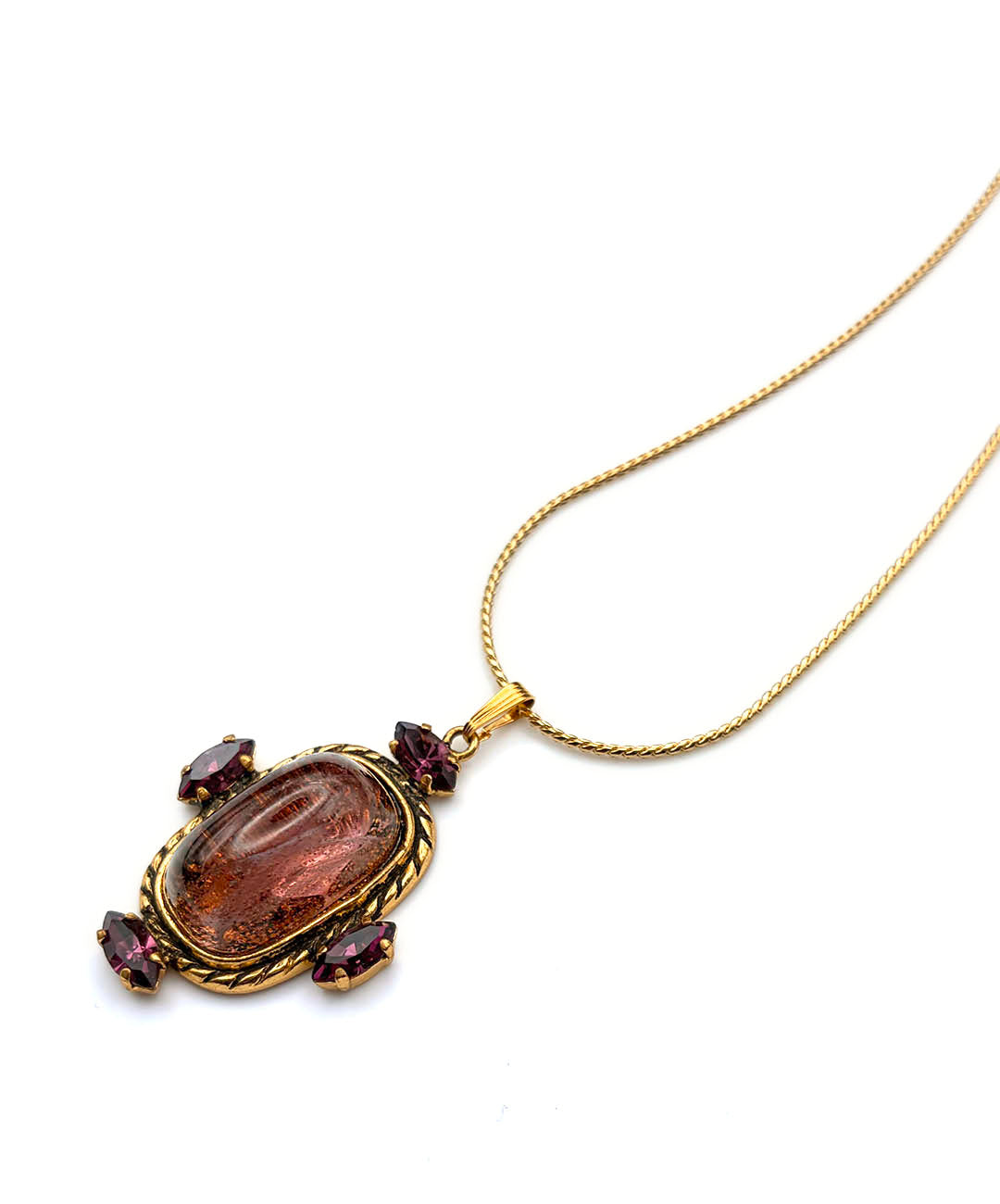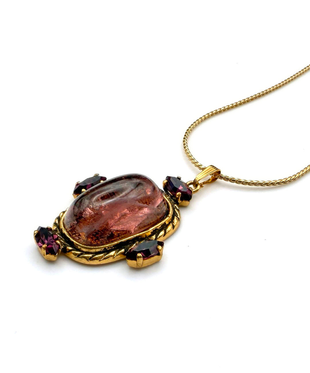 繊細に艶めくゴールドトーンのスネークチェーンに、バーガンディーのカボションガラスがセットされ、周囲にマーキスカットのパープルストーンが4石爪留めされたペンダントが通されています。