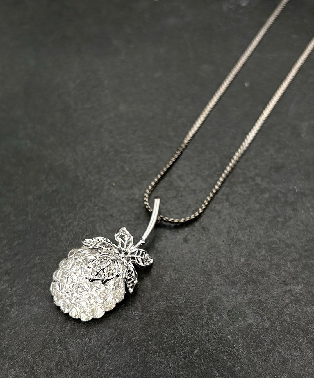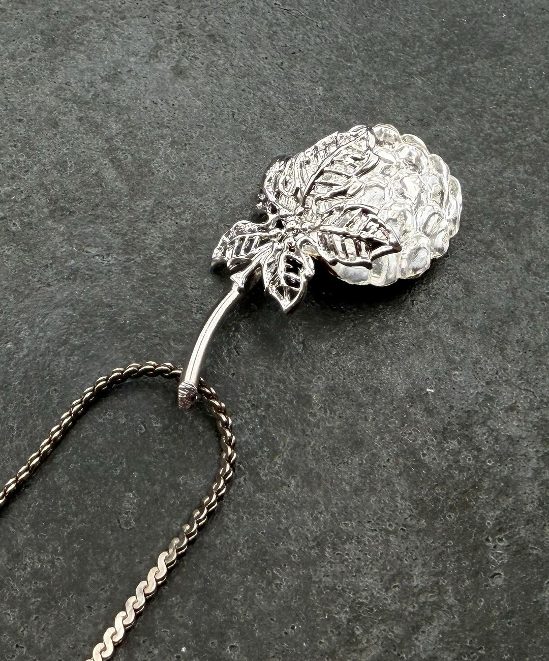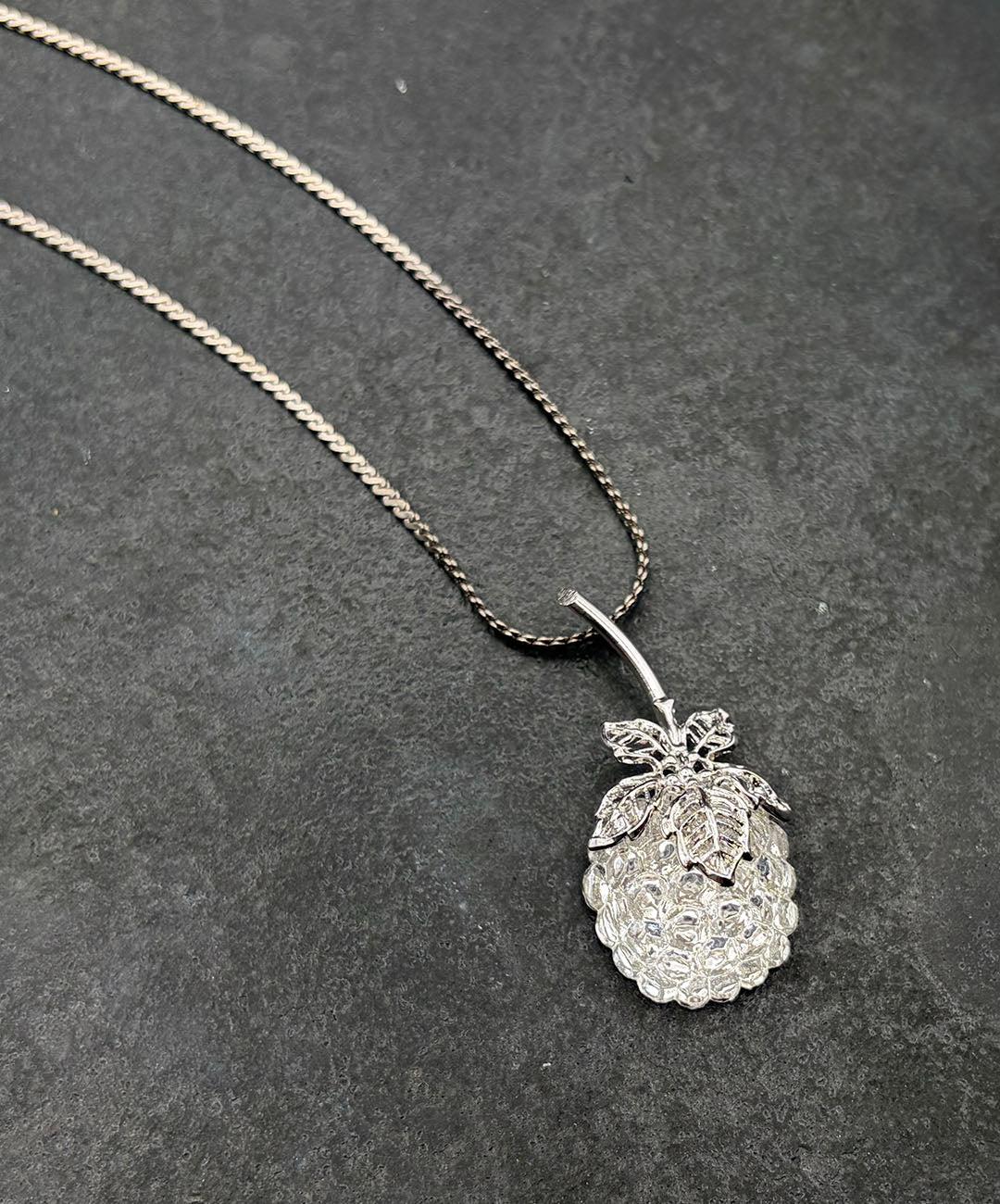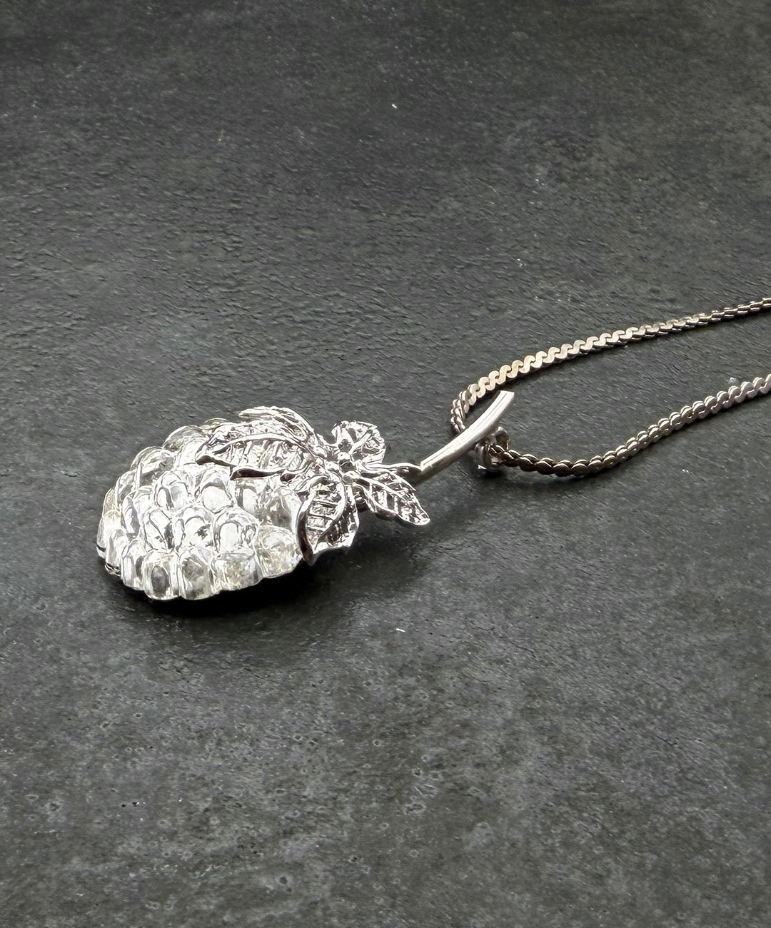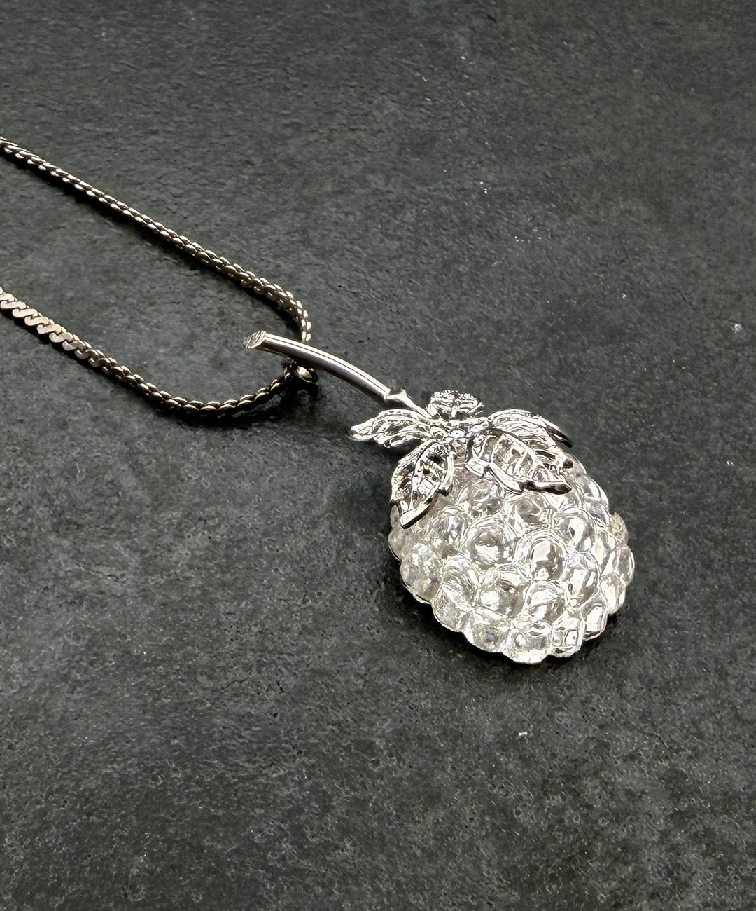 凛と煌めく滑らかなシルバートーンチェーンに、優美なオープンワークのリーフがあしらわれた、木苺モチーフのクリアガラスペンダントが通されています。