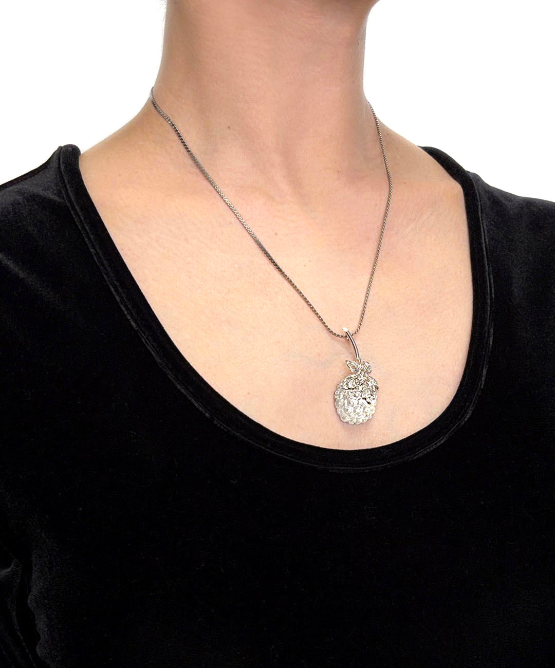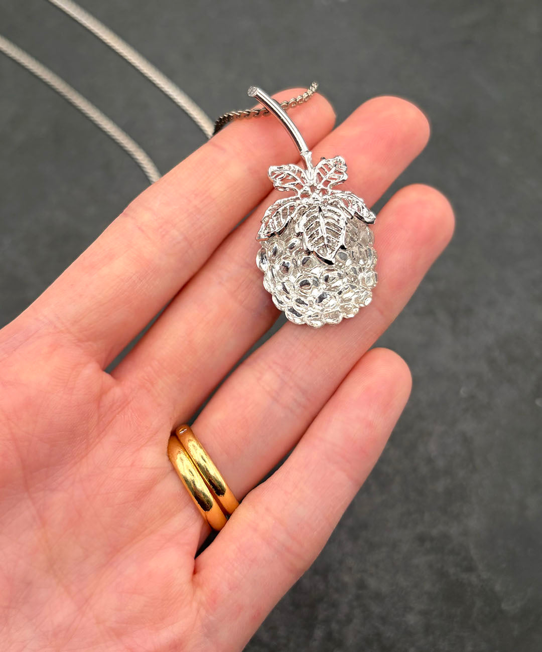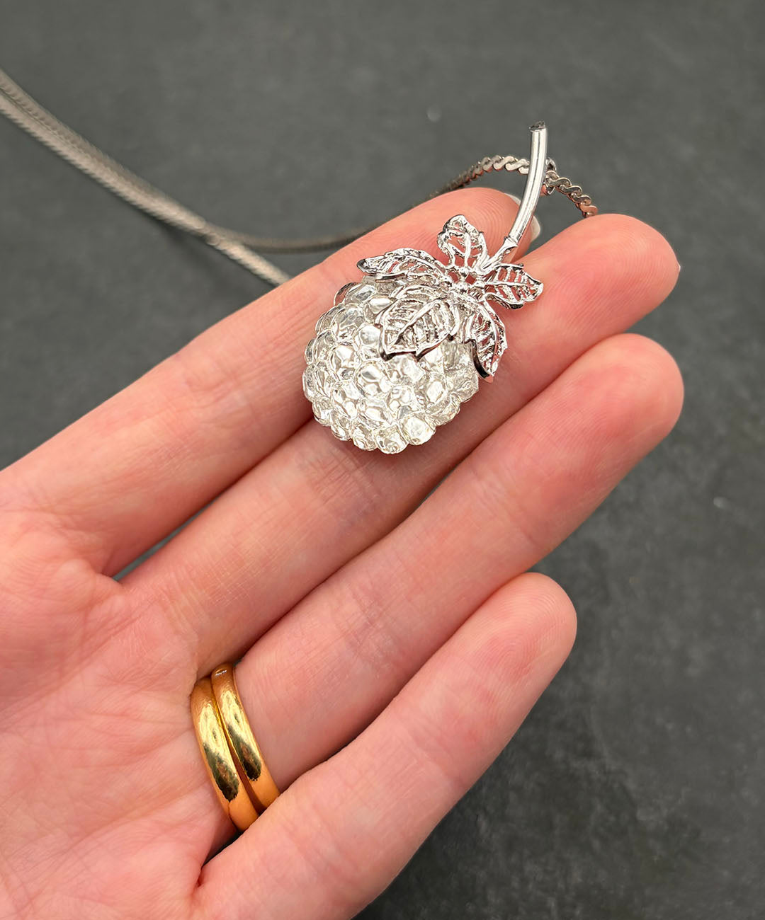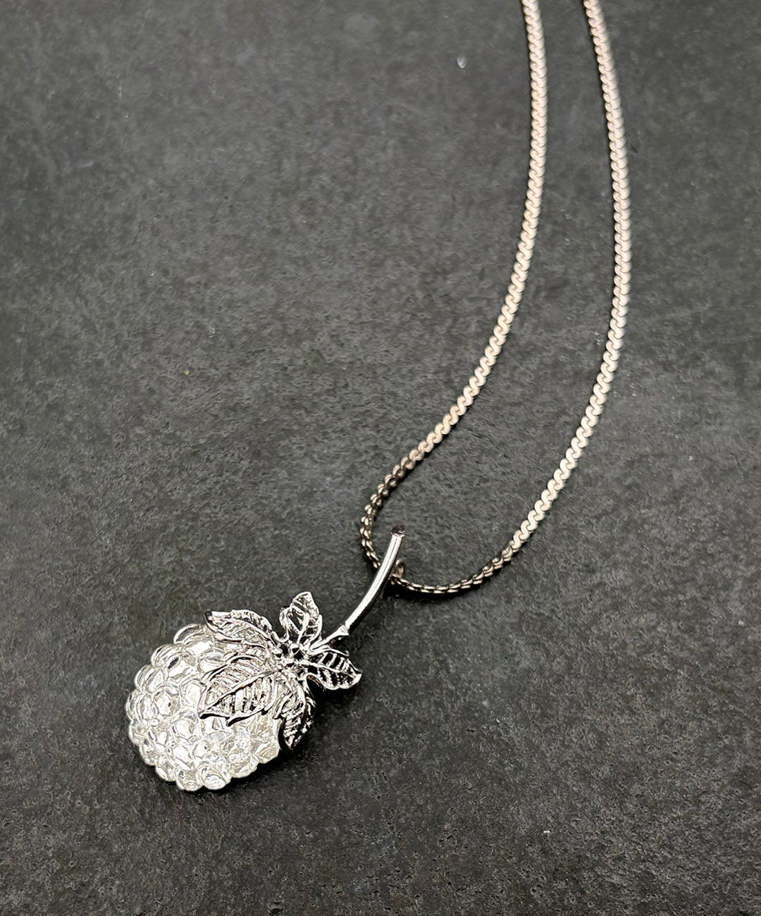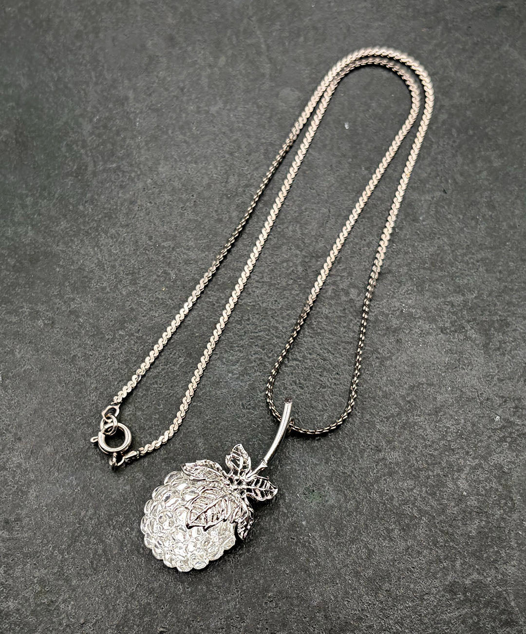 凛と煌めく滑らかなシルバートーンチェーンに、優美なオープンワークのリーフがあしらわれた、木苺モチーフのクリアガラスペンダントが通されています。
