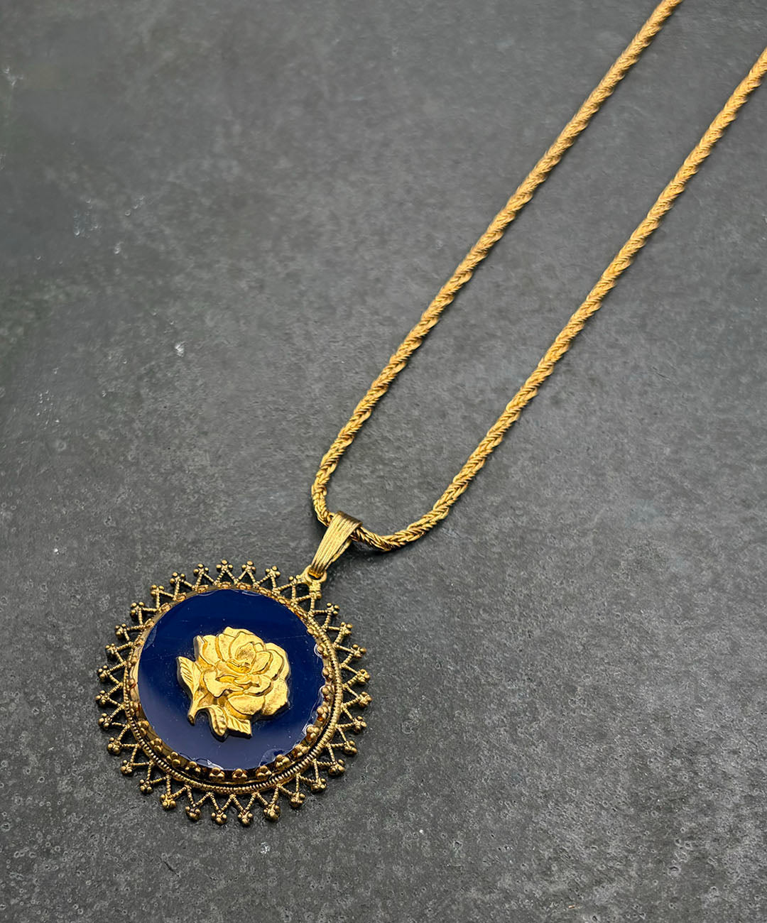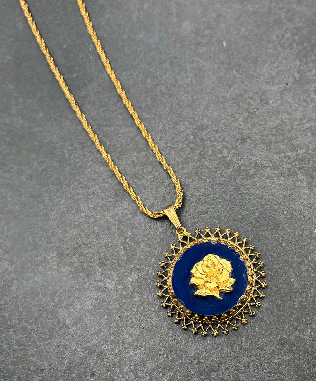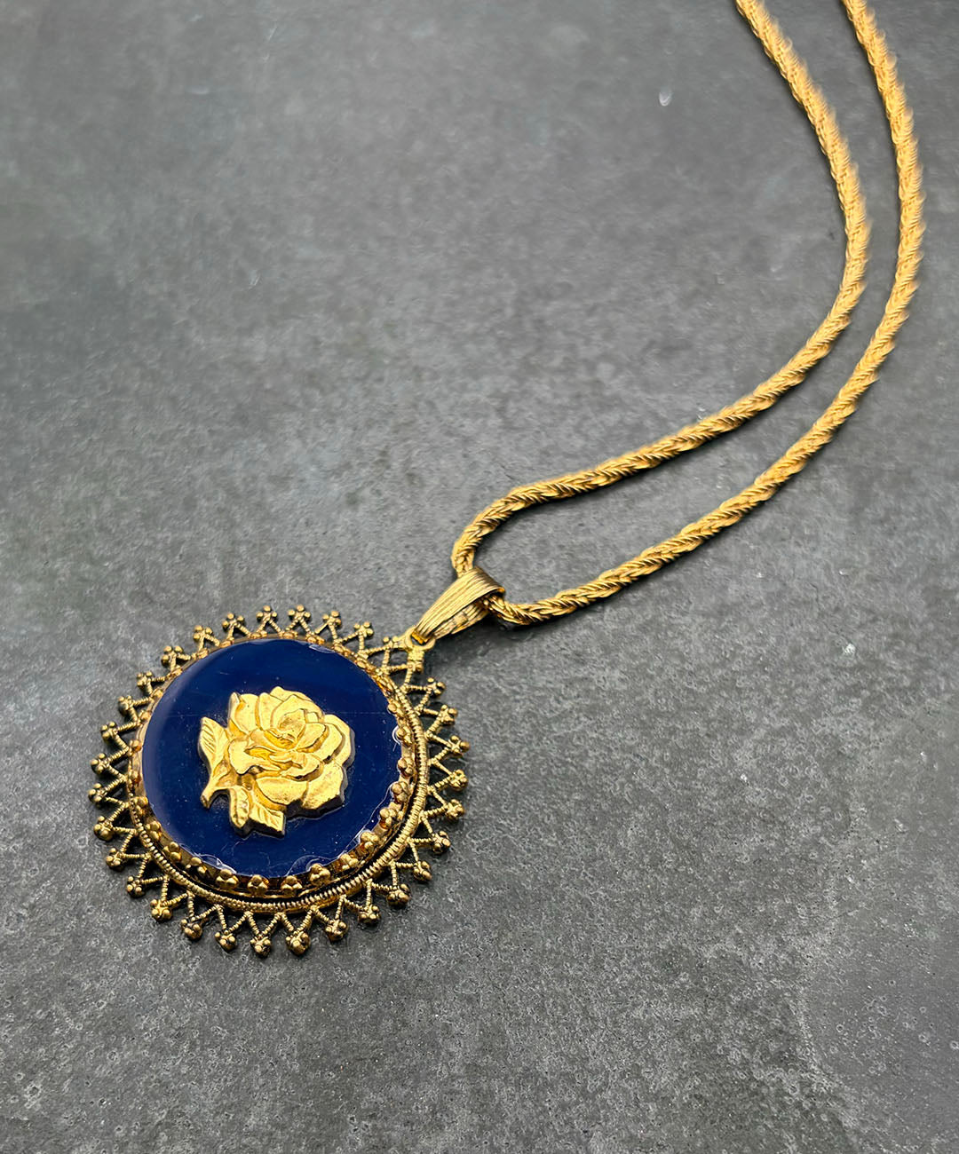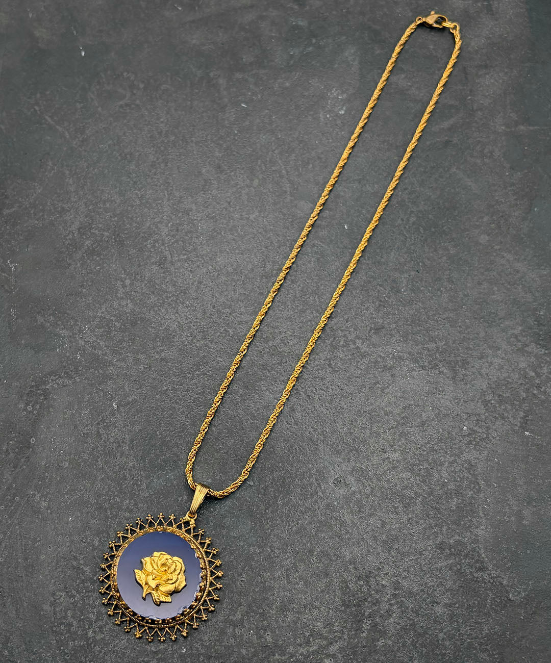 ゴールドトーンのロープチェーンに、マットゴールドのローズカメオがセットされたダークネイビーのガラスペンダントが通されています。