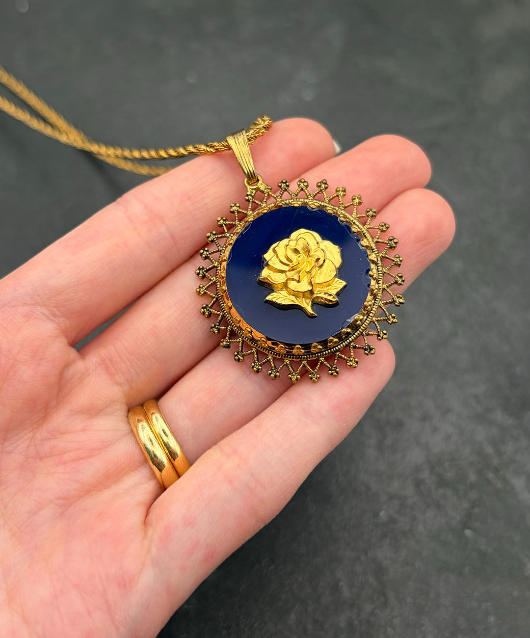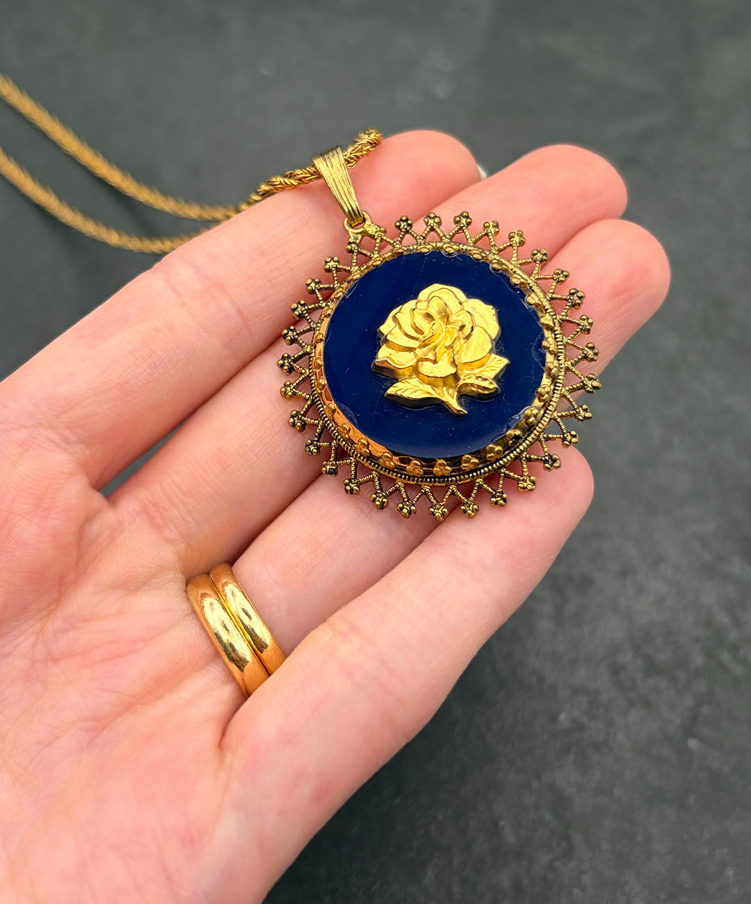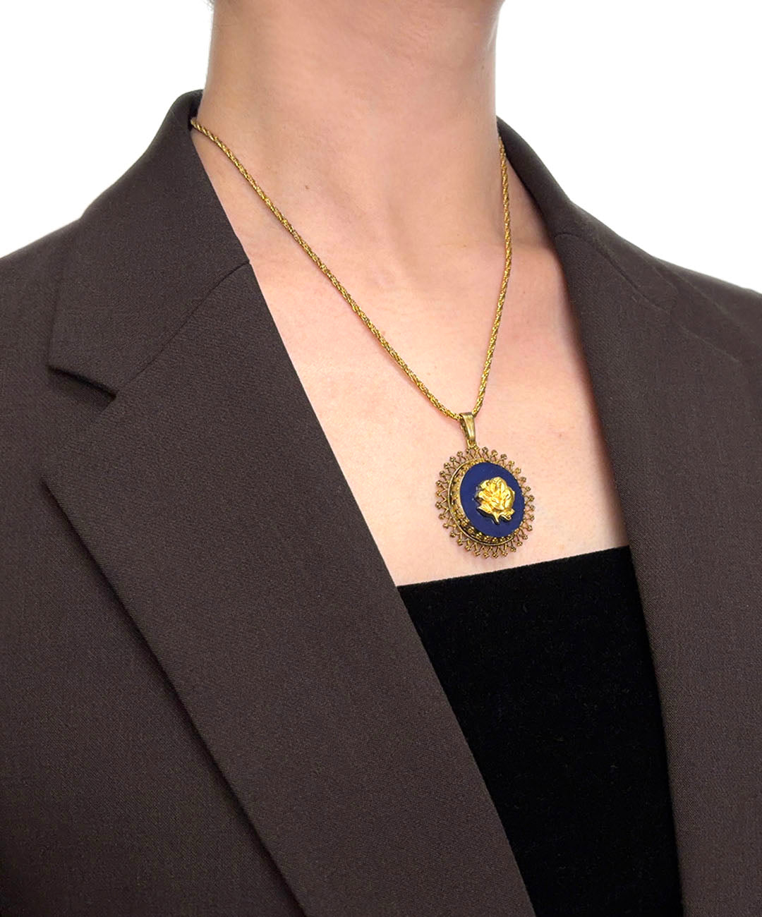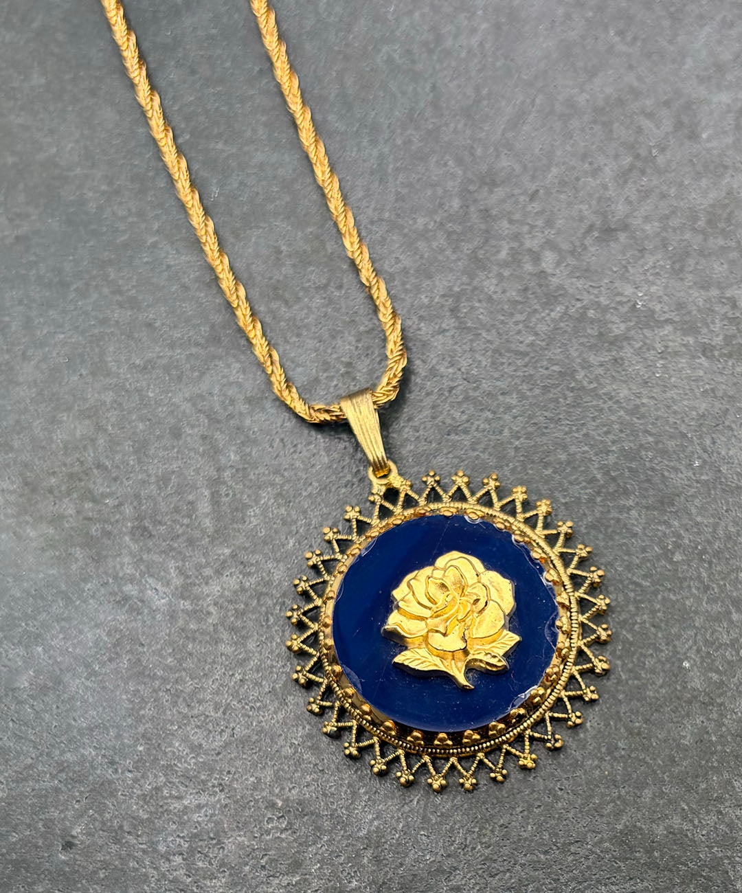ゴールドトーンのロープチェーンに、マットゴールドのローズカメオがセットされたダークネイビーのガラスペンダントが通されています。