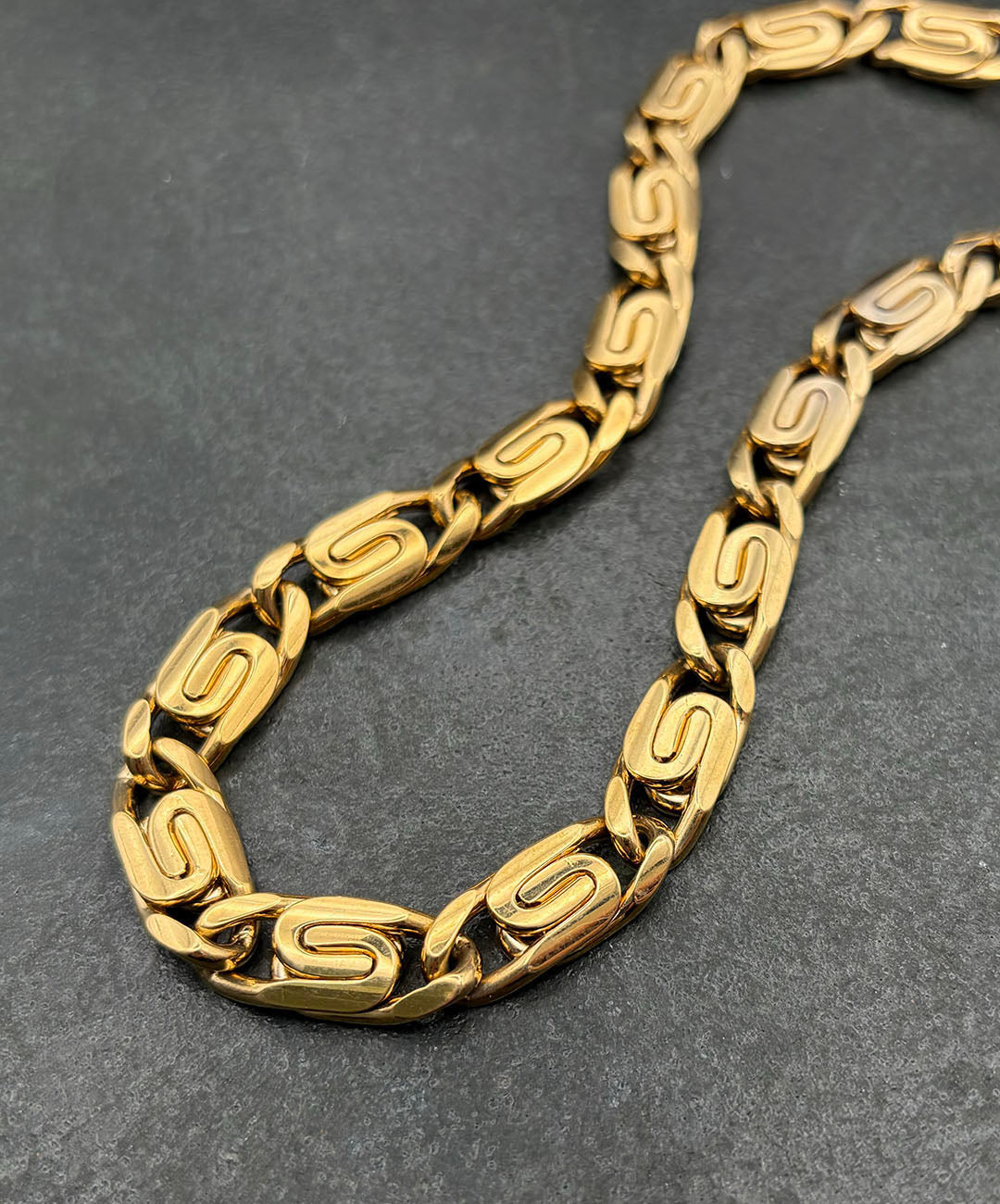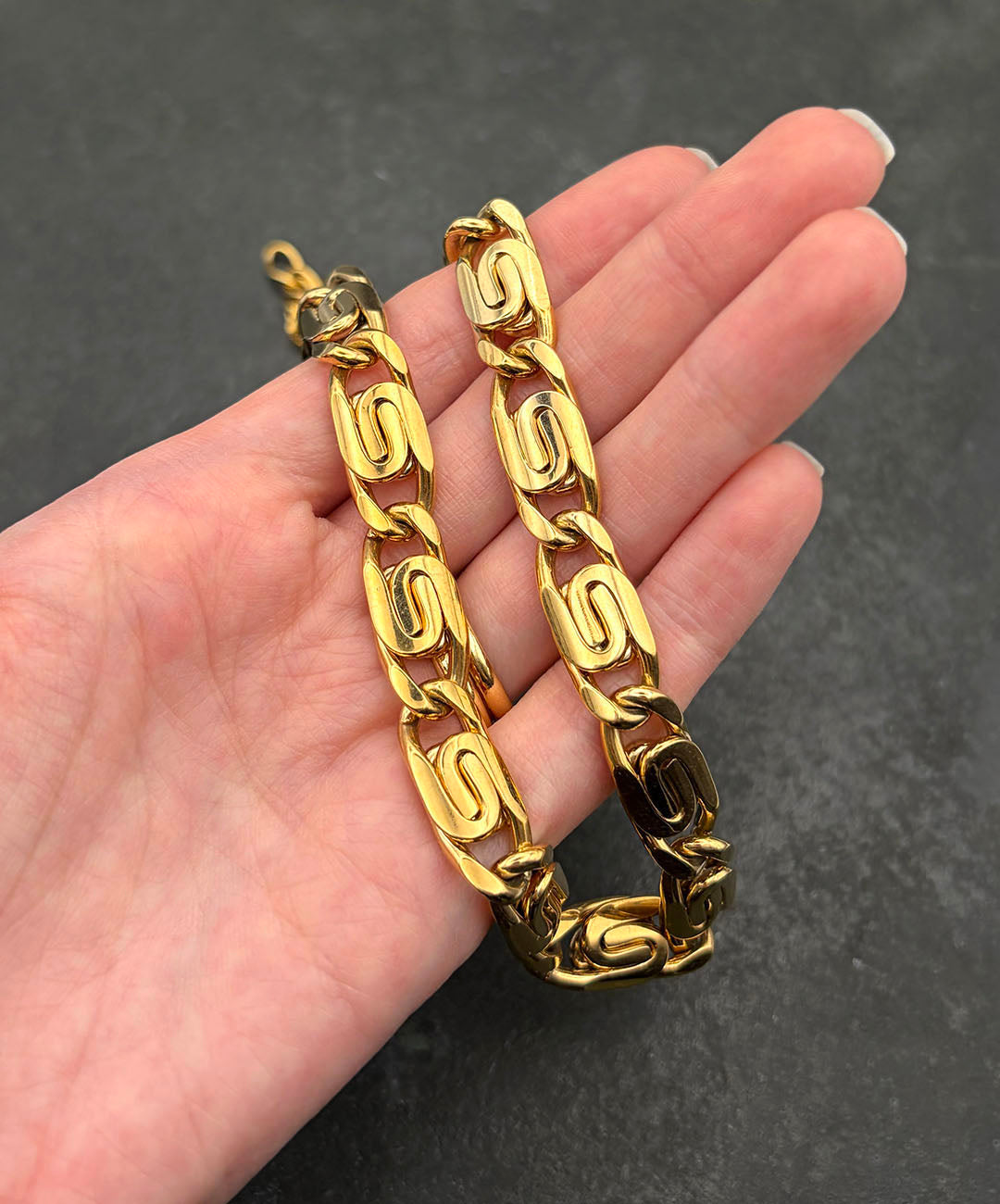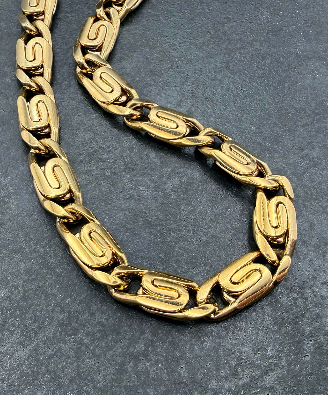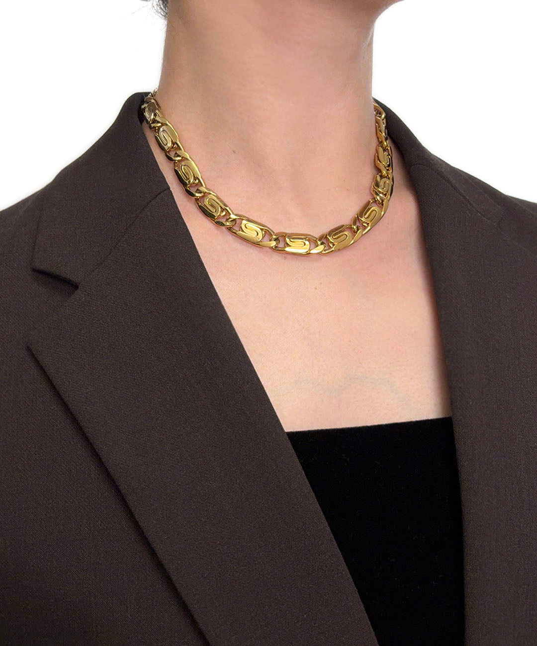 その名の通りペーパークリップの形状をした重厚感のあるゴールドトーンチェーンが連なる、インパクトのあるお品。