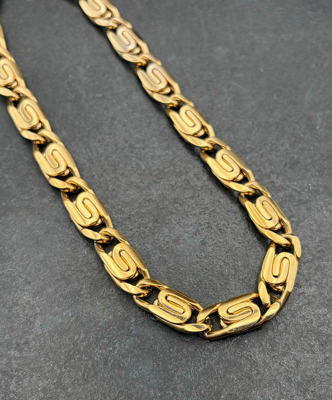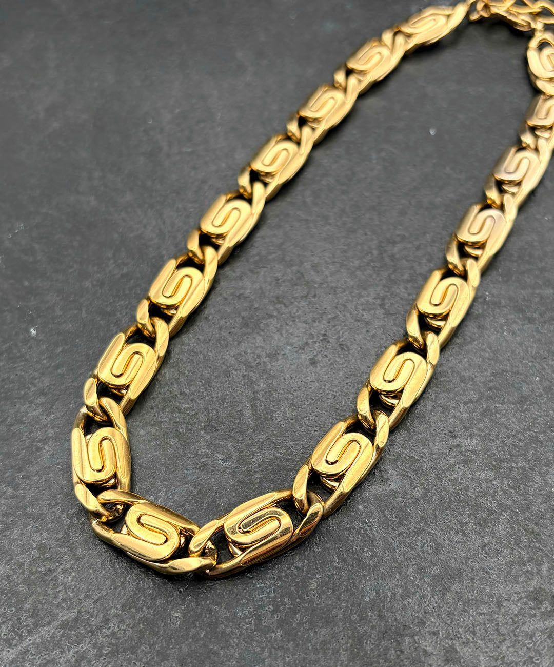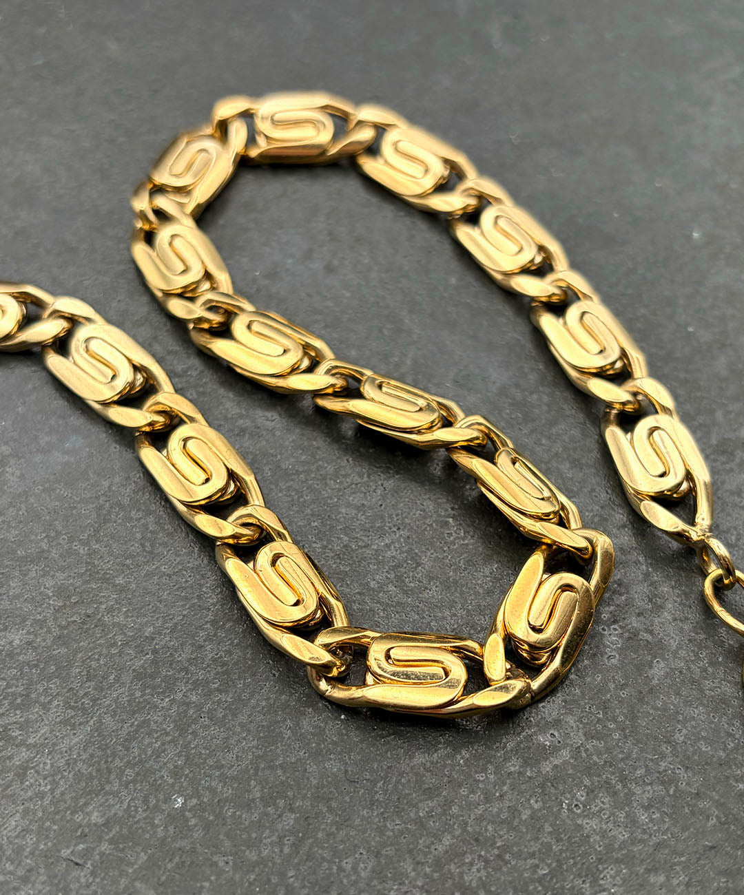 その名の通りペーパークリップの形状をした重厚感のあるゴールドトーンチェーンが連なる、インパクトのあるお品。