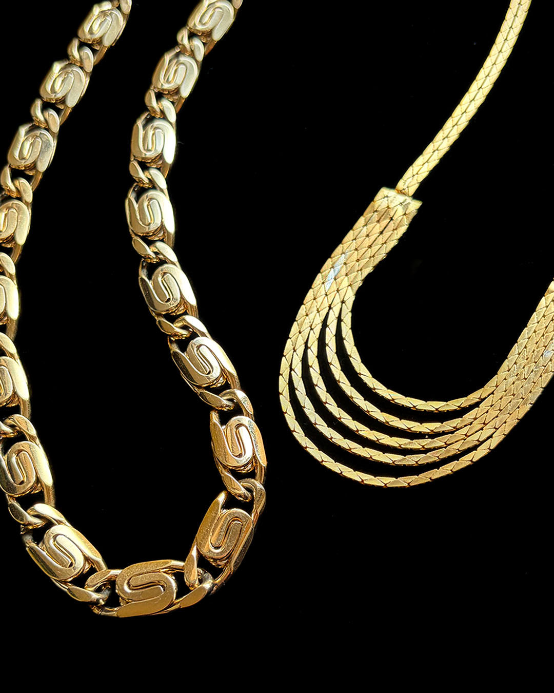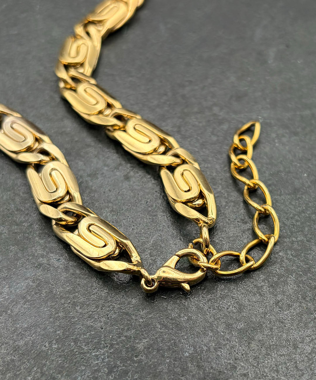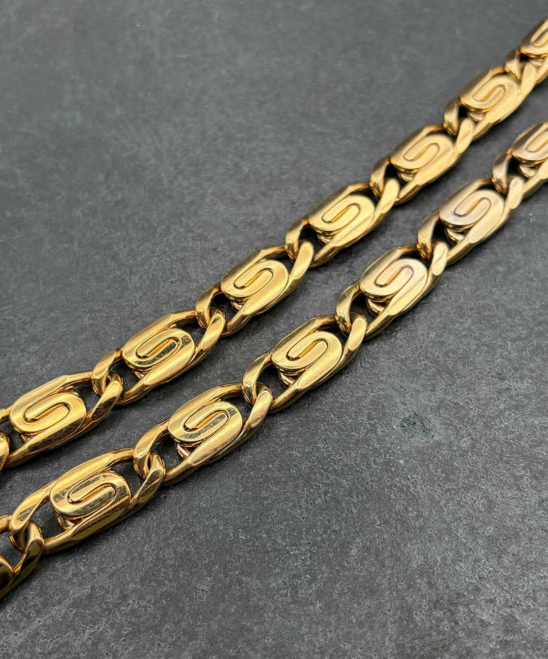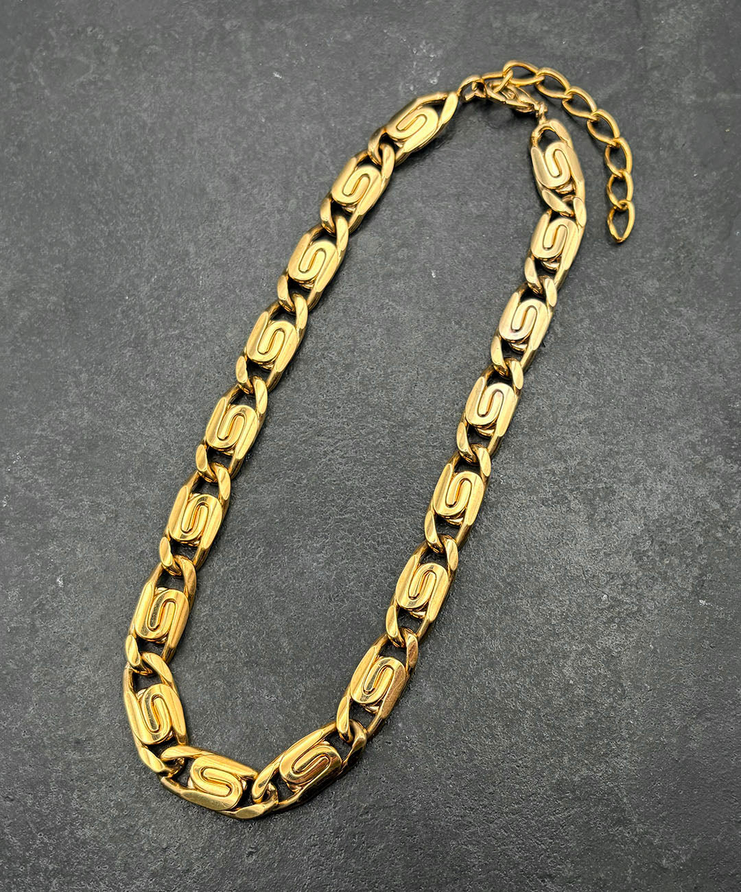その名の通りペーパークリップの形状をした重厚感のあるゴールドトーンチェーンが連なる、インパクトのあるお品。